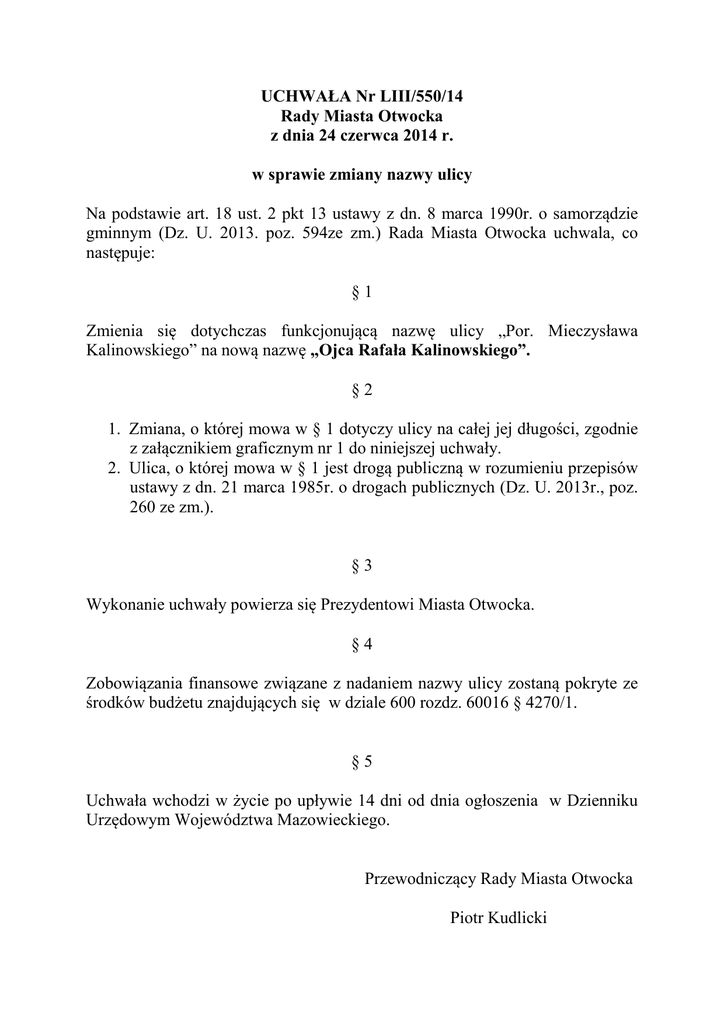 UCHWAŁA Nr LIII/550/14 Rady Miasta Otwocka z dnia 24 czerwca 2014 r. w sprawie zmiany nazwy ulicy Na podstawie art. 18 ust. 2 pkt 13 ustawy z dn. 8 marca 1990r. o samorządzie gminnym (Dz. U. 2013. poz. 594ze zm.) Rada Miasta Otwocka uchwala, co następuje: §1 Zmienia się dotychczas funkcjonującą nazwę ulicy „Por. Mieczysława Kalinowskiego” na nową nazwę „Ojca Rafała Kalinowskiego”. §2 1. Zmiana, o której mowa w § 1 dotyczy ulicy na całej jej długości, zgodnie z załącznikiem graficznym nr 1 do niniejszej uchwały. 2. Ulica, o której mowa w § 1 jest drogą publiczną w rozumieniu przepisów ustawy z dn. 21 marca 1985r. o drogach publicznych (Dz. U. 2013r., poz. 260 ze zm.). §3 Wykonanie uchwały powierza się Prezydentowi Miasta Otwocka. §4 Zobowiązania finansowe związane z nadaniem nazwy ulicy zostaną pokryte ze środków budżetu znajdujących się w dziale 600 rozdz. 60016 § 4270/1. §5 Uchwała wchodzi w życie po upływie 14 dni od dnia ogłoszenia w Dzienniku Urzędowym Województwa Mazowieckiego. Przewodniczący Rady Miasta Otwocka Piotr Kudlicki Uzasadnienie Występujące w Polsce, a także w Otwocku nazwy ulic, placów, skwerów i obiektów architektonicznych oraz pomniki, tablice i miejsca pamięci a także patronaty, imiona instytucji publicznych, są w swej istocie formą okazywania czci i szacunku. Por. Mieczysław Kalinowski - propagator antypaństwowych idei komunistycznych, nie jest postrzegany przez mieszkańców Otwocka jako odpowiedni patron godny upamiętnienia. Por. Mieczysław Kalinowski, pseudonim: Skrucha, Grzegorz, Żelazny, Aleksander Kruszyński, Klonowicz, Jan Kowalski, Marian, Fred (ur. 1907 r.- zm. 1943 r.) był nie tylko żołnierzem 1 Dywizji Piechoty Tadeusza Kościuszki ale przede wszystkim działaczem Komunistycznego Związku Młodzieży Polskiej, uczestnikiem (wraz z Lucjanem Szenwaldem) Międzynarodowego Kongresu Młodzieży w Brukseli, członkiem Sekretariatu KC Komunistycznego Związku Młodzieży Zachodniej Ukrainy. Podobnie jak inni komuniści w 1939 roku przedostał się na tereny okupowane przez Armię Czerwoną i we Lwowie współpracował z „Czerwonym Sztandarem” - polskojęzycznym sowieckim organem Komunistycznej Partii (bolszewików) Ukrainy, publikującym propagandowe stalinowskie artykuły. Proponowany nowy patron, Ojciec Rafał Kalinowski, jest wzorem patrioty, oficera, inżyniera, wychowawcy i kapłana - zakonnika, co zostało uznane i przyjęte uchwałą Senatu Rzeczpospolitej Polskiej z dnia 14 września 2007 roku. Stanowi to dla mieszkańców Otwocka dodatkowe potwierdzenie chęci uhonorowania jego osoby w naszym mieście. Rafał Kalinowski* (1835-1907) urodził się w Wilnie jako syn Andrzeja, profesora matematyki Uniwersytetu Wileńskiego i Józefy Płońskiej. Otrzymał na chrzcie imię Józef. Odznaczał się wyjątkowymi zdolnościami w nauce. W 1850 r. ukończył instytut szlachecki w Wilnie, a następnie przez dwa lata studiował agronomię w Hory-Horkach k. Orszy, lecz ten kierunek mu nie odpowiadał. W 1855 r. ukończył w Petersburgu carską Szkołę Inżynierii Wojskowej i przez cztery lata był tam wykładowcą matematyki i mechaniki budowlanej. W 1859 r. podjął pracę przy budowie kolei żelaznej Kursk – Odessa, ale z powodu złych warunków został na własną prośbę przeniesiony do Brześcia Litewskiego. W czasie powstania styczniowego służył wiedzą wojskową, pełniąc funkcję ministra wojny i członka Rządu Narodowego. Mawiał, iż „nie krwi, ale potu potrzebuje Polska”. Po upadku powstania został aresztowany i skazany na karę śmierci, która zamieniona została na 10 lat katorgi na Syberii. W czasie pobytu na Syberii promieniował pobożnością i dobrocią wobec bliźnich. Po ogłoszonej w 1868 r. amnestii od robót przymusowych osiedlił się w Irkucku. Na Syberii zaczął uczyć polskie dzieci katechizmu. Po powrocie do Wilna w 1874 r. był wychowawcą księcia Augusta Czartoryskiego, który został błogosławionym. W 1877 r. wstąpił do nowicjatu karmelitów bosych w Grazu w Austrii, przybierając imię Rafała od św. Józefa. Studia filozoficzne i teologiczne odbył w Raab na Węgrzech i w 1881 r. złożył śluby zakonne. Rok później w Czernej k. Krakowa otrzymał święcenia kapłańskie. Odznaczał się wielką gorliwością w życiu zakonnym i kapłańskim. Niestrudzenie oddawał się posłudze sakramentu pokuty i kierownictwu duchowemu. Zmarł w Wadowicach, a pochowany został w Czernej. Jan Paweł II beatyfikował ojca Rafała Kalinowskiego 22 czerwca 1983 r. na Błoniach krakowskich, a kanonizował w Rzymie 17 listopada 1991 r. Święto patronalne przypada 20 listopada. Jest patronem oficerów, żołnierzy, kolejarzy, Sybiraków i orędownikiem w sprawach trudnych i beznadziejnych. Źródła:http://www.gwiazdzi.linuxpl.info/dzieje-parafii/historia/ http://ww2.senat.pl/k6/dok/dr/spis11.htm Inicjatywa zmiany nazwy ulicy, została poparta 102 podpisami mieszkańców zamieszkałych przy ulicy Por. Mieczysława Kalinowskiego i okolicznych ulicach. Do propozycji nadania ulicy imienia Ojca Rafała Kalinowskiego pozytywnie ustosunkowała się także Pani Prezes Janina Marska przedstawicielka Związku Sybiraków Koła w Otwocku. Listy imienne z podpisami i adresami mieszkańców oraz pismo ze Związku Sybiraków zdeponowano w Biurze Rady Miasta Otwocka. Nadanie jednej z ulic Otwocka nazwy Ojca Rafała Kalinowskiego jest potwierdzeniem upowszechniania wartości: związanych z zachowaniem kultury narodowej, wychowawczooświatowych i moralnych. Zatem wszystkie powyższe informacje i materiały czynią proponowaną zmianę nazwy ulicy zasadną.