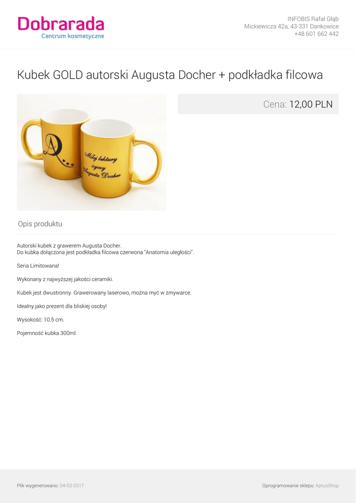 INFOBIS Rafał Głąb Mickiewicza 42a, 43-331 Dankowice +48 601 662 442 Kubek GOLD autorski Augusta Docher + podkładka filcowa Cena: 12,00 PLN Opis produktu Autorski kubek z grawerem Augusta Docher. Do kubka dołączona jest podkładka filcowa czerwona "Anatomia uległości". Seria Limitowana! Wykonany z najwyższej jakości ceramiki. Kubek jest dwustronny. Grawerowany laserowo, można myć w zmywarce. Idealny jako prezent dla bliskiej osoby! Wysokość: 10.5 cm. Pojemność kubka 300ml. Plik wygenerowano: 04-03-2017 Oprogramowanie sklepu: AptusShop INFOBIS Rafał Głąb Mickiewicza 42a, 43-331 Dankowice +48 601 662 442 Galeria Plik wygenerowano: 04-03-2017 Powered by TCPDF (www.tcpdf.org) Oprogramowanie sklepu: AptusShop