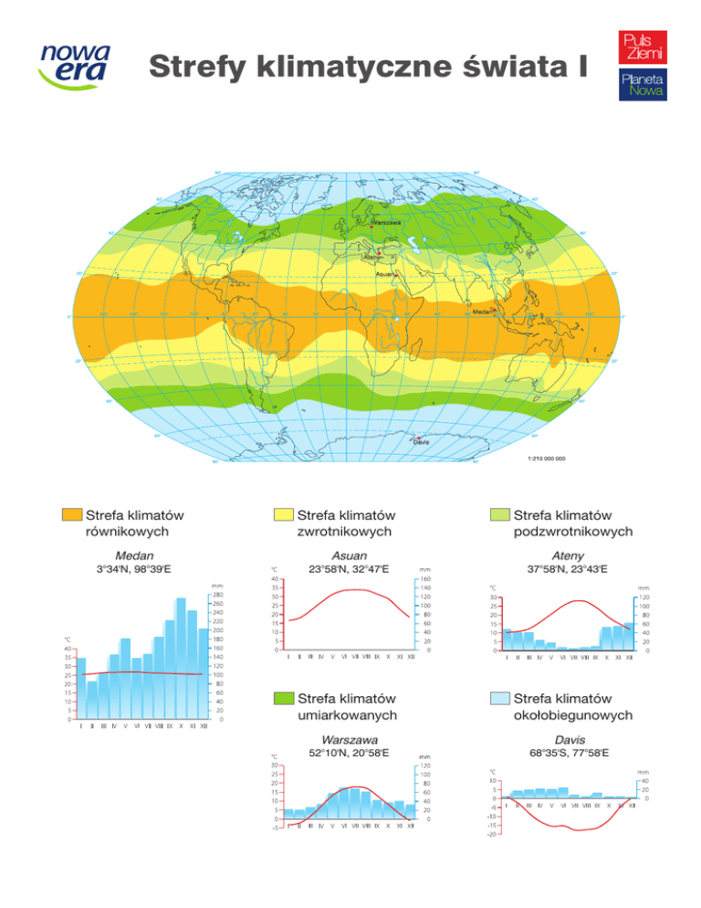 Strefy klimatyczne Êwiata I Strefa klimatów równikowych Strefa klimatów zwrotnikowych Strefa klimatów podzwrotnikowych Medan Asuan Ateny 3°34'N, 98°39'E 23°58'N, 32°47'E 37°58'N, 23°43'E Strefa klimatów umiarkowanych Strefa klimatów okołobiegunowych Warszawa Davis 52°10'N, 20°58'E 68°35'S, 77°58'E