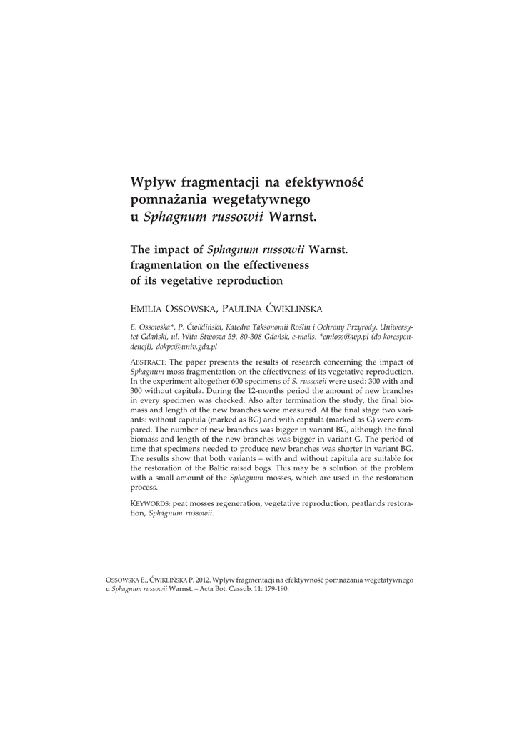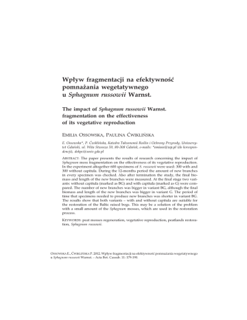 Wp³yw fragmentacji na efektywnoœæ pomna¿ania wegetatywnego u Sphagnum russowii Warnst. The impact of Sphagnum russowii Warnst. fragmentation on the effectiveness of its vegetative reproduction EMILIA OSSOWSKA, PAULINA ÆWIKLIÑSKA E. Ossowska*, P. Æwikliñska, Katedra Taksonomii Roœlin i Ochrony Przyrody, Uniwersytet Gdañski, ul. Wita Stwosza 59, 80-308 Gdañsk, e-mails: *[email protected] (do korespondencji), [email protected] ABSTRACT: The paper presents the results of research concerning the impact of Sphagnum moss fragmentation on the effectiveness of its vegetative reproduction. In the experiment altogether 600 specimens of S. russowii were used: 300 with and 300 without capitula. During the 12-months period the amount of new branches in every specimen was checked. Also after termination the study, the final biomass and length of the new branches were measured. At the final stage two variants: without capitula (marked as BG) and with capitula (marked as G) were compared. The number of new branches was bigger in variant BG, although the final biomass and length of the new branches was bigger in variant G. The period of time that specimens needed to produce new branches was shorter in variant BG. The results show that both variants – with and without capitula are suitable for the restoration of the Baltic raised bogs. This may be a solution of the problem with a small amount of the Sphagnum mosses, which are used in the restoration process. KEYWORDS: peat mosses regeneration, vegetative reproduction, peatlands restoration, Sphagnum russowii. OSSOWSKA E., ÆWIKLIÑSKA P. 2012. Wp³yw fragmentacji na efektywnoœæ pomna¿ania wegetatywnego u Sphagnum russowii Warnst. – Acta Bot. Cassub. 11: 179-190. 180 Emilia Ossowska, Paulina Æwikliñska Wprowadzenie Wydobycie torfu metod¹ mechanicznego frezowania prowadzi do powstania p³ytkich, zwykle przesuszonych pól poeksploatacyjnych (Herbichowa 2005). Stopieñ przekszta³cenia i sk³ad gatunkowy pokrywy roœlinnej, która rozwinê³a siê na takich powierzchniach, wskazuje na powolne tempo wtórnej kolonizacji. Szansa na samorzutne odtworzenie siê zniszczonej roœlinnoœci jest znikoma. Dlatego, aby zapobiec dalszej degradacji siedliska, a nastêpnie przywróciæ proces akumulacji torfu, niezbêdne jest zainicjowanie rozwoju warstwy mszystej budowanej przez torfowce (Quinty, Rochefort 2003; Herbichowa 2005; Æwikliñska, Herbichowa 2011). Mchy te stanowi¹ kluczowy sk³adnik torfowisk wysokich (Lubliner-Mianowska 1957; Clymo, Hayward 1982). Dziêki obecnoœci komórek hyalinowych s¹ one zdolne do magazynowania du¿ych iloœci wody, co z kolei wp³ywa na utrzymanie wilgotnoœci pod³o¿a. Ponadto obumar³e szcz¹tki torfowców akumuluj¹ siê w postaci torfu, a zawarty w ich œcianach kwas poliuronowy powoduje acydyfikacjê siedliska (Clymo, Hayward 1982; Tobolski 2003). Nowe osobniki u gatunków z rodzaju Sphagnum rozwijaj¹ siê zarówno w wyniku rozsiewania zarodników, jak i pomna¿ania wegetatywnego (Cronberg 1991). Pomna¿anie ma silniejszy wp³yw na rozwój i utrzymanie populacji torfowców, zw³aszcza na siedliskach, na których mchy te zosta³y zniszczone w wyniku ró¿nego rodzaju zaburzeñ (Campeau, Rochefort 1996; Sundberg 2000). Rozsiewanie zarodników jest z kolei istotne przy kolonizowaniu nowych siedlisk, wczeœniej niezajmowanych przez torfowce (Cronberg 1991). Regeneracja osobników nastêpuje w szczytowych czêœciach pêdu g³ównego oderwanego od ³odygi g³ównej, natomiast w przypadku zniszczenia szczytowych czêœci, np. w wyniku po¿aru, odga³êzienia powstaj¹ w dolnych partiach (Cronberg 1991). Ten typ propagacji wystêpuje u wszystkich gatunków z rodzaju Sphagnum, z wyj¹tkiem S. wulfianum (Lane 1977). Nowe odga³êzienia mog¹ tak¿e tworzyæ siê u osobników, które wczeœniej nie posiada³y pocz¹tkowej g³ówki (Baker, Boatman 1985; Poschlod, Pfadenhauer 1989; Rochefort, Gautier, Leguéré 1995), wówczas boczne ga³¹zki przejmuj¹ rolê g³ówki i zaczynaj¹ produkowaæ nowe odga³êzienia (Clymo, Hayward 1982). Efektywna produkcja nowych odga³êzieñ jest wiêc warunkiem trwania populacji torfowców w konkretnym miejscu. Metoda odtwarzania budowanej przez torfowce warstwy mszystej na zdegradowanych torfowiskach wysokich zosta³a opracowana w Kanadzie (Quinty, Rochefort 2003). Od 2006 roku jej zmodyfikowana forma jest testowana w Polsce na torfowisku Czarne Bagno w dolinie £eby (Herbichowa 2005, 2007). W Polsce istnieje problem pozyskania odpowiedniej iloœci materia³u do restytucji. Wyniki eksperymentu z Kanady pokazuj¹, ¿e pokrycie materia³em roœlinnym od 6 do 10% planowanej powierzchni zapewnia odtworzenie zwartej pokrywy torfowiskowej w ci¹gu 4 lat (Quinty, Rochefort 2003). Jednak obserwacje prowadzone na Czarnym Bagnie wskazuj¹, ¿e aby uzyskaæ po¿¹dane tempo Wp³yw fragmentacji na efektywnoœæ pomna¿ania wegetatywnego... 181 regeneracji torfowców nale¿a³oby zastosowaæ iloœæ materia³u pokrywaj¹c¹ 10% powierzchni. Jednym z mo¿liwych rozwi¹zañ tego problemu jest zastosowanie warstwy ¿ywych roœlin i zakumulowanej pod nim s³abo roz³o¿onej materii organicznej (tzw. wierzchnicy). Jednak mo¿e ona zawieraæ roœliny lub ich nasiona oraz zarodniki, które mog¹ stanowiæ konkurencjê dla torfowców. W zwi¹zku z tym rozwa¿a siê mo¿liwoœæ dzielenia pêdów na mniejsze fragmenty pozbawione g³ówki (Quinty, Rochefort 2003; Herbichowa i in. 2009; Æwikliñska, Herbichowa 2011). Opisany poni¿ej eksperyment mia³ na celu sprawdzenie skutecznoœci tej metody. W badaniach wykorzystano Sphagnum russowii. Gatunek ten wystêpuje w ca³ej Polsce. Preferuje on siedliska wilgotne o odczynie od pH=3 do pH=6, znosi cieñ oraz toleruje okresowe przesuszenie (Lubliner-Mianowska 1957). Jest to jednak gatunek s³abo poznany pod k¹tem skutecznoœci pomna¿ania wegetatywnego. Dane literaturowe dotycz¹ takich gatunków, jak: S. palustre, S. capillifolium oraz S. cuspidatum (Sobot