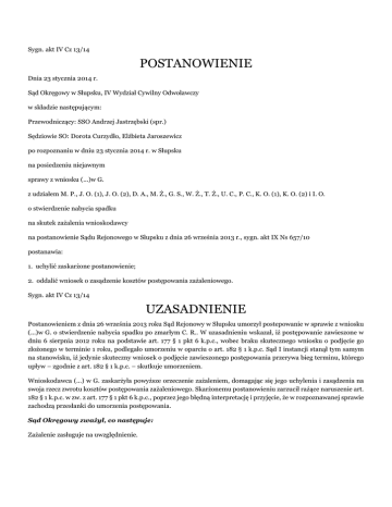 Sygn. akt IV Cz 13/14 POSTANOWIENIE Dnia 23 stycznia 2014 r. Sąd Okręgowy w Słupsku, IV Wydział Cywilny Odwoławczy w składzie następującym: Przewodniczący: SSO Andrzej Jastrzębski (spr.) Sędziowie SO: Dorota Curzydło, Elżbieta Jaroszewicz po rozpoznaniu w dniu 23 stycznia 2014 r. w Słupsku na posiedzeniu niejawnym sprawy z wniosku (...)w G. z udziałem M. P., J. O. (1), J. O. (2), D. A., M. Ż., G. S., W. Ż., T. Ż., U. C., P. C., K. O. (1), K. O. (2) i I. O. o stwierdzenie nabycia spadku na skutek zażalenia wnioskodawcy na postanowienie Sądu Rejonowego w Słupsku z dnia 26 września 2013 r., sygn. akt IX Ns 657/10 postanawia: 1. uchylić zaskarżone postanowienie; 2. oddalić wniosek o zasądzenie kosztów postępowania zażaleniowego. Sygn. akt IV Cz 13/14 UZASADNIENIE Postanowieniem z dnia 26 września 2013 roku Sąd Rejonowy w Słupsku umorzył postepowanie w sprawie z wniosku (...)w G. o stwierdzenie nabycia spadku po zmarłym C. R.. W uzasadnieniu wskazał, iż postępowanie zawieszone w dniu 6 sierpnia 2012 roku na podstawie art. 177 § 1 pkt 6 k.p.c., wobec braku skutecznego wniosku o podjęcie go złożonego w terminie 1 roku, podlegało umorzeniu w oparciu o art. 182 § 1 k.p.c. Sąd I instancji stanął tym samym na stanowisku, iż jedynie skuteczny wniosek o podjęcie zawieszonego postępowania przerywa bieg terminu, którego upływ – zgodnie z art. 182 § 1 k.p.c. – skutkuje umorzeniem. Wnioskodawca (...) w G. zaskarżyła powyższe orzeczenie zażaleniem, domagając się jego uchylenia i zasądzenia na swoja rzecz zwrotu kosztów postępowania zażaleniowego. Skarżonemu postanowieniu zarzucił rażące naruszenie art. 182 § 1 k.p.c. w zw. z art. 177 § 1 pkt 6 k.p.c., poprzez jego błędną interpretację i przyjęcie, że w rozpoznawanej sprawie zachodzą przesłanki do umorzenia postępowania. Sąd Okręgowy zważył, co następuje: Zażalenie zasługuje na uwzględnienie. Kluczowe dla rozstrzygnięcia rozpoznawanej sprawy było ustalenie, czy bieg terminu wyrażonego w art. 182 § 1 k.p.c. przerywa każdy wniosek o podjęcie zawieszonego zgodnie z art. 177 § 1 pkt 5 i 6 k.p.c. postępowania, czy jedynie taki wniosek, który okazał się skuteczny. W myśl art. 182 § 1 zdanie pierwsze k.p.c., Sąd umarza postępowanie zawieszone na zgodny wniosek stron lub na wniosek spadkobiercy, jak również z przyczyn wskazanych w art. 177 § 1 pkt 5 i 6, jeżeli wniosek o podjęcie postępowania nie został zgłoszony w ciągu roku od daty postanowienia o zawieszeniu. Zgodnie ze stanowiskiem Sądu Najwyższego wyrażonym w uzasadnieniu postanowienia z dnia 21 października 2010 roku (sygn. IV CSK 122/10 – za pośrednictwem Systemu Informacji Prawnej Legalis), nie jest prawidłowe założenie, że wniosek o podjęcie postępowania powinien łączyć się z usunięciem przeszkody procesowej, która legła u podstaw postanowienia o zawieszeniu postępowania. Założenie takie nie może być uznane za prawidłowe, ponieważ prowadzi do nieuprawnionej rozszerzającej wykładni art. 182 § 1 zd. 1 k.p.c. Z dyspozycji tego przepisu w sposób jednoznaczny wynika, że obligatoryjne umorzenie postępowania, uprzednio zawieszonego z którejkolwiek przyczyny wskazanej w art. 177 § 1 pkt 5 i 6 k.p.c., następuje w sytuacji, w której wniosek o podjęcie postępowania nie został zgłoszony w ciągu roku, a poprzednio w ciągu lat trzech, od daty postanowienia o zawieszeniu. Ustawodawca nie wymaga przy tym, by wniosek o podjęcie postępowania był wnioskiem skutecznym, gdyż jako przyczyny umorzenia zawieszonego postępowania wskazuje jedynie brak wniosku o jego podjęcie i upływ czasu. Sąd II instancji w pełni podzielił powyższe stanowisko uznając, iż złożony przez wnioskodawcę w dniu 8 stycznia 2013 roku wniosek o podjęcie zawieszonego postępowania (k. 265), mimo iż nie został przez Sąd Rejonowy uwzględniony (k. 285-286), to jednak przerwał bieg terminu wyrażonego w art. 182 § 1 zd. 1 k.p.c. Tym samym umorzenie postępowania w dacie wydania skarżonego postanowienia w oparciu o przepis art. 182 § 1 zd. 1 k.p.c. okazało się niedopuszczalne. Z uwagi na powyższe Sąd Okręgowy, na podstawie art. 386 § 1 k.p.c. w zw. z art. 397 § 2 k.p.c., uchylił zaskarżone postanowienie (punkt 1 sentencji). Zgodnie z dyspozycją art. 108 § 1 k.p.c., Sąd rozstrzyga o kosztach w każdym orzeczeniu kończącym sprawę w instancji, jednakże postanowienie w niniejszej sprawie jest postanowieniem li tylko incydentalnym, nie kończącym sprawy w instancji. Z tego też względu należało uznać żądanie przyznania kosztów postępowania zażaleniowego za przedwczesne, a w konsekwencji podlegające oddaleniu (punkt 2 sentencji).