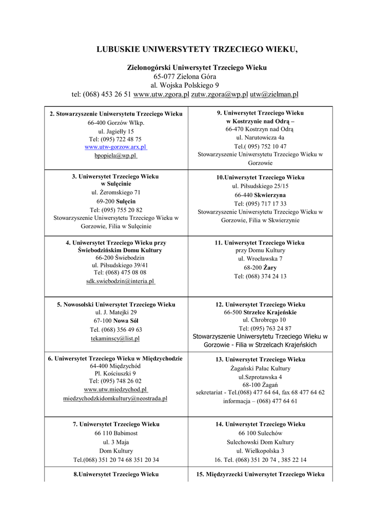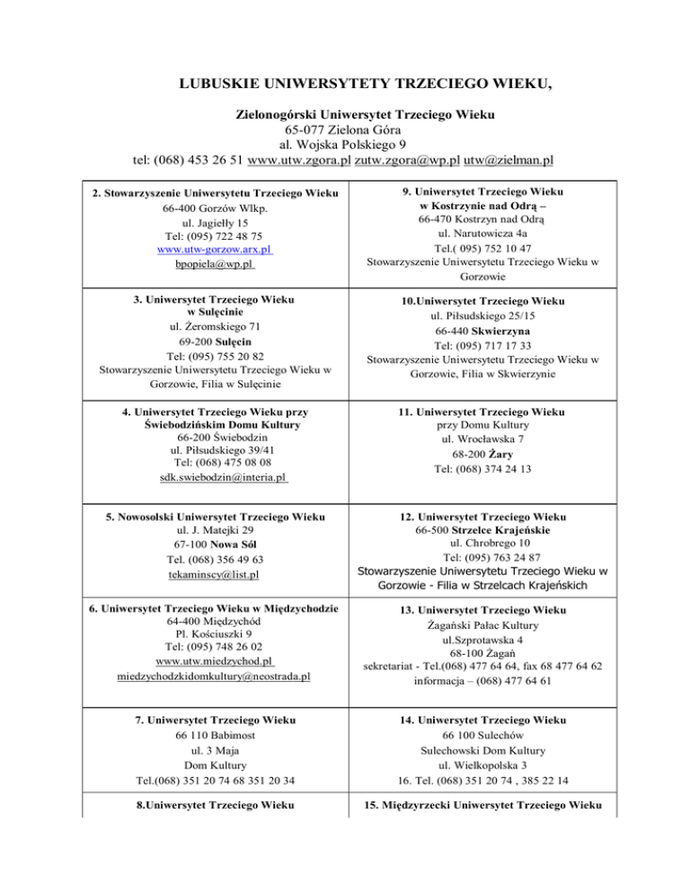 LUBUSKIE UNIWERSYTETY TRZECIEGO WIEKU, Zielonogórski Uniwersytet Trzeciego Wieku 65-077 Zielona Góra al. Wojska Polskiego 9 tel: (068) 453 26 51 www.utw.zgora.pl [email protected] [email protected] 2. Stowarzyszenie Uniwersytetu Trzeciego Wieku 66-400 Gorzów Wlkp. ul. Jagiełły 15 Tel: (095) 722 48 75 www.utw-gorzow.arx.pl [email protected] 9. Uniwersytet Trzeciego Wieku w Kostrzynie nad Odrą – 66-470 Kostrzyn nad Odrą ul. Narutowicza 4a Tel.( 095) 752 10 47 Stowarzyszenie Uniwersytetu Trzeciego Wieku w Gorzowie 3. Uniwersytet Trzeciego Wieku w Sulęcinie ul. Żeromskiego 71 69-200 Sulęcin Tel: (095) 755 20 82 Stowarzyszenie Uniwersytetu Trzeciego Wieku w Gorzowie, Filia w Sulęcinie 10.Uniwersytet Trzeciego Wieku ul. Piłsudskiego 25/15 66-440 Skwierzyna Tel: (095) 717 17 33 Stowarzyszenie Uniwersytetu Trzeciego Wieku w Gorzowie, Filia w Skwierzynie 4. Uniwersytet Trzeciego Wieku przy Świebodzińskim Domu Kultury 66-200 Świebodzin ul. Piłsudskiego 39/41 Tel: (068) 475 08 08 [email protected] 11. Uniwersytet Trzeciego Wieku przy Domu Kultury ul. Wrocławska 7 68-200 Żary Tel: (068) 374 24 13 5. Nowosolski Uniwersytet Trzeciego Wieku ul. J. Matejki 29 67-100 Nowa Sól Tel. (068) 356 49 63 [email protected] 12. Uniwersytet Trzeciego Wieku 66-500 Strzelce Krajeńskie ul. Chrobrego 10 Tel: (095) 763 24 87 Stowarzyszenie Uniwersytetu Trzeciego Wieku w Gorzowie - Filia w Strzelcach Krajeńskich 6. Uniwersytet Trzeciego Wieku w Międzychodzie 64-400 Międzychód Pl. Kościuszki 9 Tel: (095) 748 26 02 www.utw.miedzychod.pl [email protected] 13. Uniwersytet Trzeciego Wieku Żagański Pałac Kultury ul.Szprotawska 4 68-100 Żagań sekretariat - Tel.(068) 477 64 64, fax 68 477 64 62 informacja – (068) 477 64 61 7. Uniwersytet Trzeciego Wieku 66 110 Babimost ul. 3 Maja Dom Kultury Tel.(068) 351 20 74 68 351 20 34 14. Uniwersytet Trzeciego Wieku 66 100 Sulechów Sulechowski Dom Kultury ul. Wielkopolska 3 16. Tel. (068) 351 20 74 , 385 22 14 8.Uniwersytet Trzeciego Wieku 15. Międzyrzecki Uniwersytet Trzeciego Wieku 64 220 Kargowa Wojnowo 7 a Dom Kultury Tel. (068)352 50 23 INNE Towarzystwo Uniwersytetu Trzeciego Wieku 61-816 Poznań ul. Ratajczaka 37 Tel. 0 61 851 00 36 www.utw.poznan.pl Stowarzyszenie UTW 70-546 Szczecin ul. Mariacka 10A/2 Tel: (091) 812 39 75 [email protected] [email protected] Uniwersytet Trzeciego Wieku w Uniwersytecie Wrocławskim 50-524 Wrocław ul. Dawida 1/3 Tel: (071) 367 01 16 [email protected] Polkowicki Uniwersytet Trzeciego Wieku 59- 100 Polkowice Ul. Skarbników 4 Tel. 0 76 845 03 03 www.utw.pl/link_domy Głogowski Uniwersytet Trzeciego Wieku 67-200 Głogów ul. Sikorskiego 21 Tel: 76 727 2552 – tel. kom. Prezes GUTW (zmiana adresu) www.free.ngo.pl/gutw/ [email protected] Legnicki Uniwersytet Trzeciego Wieku Centrum Kształcenia Ustawicznego 59-220 Legnica ul. Lotnicza 26 Tel. 0 76 852 42 46 fax 8560 811 [email protected]