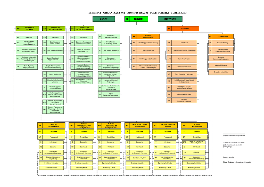 SCHEMAT ORGANIZACYJNY ADMINISTRACJI POLITECHNIKI LUBELSKIEJ SENAT RN PROREKTOR DS. NAUKI RD PROREKTOR DS. STUDENCKICH RN Sekretariat RD Sekretariat RP Sekretariat NZ Biuro Współpracy z Zagranicą i Badań Naukowych DN Dział Nauczania i Toku Studiów PC NB Biblioteka Politechniki Lubelskiej - Dyrektor DB Dział Spraw Studenckich NBA Biblioteka Politechniki Lubelskiej - Stanowiska administracyjne NW Biuro Wymiany Międzynarodowej RP R REKTOR Z KONWENT PROREKTOR DS. ROZWOJU UCZELNI RA RS Stanowisko Sekretarza Rektora AF Kwestor, Z-ca Kanclerza Centrum Informatyczne Politechniki Lubelskiej RB Biuro Rektora i Organizacji Uczelni FF Dział Księgowości Finansowej RA PH Sekcja ds. BHP oraz Ochrony P.Poż. RO Dział Spraw Osobowych FR Dział Rachuby Płac Zespół Świadczeń Stypendialnych PZ Centrum Innowacji i Zaawansowanych Technologii Politechniki Lubelskiej RR Stanowisko Radcy Prawnego FK Zespół Wspomagania Działalności Studenckiej PT Lubelskie Centrum Transferu Technologii Politechniki Lubelskiej RF Stanowisko Audytora Wewnętrznego FE KANCLERZ AT Z-ca Kanclerza Sekretariat TT Dział Techniczny AG Dział Administracyjno-Gospodarczy TI Sekcja Nadzoru Inwestycji i Remontów Dział Księgowości Kosztów AGK Kancelaria Uczelni Stanowisko ds. Planowania i Analiz Ekonomicznych AA Archiwum Zakładowe Brygada Remontowo-Budowlana Brygada Elektryków Brygada Hydraulików DS Domy Studenckie PI Lubelski Inkubator Przedsiębiorczości Politechniki Lubelskiej RI Stanowisko Pełnomocnika ds. Ochrony Informacji Niejawnych AP Biuro Zamówień Publicznych DK Biuro Karier Politechniki Lubelskiej PR Biuro Rozwoju, Promocji i Kooperacji Politechniki Lubelskiej RIN Kancelaria Informacji Niejawnych AZ Dział Gospodarki Materiałowej i Zaopatrzenia SJ Studium Języków Obcych - Kierownik RT Stanowisko ds. Planowania Obronnego i Bezpieczeństwa AB Sekcja Spraw SocjalnoBytowych Pracowników SJA Studium Języków Obcych - Stanowiska administracyjne RW Biuro Rzecznika Patentowego AI Sekcja Inwentaryzacji Studium Wychowania Fizycznego i Sportu - Kierownik AM DW Muzeum Politechniki Lubelskiej DWA Studium Wychowania Fizycznego i Sportu Stanowiska administracyjne WM WYDZIAŁ MECHANICZNY WE WYDZIAŁ ELEKTROTECHNIKI I INFORMATYKI WB WYDZIAŁ BUDOWNICTWA I ARCHITEKTURY WŚ WYDZIAŁ INŻYNIERII ŚRODOWISKA WT WYDZIAŁ PODSTAW TECHNIKI WZ WYDZIAŁ ZARZĄDZANIA M DZIEKAN E DZIEKAN B DZIEKAN Ś DZIEKAN T DZIEKAN Z DZIEKAN MP Prodziekani EP Prodziekani BP Prodziekani ŚP Prodziekani TP Prodziekani ZP Prodziekani podporządkowanie bezpośrednie M Sekretariat E Sekretariat B Sekretariat Ś Sekretariat T Sekretariat ZPO Zespół ds. Technicznej Obsługi Wydziału MD Dziekanat ED Dziekanat BD Dziekanat ŚD Dziekanat TD Dziekanat Z Sekretariat MF Stanowisko ds.Gospodarki Finansowej EF Stanowisko ds.Gospodarki Finansowej BF Stanowisko ds.Gospodarki Finansowej ŚF Stanowisko ds.Gospodarki Finansowej TF Stanowisko ds.Gospodarki Finansowej ZD Dziekanat MA Dział AdministracyjnoGospodarczy EA Dział AdministracyjnoGospodarczy BA Dział AdministracyjnoGospodarczy ŚO Dział Obsługi Wydziału TA Dział AdministracyjnoGospodarczy ZF Stanowisko ds.Gospodarki Finansowej Dyrektorzy Instytutów Dyrektorzy Instytutów Dyrektorzy Instytutów Dyrektorzy Instytutów Dyrektorzy Instytutów Dyrektorzy Instytutów Kierownicy Katedr Kierownicy Katedr Kierownicy Katedr Kierownicy Katedr Kierownicy Katedr Kierownicy Katedr podporządkowanie pośrednie (koordynacja) Opracowanie: Biuro Rektora i Organizacji Uczelni Stan na: 20.04.2011 r.
