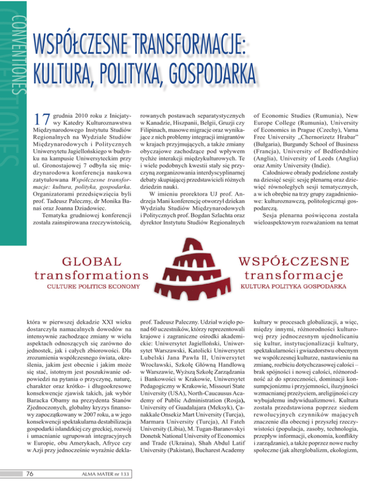 CONVENTIONES WSPÓŁCZESNE TRANSFORMACJE: KULTURA, POLITYKA, GOSPODARKA 17 grudnia 2010 roku z Inicjatywy Katedry Kulturoznawstwa Międzynarodowego Instytutu Studiów Regionalnych na Wydziale Studiów Międzynarodowych i Politycznych Uniwersytetu Jagiellońskiego w budynku na kampusie Uniwersyteckim przy ul. Gronostajowej 7 odbyła się międzynarodowa konferencja naukowa zatytułowana Współczesne transformacje: kultura, polityka, gospodarka. Organizatorami przedsięwzięcia byli prof. Tadeusz Paleczny, dr Monika Banaś oraz Joanna Dziadowiec. Tematyka grudniowej konferencji została zainspirowana rzeczywistością, rowanych postawach separatystycznych w Kanadzie, Hiszpanii, Belgii, Gruzji czy Filipinach, masowe migracje oraz wynikające z nich problemy integracji imigrantów w krajach przyjmujących, a także zmiany obyczajowe zachodzące pod wpływem tychże interakcji międzykulturowych. Te i wiele podobnych kwestii stały się przyczyną zorganizowania interdyscyplinarnej debaty skupiającej przedstawicieli różnych dziedzin nauki. W imieniu prorektora UJ prof. Andrzeja Mani konferencję otworzył dziekan Wydziału Studiów Międzynarodowych i Politycznych prof. Bogdan Szlachta oraz dyrektor Instytutu Studiów Regionalnych of Economic Studies (Rumunia), New Europe College (Rumunia), University of Economics in Prague (Czechy), Varna Free University „Chernorizetz Hrabar” (Bułgaria), Burgundy School of Business (Francja), University of Bedfordshire (Anglia), University of Leeds (Anglia) oraz Amity University (Indie). Całodniowe obrady podzielone zostały na dziesięć sesji: sesję plenarną oraz dziewięć równoległych sesji tematycznych, a w ich obrębie na trzy grupy zagadnieniowe: kulturoznawczą, politologicznąi gospodarczą. Sesja plenarna poświęcona została wieloaspektowym rozważaniom na temat która w pierwszej dekadzie XXI wieku dostarczyła namacalnych dowodów na intensywnie zachodzące zmiany w wielu aspektach odnoszących się zarówno do jednostek, jak i całych zbiorowości. Dla zrozumienia współczesnego świata, określenia, jakim jest obecnie i jakim może się stać, istotnym jest poszukiwanie odpowiedzi na pytania o przyczynę, naturę, charakter oraz krótko- i długookresowe konsekwencje zjawisk takich, jak wybór Baracka Obamy na prezydenta Stanów Zjednoczonych, globalny kryzys finansowy zapoczątkowany w 2007 roku, a w jego konsekwencji spektakularna destabilizacja gospodarki islandzkiej czy greckiej, rozwój i umacnianie ugrupowań integracyjnych w Europie, obu Amerykach, Afryce czy w Azji przy jednocześnie wyraźnie dekla- prof. Tadeusz Paleczny. Udział wzięło ponad 60 uczestników, którzy reprezentowali krajowe i zagraniczne ośrodki akademickie: Uniwersytet Jagielloński, Uniwersytet Warszawski, Katolicki Uniwersytet Lubelski Jana Pawła II, Uniwersytet Wrocławski, Szkołę Główną Handlową w Warszawie, Wyższą Szkołę Zarządzania i Bankowości w Krakowie, Uniwersytet Pedagogiczny w Krakowie, Missouri State University (USA), North-Caucausus Academy of Public Administration (Rosja), University of Guadalajara (Meksyk), Çanakkale Onsekiz Mart University (Turcja), Marmara University (Turcja), Al Fateh University (Libia), M. Tugan-Baranovskyi Donetsk National University of Economics and Trade (Ukraina), Shah Abdul Latif University (Pakistan), Bucharest Academy kultury w procesach globalizacji, a więc, między innymi, różnorodności kulturowej przy jednoczesnym ujednolicaniu się kultur, instytucjonalizacji kultury, spektakularności i gwiazdorstwu obecnym we współczesnej kulturze, nastawieniu na zmianę, rozbiciu dotychczasowej całości – brak spójności i nowej całości, różnorodność aż do sprzeczności, dominacji konsumpcjonizmu i przyjemności, iluzyjności wzmacnianej przeżyciem, areligijności czy wybujałemu indywidualizmowi. Kultura została przedstawiona poprzez siedem rewolucyjnych czynników mających znaczenie dla obecnej i przyszłej rzeczywistości (populacja, zasoby, technologia, przepływ informacji, ekonomia, konflikty i zarządzanie), a także poprzez nowe ruchy społeczne (jak alterglobalizm, ekologizm, 76 ALMA MATER nr 133