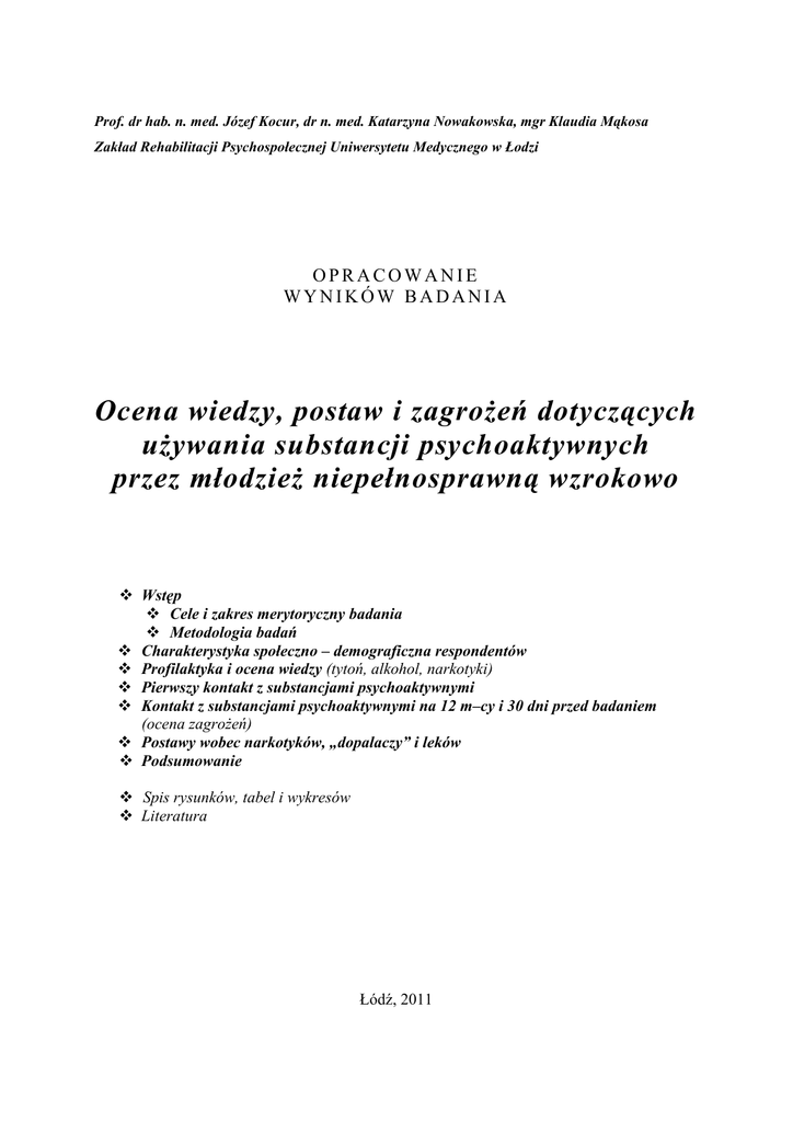 Prof. dr hab. n. med. Józef Kocur, dr n. med. Katarzyna Nowakowska, mgr Klaudia Mąkosa Zakład Rehabilitacji Psychospołecznej Uniwersytetu Medycznego w Łodzi OPRACOWANIE WYNIKÓW BADANIA Ocena wiedzy, postaw i zagrożeń dotyczących używania substancji psychoaktywnych przez młodzież niepełnosprawną wzrokowo Wstęp Cele i zakres merytoryczny badania Metodologia badań Charakterystyka społeczno – demograficzna respondentów Profilaktyka i ocena wiedzy (tytoń, alkohol, narkotyki) Pierwszy kontakt z substancjami psychoaktywnymi Kontakt z substancjami psychoaktywnymi na 12 m–cy i 30 dni przed badaniem (ocena zagrożeń) Postawy wobec narkotyków, „dopalaczy” i leków Podsumowanie Spis rysunków, tabel i wykresów Literatura Łódź, 2011 Wstęp Rozpowszechnienie używania substancji psychoaktywnych o działaniu uzależniającym przez młodzież szkolną stanowi istotny problem społeczno – zdrowotny naszego kraju. W Polsce prowadzono wiele badań, które pozwalają na określenie rozmiarów tego zjawiska, o czym pisali m.in.: Bobrowski, Okuliczyn – Kozaryn (1999), Chodkiewicz, Juczyński (2002), Ostaszewski i inni (2005) oraz Sierosławski (2007). Uwagę należy zwrócić na wyniki badań ESPAD z 2007 r., które wskazują, że inicjacja nikotynowa dotyczy ponad połowy gimnazjalistów i blisko 70% starszych uczniów. Wśród młodzieży szkolnej wraz z wiekiem spada liczba abstynentów alkoholu, a napoje alkoholowe są najczęściej używaną substancją psychoaktywną w tej grupie. Coraz bardziej powszechne wśród uczniów są narkotyki nie tylko z grupy kanabinoli, ale także narkotyki syntetyczne, w tym głównie amfetamina i ecstasy (Sierosławski, 2007). Nowym niepokojącym zjawiskiem jest używanie przez nich tzw. dopalaczy oraz leków uspokajających i nasennych bez przepisu lekarza (CBOS, 2009). Biorąc pod uwagę rozpowszechnienie używania substancji psychoaktywnych wśród młodzieży szkolnej można spodziewać się wzrostowego trendu zjawiska uzależnienia od substancji psychoaktywnych (Chodkiewicz, Juczyński, 2002). Ze względu na brak badań i prac poświęconych problematyce zachowań zdrowotnych wśród młodzieży niepełnosprawnej, celowe wydaje się podjęcie badań dotyczących wiedzy o narkomanii i używaniu substancji psychoaktywnych wśród osób z niepełnosprawnością wzrokową. Cele i zakres merytoryczny badań Badanie zakłada realizację celu głównego i szeregu celów szczegółowych. Celem głównym badania jest ocena wiedzy, postaw i zagrożenia narkomanią w środowisku młodzieży niepełnosprawnej wzrokowo. Cele szczegółowe obejmują: ocenę poziomu wiedzy i częstości uczestnictwa młodzieży szkolnej z niepełnosprawnością wzrokową w programach edukacyjnych i profilaktycznych dotyczących nikotynizmu, alkoholizmu i narkomanii; ocenę poziomu wiedzy badanych na temat negatywnych konsekwencji używania substancji psychoaktywnych o działaniu uzależniającym; 2 ocenę rozpowszechnienia inicjacji nikotynowej, alkoholowej i narkotykowej wśród młodzieży szkolnej; ocenę ilościową i jakościową używania nikotyny, alkoholu i narkotyków w okresie ostatnich 12 miesięcy i ostatnich 30 dni przed badaniem; próbę uzyskania informacji na temat motywów używania narkotyków i innych środków uzależniających. W związku z powyższymi celami zdefiniowano oczekiwania co do efektów badań, na które składają się: - poszerzenie zakresu wiedzy na temat zagrożeń oraz profilaktyki nikotynizmu, alkoholizmu i narkomanii w środowisku młodzieży niepełnosprawnej, - wykorzystanie danych o wiedzy o narkomanii i innych uzależnieniach oraz poznanie zagrożeń wynikających z kontaktu z substancjami uzależniającymi w specyficznym środowisku młodzieży niepełnosprawnej wzrokowo dla celów dydaktyczno – profilaktycznych, ewentualnie terapeutycznych. - wyniki pozwolą na przygotowanie i upowszechnienie programów edukacyjnych ukierunkowanych na zapobieganie palenia tytoniu, picia alkoholu, zażywania narkotyków, leków bez przepisu lekarza i innych substancji psychoaktywnych wśród niepełnosprawnej młodzieży szkolnej. - wyniki mogą być wykorzystane do uzupełnienia lub tworzenia nowych programów profilaktyczno-dydaktycznych w szkolnictwie specjalnym. Metodologia badań Badanie przeprowadzono zgodnie z założeniami metodologiczno–organizacyjnymi wynikającymi z projektu i zawartej umowy. Z listy dziewięciu działających w Polsce ośrodków szkolno-wychowawczych dla młodzieży gimnazjalnej i ponadgimnazjalnej niepełnosprawnej wzrokowo wylosowano 3 placówki, w których przeprowadzono badania. Były to ośrodki w Krakowie, Łodzi i Wrocławiu (co przedstawiono dalej). Badaniami objęto 258 uczniów obojga płci. 3 Szczegóły odnośnie badanej populacji przedstawiono w kolejnym rozdziale niniejszego opracowania 1 . W badaniu wykorzystano metodę standaryzowaną, opartą na pośredniej komunikacji, tj. ankietę. Ze względu na specyfikę badanych i rodzaj ośrodków szkolno–wychowawczych skorzystano z metody ankiety audytoryjnej. Osoba przeprowadzająca badanie była obecna przez cały czas wypełniania kwestionariuszy przez respondentów, a respondenci mieli możliwość zadawania pytań w trakcie trwania procedury badania. Narzędzie badań stanowił kwestionariusz ankiety, składający się z 72 pytań dotyczących danych socjodemograficznych, inicjacji nikotynowej, alkoholowej i narkotykowej, zażywania tych substancji w okresie ostatniego roku i miesiąca przed badaniem, wiedzy o uzależnieniach i metodach profilaktyki. Wybrane pytania ankiety zostały skonstruowane w oparciu o raporty Europejskiego Programu Badań nad Używaniem Alkoholu i Środków Odurzających przez Młodzież Szkolną (The European School Survey Project on Alcohol and Drugs). Zdecydowaną większość stanowiły pytania zamknięte ze wskazaniem na jedną odpowiedź. Jedynie ostatnie pytanie kwestionariusza-ankiety oraz pytanie o wiek w