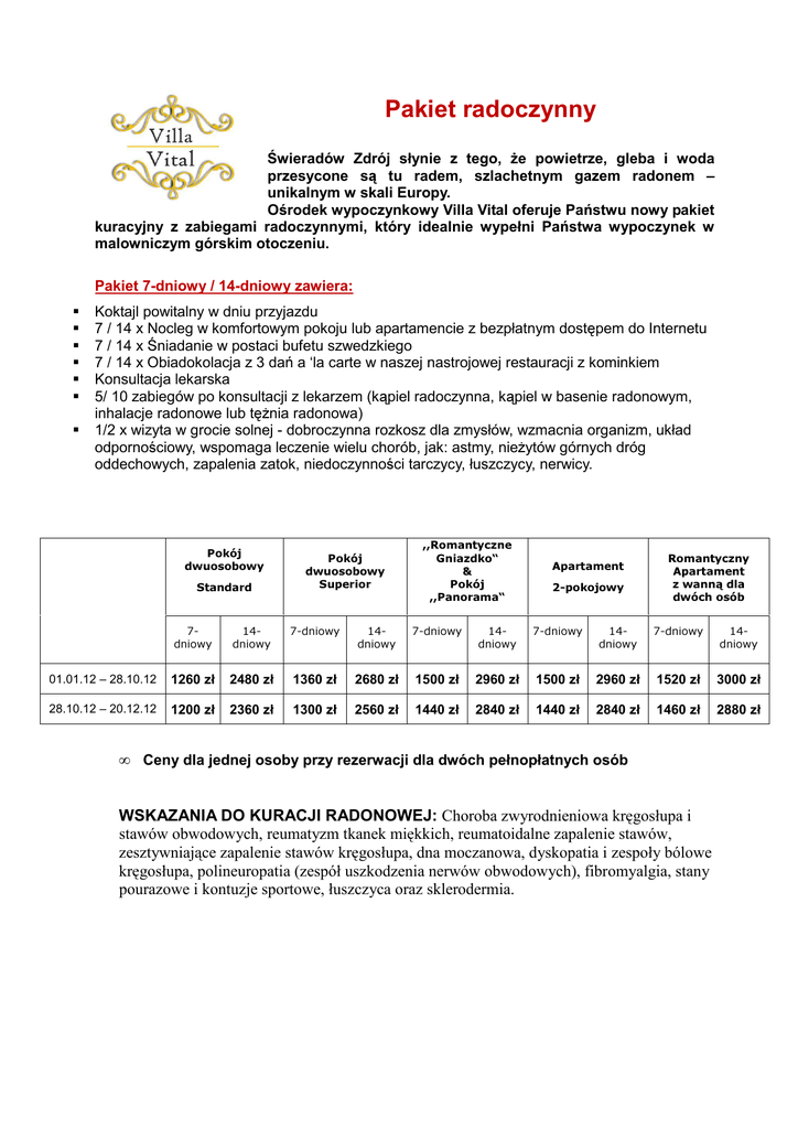 Pakiet radoczynny Świeradów Zdrój słynie z tego, że powietrze, gleba i woda przesycone są tu radem, szlachetnym gazem radonem – unikalnym w skali Europy. Ośrodek wypoczynkowy Villa Vital oferuje Państwu nowy pakiet kuracyjny z zabiegami radoczynnymi, który idealnie wypełni Państwa wypoczynek w malowniczym górskim otoczeniu. Pakiet 7-dniowy / 14-dniowy zawiera: Koktajl powitalny w dniu przyjazdu 7 / 14 x Nocleg w komfortowym pokoju lub apartamencie z bezpłatnym dostępem do Internetu 7 / 14 x Śniadanie w postaci bufetu szwedzkiego 7 / 14 x Obiadokolacja z 3 dań a ‘la carte w naszej nastrojowej restauracji z kominkiem Konsultacja lekarska 5/ 10 zabiegów po konsultacji z lekarzem (kąpiel radoczynna, kąpiel w basenie radonowym, inhalacje radonowe lub tężnia radonowa) 1/2 x wizyta w grocie solnej - dobroczynna rozkosz dla zmysłów, wzmacnia organizm, układ odpornościowy, wspomaga leczenie wielu chorób, jak: astmy, nieżytów górnych dróg oddechowych, zapalenia zatok, niedoczynności tarczycy, łuszczycy, nerwicy. Pokój dwuosobowy Standard Pokój dwuosobowy Superior ,,Romantyczne Gniazdko“ & Pokój ,,Panorama“ Apartament 2-pokojowy Romantyczny Apartament z wanną dla dwóch osób 7dniowy 14dniowy 7-dniowy 14dniowy 7-dniowy 14dniowy 7-dniowy 14dniowy 7-dniowy 14dniowy 01.01.12 – 28.10.12 1260 zł 2480 zł 1360 zł 2680 zł 1500 zł 2960 zł 1500 zł 2960 zł 1520 zł 3000 zł 28.10.12 – 20.12.12 1200 zł 2360 zł 1300 zł 2560 zł 1440 zł 2840 zł 1440 zł 2840 zł 1460 zł 2880 zł • Ceny dla jednej osoby przy rezerwacji dla dwóch pełnopłatnych osób WSKAZANIA DO KURACJI RADONOWEJ: Choroba zwyrodnieniowa kręgosłupa i stawów obwodowych, reumatyzm tkanek miękkich, reumatoidalne zapalenie stawów, zesztywniające zapalenie stawów kręgosłupa, dna moczanowa, dyskopatia i zespoły bólowe kręgosłupa, polineuropatia (zespół uszkodzenia nerwów obwodowych), fibromyalgia, stany pourazowe i kontuzje sportowe, łuszczyca oraz sklerodermia.