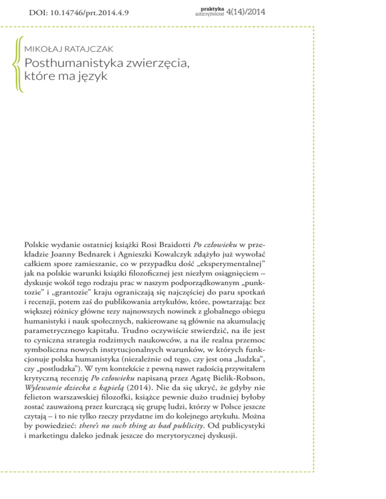 DOI: 10.14746/prt.2014.4.9 praktyka anzcyteroet 4(14)/2014 } Mikołaj Ratajczak Posthumanistyka zwierzęcia, które ma język Polskie wydanie ostatniej książki Rosi Braidotti Po człowieku w przekładzie Joanny Bednarek i Agnieszki Kowalczyk zdążyło już wywołać całkiem spore zamieszanie, co w przypadku dość „eksperymentalnej” jak na polskie warunki książki filozoficznej jest niezłym osiągnięciem – dyskusje wokół tego rodzaju prac w naszym podporządkowanym „punktozie” i „grantozie” kraju ograniczają się najczęściej do paru spotkań i recenzji, potem zaś do publikowania artykułów, które, powtarzając bez większej różnicy główne tezy najnowszych nowinek z globalnego obiegu humanistyki i nauk społecznych, nakierowane są głównie na akumulację parametrycznego kapitału. Trudno oczywiście stwierdzić, na ile jest to cyniczna strategia rodzimych naukowców, a na ile realna przemoc symboliczna nowych instytucjonalnych warunków, w których funkcjonuje polska humanistyka (niezależnie od tego, czy jest ona „ludzka”, czy „postludzka”). W tym kontekście z pewną nawet radością przywitałem krytyczną recenzję Po człowieku napisaną przez Agatę Bielik-Robson, Wylewanie dziecka z kąpielą (2014). Nie da się ukryć, że gdyby nie felieton warszawskiej filozofki, książce pewnie dużo trudniej byłoby zostać zauważoną przez kurczącą się grupę ludzi, którzy w Polsce jeszcze czytają – i to nie tylko rzeczy przydatne im do kolejnego artykułu. Można by powiedzieć: there’s no such thing as bad publicity. Od publicystyki i marketingu daleko jednak jeszcze do merytorycznej dyskusji. praktyka anzcyteroet 4(14)/2014 194 Z tego względu z jeszcze większą radością przeczytałem artykuł Joanny Bednarek, Emancypacyjna obietnica posthumanizmu (2014), opublikowany przez „Praktykę Teoretyczną” jako swego rodzaju odpowiedź na tekst Bielik-Robson, w rzeczy samej daleki od jakiejkolwiek poważnej krytyki stanowiska Braidotti. Bednarek, która zrobiła wiele dla realnego zafunkcjonowania perspektywy posthumanistycznej w dyskursie polskiej nauki1, w zakończeniu swojego tekstu otwiera debatę nad problemami, z którymi musi zmierzyć się posthumanistyka serio traktująca Nietzscheańskopoststrukturalistyczną tezę o śmierci człowieka. Debata ta – o ile, miejmy nadzieję, rzeczywiście będziemy mogli mówić o debacie – została poniekąd zapoczątkowana również numerem 24/25 Wakatu2, niemniej za punkt wyjścia moich uwag do pytania o zasadność i perspektywę posthumanizmu chciałbym przyjąć tezy stawiane w Emancypacyjnej obietnicy posthumanizmu – o tyle istotne, o ile rzeczywiście otwierające olbrzymie i niezwykle istotne pole problemowe, moim zdaniem szersze, niż zakreśla to Bednarek. Przy czym moje spojrzenie będzie poniekąd nietypowe, ale mam wrażenie zgodne z pewnym ogólnym duchem pism teoretyczek i teoretyków posthumanistycznych – posthumanizm traktuję raczej jako pewną refleksję nad samą teorią i zadaniem filozofii/humanistyki, która to refleksja wyrasta zarówno z historyczno-instytucjonalnej trajektorii przekształceń instytucjonalnej nauki (pytanie, czy nie chodzi tu jednak przede wszystkim o uniwersytet anglosaski, pozwolę sobie pozostawić otwartym), jak i z diagnozy gwałtownej konieczności rewizji kategorii kształtujących nasz etyczno-polityczny słownik w obliczu obecnego stadium rozwoju tak technologii, jak i kapitalistycznej subsumcji życia społecznego i biologicznego. Nietypowość mojego spojrzenia bierze się z faktu, że jako filozof „profesjonalnie” zajmuję się w dużym stopniu filozofią języka, a więc polem problemowym, które – przynajmniej z pewnego punktu widzenia – wiąże się raczej ze światem „ludzkim” i z „ludzkim” spojrzeniem na świat. Czy tak rzeczywiście być musi – o tym na końcu. Za jedną z największych zalet książki Braidotti uważam nieustanne podkreślanie przez autorkę wagi i roli pracy teoretycznej. Jak pisze filozofka, jednym z fundamentalnych zagadnień poruszanych w Po człowieku jest pytanie o funkcję teorii w postludzkich czasach (Braidotti 2014, 49), zaś cały czwarty rozdział książki poświęcony jest problemowi nauk 1 Wystarczy wskazać na jej świetną przedmowę do polskiego wydania Po człowieku oraz na artykuły m.in. z „Nowej Krytyki” (Maszyna antropologiczna – instrukcja demontażu) oraz „Wakatu” (Antykapitalizm, queer i nadchodzący kres rodziny). 2 http://sdk.pl/wakat/nr24/nr24.html Mikołaj Ratajczak 195 praktyka anzcyteroet 4(14)/2014 humanistycznych po śmierci „Człowieka”. Choć w wielu miejscach można się z Braidotti nie zgadzać, a jej optymizm co do teorii produkowanej przez współczesne uniwersytety miejscami razi zbytnią, choć być może jedynie pozorną naiwnością, to jej stanowisko odznacza się pewną trzeźwością spojrzenia, wyrastającą prawdopodobnie z doświadczenia autentycznego wpływu nauk humanistycznych oraz społecznych na politykę i kulturę w latach sześćdziesiątych czy siedemdziesiątych. W skrócie – Braidotti zdaje się nam mówić, że zadaniem filozofii i nauk humanistycznych jest rewolucja w teorii i do tego mogą się one przydać najbardziej. Trudno powiedzieć, czy propozycje Braidotti dla humanistyki po człowieku są raczej propozycjami przedstawicielki pokolenia, które „miało marzenie” (Braidotti 2014, 60) i które jakoś uodporniło się na, ostatecznie zwycięskie, mechanizmy cynicznego rozumu, czy też tyle wizjonerskim, co realistycznym projektem nowego paradygmatu naukowego. Niezależnie od tego, wykonuje ona niezwykle istotną pracę pojęciową, formułując swoją posthumanistyczną teorię jako kontynuację krytycznych prądów intelektualnych w rodzaju antykolonializmu, feminizmu czy poststrukturalizmu (Braidotti 2014, 76–81), a więc badań (często bojowniczych w swoim charakterze, o wyraźnych politycznych cela
