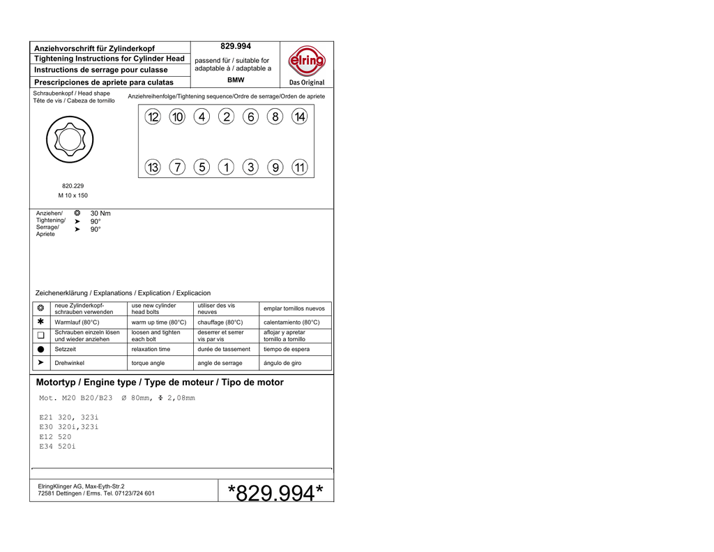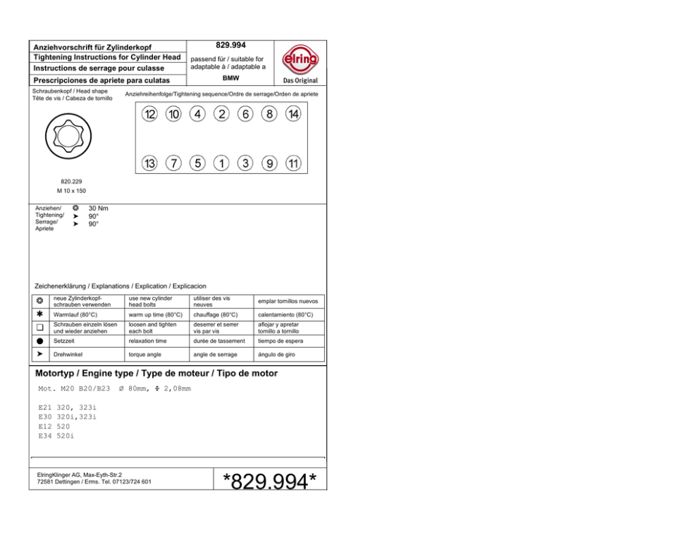 Anziehvorschrift für Zylinderkopf Tightening Instructions for Cylinder Head Instructions de serrage pour culasse 829.994 passend für / suitable for adaptable à / adaptable a BMW Prescripciones de apriete para culatas Schraubenkopf / Head shape Tête de vis / Cabeza de tornillo Anziehreihenfolge/Tightening sequence/Ordre de serrage/Orden de apriete 820.229 M 10 x 150 Anziehen/ Tightening/ Serrage/ Apriete ❂ ➤ ➤ 30 Nm 90° 90° Zeichenerklärung / Explanations / Explication / Explicacion ❂ neue Zylinderkopfschrauben verwenden use new cylinder head bolts utiliser des vis neuves emplar tornillos nuevos ✱ Warmlauf (80°C) warm up time (80°C) chauffage (80°C) calentamiento (80°C) ❏ Schrauben einzeln lösen und wieder anziehen loosen and tighten each bolt deserrer et serrer vis par vis aflojar y apretar tornillo a tornillo ● Setzzeit relaxation time durée de tassement tiempo de espera ➤ Drehwinkel torque angle angle de serrage ángulo de giro Motortyp / Engine type / Type de moteur / Tipo de motor Mot. M20 B20/B23 E21 E30 E12 E34 Ø 80mm, ¿ 2,08mm 320, 323i 320i,323i 520 520i ElringKlinger AG, Max-Eyth-Str.2 72581 Dettingen / Erms. Tel. 07123/724 601 *829.994*