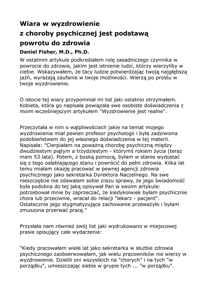 Wiara w wyzdrowienie z choroby psychicznej jest podstawą powrotu do zdrowia Daniel Fisher, M.D., Ph.D. W ostatnim artykule podkreślałem rolę zasadniczego czynnika w powrocie do zdrowia, jakim jest istnienie ludzi, którzy wierzyliby w ciebie. Wskazywałem, że tacy ludzie potwierdzając twoją najgłębszą jaźń, wyrażają zaufanie w twoje możliwości. Wierzą po prostu w twoje wyzdrowienie. O istocie tej wiary przypomniał mi list jaki ostatnio otrzymałem. Kobieta, która go napisała powiązała swe osobiste doświadczenia z moim wcześniejszym artykułem "Wyzdrowienie jest realne". Przeczytała w nim o wątpliwościach jakie na temat mojego wyzdrowienia miał pewien profesor psychologii i była zadziwiona podobieństwem do jej własnego doświadczenia w tej materii. Napisała: "Cierpiałam na poważną chorobę psychiczną między dwudziestym piątym a trzydziestym - którymś rokiem życia (teraz mam 53 lata). Potem, z boską pomocą, byłam w stanie wydostać się z tego osłabiającego stanu i powrócić do pełni zdrowia. Kilka lat temu miałam okazję pracować w pewnej agencji zdrowia psychicznego jako sekretarka Dyrektora Naczelnego. Na swe nieszczęście nie zdawałam sobie zrazu sprawy, że jego świadomość była podobna do tej jaką opisywał Pan w swoim artykule: potrzebował mnie by zaprzeczać, że kiedykolwiek byłam psychicznie chora lub przeciwnie, wracał do relacji "lekarz - pacjent". Ostatecznie jego stygmatyzujące zachowanie przeważyło i byłam zmuszona przerwać pracę." Przysłała nam również swój list jaki wydrukowano w miejscowej prasie opisujący całe wydarzenie: "Kiedy pracowałam wiele lat jako sekretarka w służbie zdrowia psychicznego zaobserwowałam, jak wielu pracowników nie wierzy w wyzdrowienie. Dzielili oni wszystkich na "chorych" i na tych "w porządku", umieszczając siebie w grupie tych ... "w porządku". "Ich ocena własnego stanu psychicznego bazowała raczej na porównaniu z chorymi, niż na wiedzy o sobie samych. Prowadziło to pacjentów na niepewny grunt i czyniło więcej złego niż dobrego, osłabiając raczej niż wzmacniając możliwość potencjalnego wyzdrowienia. "Praca w tej dziedzinie jest bardzo złożona i odpowiedzialna. Wymaga świadomych, dających poczucie bezpieczeństwa pracowników, którzy uznają, że pełny powrót do zdrowia jest możliwy". Ona sama wyzdrowiała z choroby psychicznej, a potem gdy pracowała w agencji zdrowia psychicznego jej wyzdrowieniu zaprzeczono. Przekonanie, zgodnie z którym, gdy ktoś zachorował psychicznie zawsze będzie chory, nie tylko podważa możliwość emocjonalnego uleczenia, ale również uniemożliwia powrót do społeczeństwa w roli pełnoprawnego członka. Potencjalnie wyklucza to powrót do pracy oraz nawiązywanie długoterminowych relacji osobistych, które są podstawą zdrowia. Przekonanie o możliwości wyzdrowienia z choroby psychicznej jako ważnego aspektu w doświadczeniu uzdrawiania jest dobrze udokumentowane. Ten związek został na nowo podkreślony przez dr. Herbert'a Benson'a w książce pt: "Timeless Healing". Podobny punkt widzenia na temat wiary we własne możliwości uzdrowienia można znaleźć w książce Deepak'a Chopra pt: "Quantum Healing" (str.189), gdzie omawia on Medycynę Ajurwedyczną: Ajurweda jest... systemem leczenia złudzeń, odzierającym chorobę z jej przekonywujących cech i pozwalającym zdrowej rzeczywistości zająć ich miejsce. Nazwa Ajurweda ma korzenie w Sanskrycie. Ajus - czyli życie i Weda - co oznacza wiedzę lub naukę. Dosłowne znaczenie to "wiedza życia". Spędziłem wiele czasu rozmawiając z ludźmi, próbując odwieść ich od przekonania o swej chorobie. W Ajurwedzie jest to pierwszy, najważniejszy krok do uzdrowienia. Tak długo jak pacjent jest przywiązany do swych symptomów, tak długo zatrzymany jest w rzeczywistości, gdzie bycie chorym jest najważniejszym faktem. Przyczyna, dla której medytacja jest tak ważna w Ajurwedzie, polega na tym, że prowadzi ona umysł do wolnej strefy nie dotkniętej chorobą. Póki nie wiesz, że takie miejsce istnieje twoja choroba będzie wydawała się całkowicie obezwładniająca. Jest to podstawowe złudzenie, z którym musimy się uporać". Chociaż zachodnia medycyna zaczyna uznawać centralną rolę pozytywnych przekonań w procesie leczenia chorób somatycznych, niepokojącym pozostaje fakt, że psychiatria nie dostrzega mądrości w takim podejściu do chorób psychicznych. Pomimo wagi osobistych świadectw ludzi uzdrowionych oraz studiów epidemiologicznych dowodzących, że ludzie chorzy mogą powrócić do odgrywania ważnych ról społecznych i wyzdrowieć całkowicie po chorobie psychicznej, środowisko służby zdrowia (w szczególności) utrzymuje przekonanie, że choroba psychiczna jest uwarunkowaniem stałym. Im więcej nas, którzy wyzdrowieliśmy po chorobie psychicznej opowie swe historie, tym więcej prawdy zastąpi fałszywe przekonanie. Zapraszamy, napiszcie do nas o doświadczeniach pełnego uzdrowienia z choroby psychicznej, własnego lub kogoś kogo znacie. Jak zaznaczyłem w innym artykule na naszej stronie, przez całkowite uzdrowienie rozumiemy powrót do znaczących ról społecznych, dawanie sobie rady ze stresami życia codziennego i fakt, że nasze otoczenie nie uważa nas za chorych. Tłumaczenie Paweł S. Tomaszewski ze strony: www.power2u.org