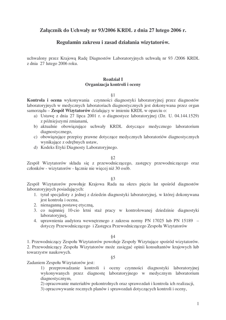 Zał cznik do Uchwały nr 93/2006 KRDL z dnia 27 lutego 2006 r. Regulamin zakresu i zasad działania wizytatorów. uchwalony przez Krajow Rad Diagnostów Laboratoryjnych uchwał nr 93 /2006 KRDL z dnia 27 lutego 2006 roku. Rozdział I Organizacja kontroli i oceny §1 Kontrola i ocena wykonywania czynno ci diagnostyki laboratoryjnej przez diagnostów laboratoryjnych w medycznych laboratoriach diagnostycznych jest dokonywana przez organ samorz du – Zespół Wizytatorów działaj cy w imieniu KRDL w oparciu o: a) Ustaw z dnia 27 lipca 2001 r. o diagnostyce laboratoryjnej (Dz. U. 04.144.1529) z pó niejszymi zmianami, b) aktualnie obowi zuj ce uchwały KRDL dotycz ce medycznego laboratorium diagnostycznego, c) obowi zuj ce przepisy prawne dotycz ce medycznych laboratoriów diagnostycznych wynikaj ce z odr bnych ustaw, d) Kodeks Etyki Diagnosty Laboratoryjnego. §2 Zespół Wizytatorów składa si z przewodnicz cego, zast pcy przewodnicz cego oraz członków - wizytatorów - ł cznie nie wi cej ni 30 osób. §3 Zespół Wizytatorów powołuje Krajowa Rada na okres pi ciu lat spo ród diagnostów laboratoryjnych posiadaj cych: 1. tytuł specjalisty z jednej z dziedzin diagnostyki laboratoryjnej, w której dokonywana jest kontrola i ocena, 2. nienagann postaw etyczn , 3. co najmniej 10-cio letni sta pracy w kontrolowanej dziedzinie diagnostyki laboratoryjnej, 4. uprawnienia audytora wewn trznego z zakresu normy PN 17025 lub PN 15189 – dotyczy Przewodnicz cego i Zast pca Przewodnicz cego Zespołu Wizytatorów §4 1. Przewodnicz cy Zespołu Wizytatorów powołuje Zespoły Wizytuj ce spo ród wizytatorów. 2. Przewodnicz cy Zespołu Wizytatorów mo e zasi ga opinii konsultantów krajowych lub towarzystw naukowych. §5 Zadaniem Zespołu Wizytatorów jest: 1) przeprowadzanie kontroli i oceny czynno ci diagnostyki laboratoryjnej wykonywanych przez diagnost laboratoryjnego w medycznym laboratorium diagnostycznym, 2) opracowanie materiałów pokontrolnych oraz sprawozda i kontrola ich realizacji, 3) opracowywanie rocznych planów i sprawozda dotycz cych kontroli i oceny, 1 4) składanie sprawozdania do KRDL raz w roku (do ko ca lutego roku nast pnego). §6 1. Kontrola i ocena mog by przeprowadzane przy współudziale dobranych specjalistów nie b d cych członkami Zespołu Wizytatorów. 2. Przewodnicz cy Zespołu Wizytatorów wybiera specjalistów spo ród osób posiadaj cych stopie / tytuł naukowy lub tytuł specjalisty. 3. Specjali ci uczestnicz w pracach zespołu kontroluj cego z głosem doradczym. §7 Celem kontroli i oceny przez Zespół Wizytuj cy jest: 1) wizytacja pomieszcze laboratorium, 2) obserwowanie sposobu wykonywania czynno ci diagnostyki laboratoryjnej, 3) danie informacji, wyja nie i udost pnienia dokumentacji medycznej, 4) wydawanie zalece pokontrolnych. §8 Kontrole i oceny mog by prowadzone: 1. zgodnie z planem kontroli na dany rok, 2. dora nie (interwencyjnie) – realizowane na skutek zgłoszonych skarg i wniosków, 3. na wniosek Prezesa KRDL, Przewodnicz cego zespołu Wizytatorów KRDL, przedstawiciela wojewódzkiego KRDL, Rzecznika Dyscyplinarnego KIDL, 4. jako sprawdzaj ce realizacje zalece powizytacyjnych. §9 1. Plan kontroli i oceny sporz dza si na dany rok kalendarzowy. 2. Projekt planu kontroli i oceny sporz dza Przewodnicz cy Zespołu Wizytatorów, a zatwierdza KRDL. § 10 1. Kontrole i oceny przeprowadza Zespół Wizytuj cy składaj cy si co najmniej z dwóch wizytatorów. 2. Przewodnicz cy Zespołu Wizytatorów powołuje Przewodnicz cego Zespołu Wizytuj cego spo ród członków Zespołu Wizytuj cego. 3. Przewodnicz cy Zespołu Wizytuj cego odpowiedzialny jest w szczególno ci za: 1) przygotowanie planu kontroli i oceny, 2) pobranie w Biurze KIDL niezb dnych dokumentów potrzebnych do przeprowadzenia kontroli i oceny, a w szczególno ci: a) upowa nie dla członków Zespołu Wizytuj cego do przeprowadzenia kontroli i oceny (zał czniki nr 1), b) arkuszy przebiegu kontroli i oceny w liczbie zgodnej z liczb wizytatorów (zał czniki nr 2), c) protokołów kontroli i oceny (zał czniki nr 3), d) protokołu wyst pienia pokontrolnego(zał cznik nr 4), e) regulaminu zakresu i zasad działania wizytatorów. 3) przydzielenie zada członkom Zespołu Wizytuj cego, 4) przeprowadzenie kontroli i oceny zgodnie z planem, 5) skompletowanie dokumentacji z kontroli i oceny i nale yte jej zabezpieczenie. 2 § 11 Przewodnicz cy Zespołu Wizytatorów powiadamia pisemnie osoby kieruj ce Zakładem Opieki Zdrowotnej i kierownika laboratorium o terminie kontroli i oceny. § 12 1. Kontrol i ocen przeprowadza si w miejscu wykonywania czynno ci diagnostyki laboratoryjnej przez osob kontrolowan . 2. Kontrola i ocena jest prowadzona w dniach i godzinach pracy medycznego laboratorium diagnostycznego. 3. Kontrola i ocena przeprowadzana jest w obecno ci kierownika medycznego laboratorium diagnostycznego lub upowa nionej przez niego osoby posiadaj cej prawo wykonywania zawodu diagnosty laboratoryjnego. § 13 1. Kontrole i oceny wykonywania czynno ci diagnostycznych w medycznych laboratoriach diagnostycznych przeprowadza si na podstawie imiennego upowa nienia, które zawiera: 1) numer upowa nienia, 2) dat wystawienia upowa nienia, 3) okre lenie podstawy prawnej kontroli i oceny, 4) dane osób wchodz cych w skład Zespołu Wizytuj cego zawieraj ce: a) imi i nazwisko, b) numer i seri dowodu to samo ci, c) numer wpisu na list diagnostów laboratoryjnych, d) funkcj pełnion w Zespole Wizytuj cym, (przewodnicz cy, członek), 5) miejsce, w którym wykonywane s czynno ci diagnostyki laboratoryjnej poprzez okre lenie pełnej nazwy oraz siedziby, 6) cel kontroli i oceny, 7) termin kontroli i oceny. 2. Upowa nienie podpisuje Przewodnicz cy Zespołu Wizytatorów lub upowa niona przez niego osoba. 3. Wzór upowa nienia okre la zał cznik nr 1 do regulaminu. Rozdział II Zakres kontroli i oceny. § 14 1. Członkowie Zespołu Wizytuj cego zobowi zani s do prowadzenia kontroli i oceny ze szczególn staranno ci , a