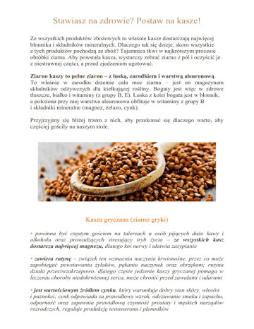 Stawiasz na zdrowie? Postaw na kasze! Ze wszystkich produktów zbożowych to właśnie kasze dostarczają najwięcej błonnika i składników mineralnych. Dlaczego tak się dzieje, skoro wszystkie z tych produktów pochodzą ze zbóż? Tajemnica tkwi w najkrótszym procesie obróbki ziarna. Aby powstała kasza, wystarczy zebrać ziarno z pól i oczyścić je z niestrawnej części, a przed zjedzeniem ugotować. Ziarno kaszy to pełne ziarno – z łuską, zarodkiem i warstwą aleuronową. To właśnie w zarodku drzemie cała moc ziarna – jest on magazynem składników odżywczych dla kiełkującej rośliny. Bogaty jest więc w zdrowe tłuszcze, białko i witaminy (z grupy B, E). Łuska z kolei bogata jest w błonnik, a położona przy niej warstwa aleuronowa obfituje w witaminy z grupy B i składniki mineralne (magnez, żelazo, cynk). Przyjrzyjmy się bliżej trzem z nich, aby przekonać się dlaczego warto, aby częściej gościły na naszym stole. Kasza gryczana (ziarno gryki) • powinna być częstym gościem na talerzach u osób pijących dużo kawy i alkoholu oraz prowadzących stresujący tryb życia – ze wszystkich kasz dostarcza najwięcej magnezu, dlatego koi nerwy i ułatwia zasypianie • zawiera rutynę – związek ten wzmacnia naczynia krwionośne, przez co może zapobiegać powstawaniu żylaków, pękaniu naczynek oraz obrzękom; rutyna działa przeciwzakrzepowo, dlatego częste jedzenie kaszy gryczanej pomaga w leczeniu choroby niedokrwiennej serca, może chronić przed zawałami i udarami • jest wartościowym źródłem cynku, który warunkuje dobry stan skóry, włosów i paznokci; cynk odpowiada za prawidłowy wzrok, odczuwanie smaku i zapachu, odporność oraz zapewnia prawidłową czynność prostaty i męskich narządów rozrodczych, reguluje produkcję testosteronu i plemników • zawiera D-chiro-inozytol, który bierze udział w prawidłowym działaniu insuliny (jego niedobór sprzyja rozwojowi cukrzycy typu II); związek ten reguluje gospodarkę hormonalną, dlatego dostarczająca go kasza gryczana polecana jest kobietom chorującym na zespół policystycznych jajników • nadaje się dla cukrzyków i osób odchudzających się, ponieważ ma stosunkowo niski indeks glikemiczny, a więc nie powoduje gwałtownego wzrostu stężenia cukru we krwi • może być spożywana przez osoby chore na celiakię, gdyż nie zawiera glutenu Idealna do: dań mięsnych, grzybowych, farszów do naleśników, Kasza jaglana (ziarno prosa) • zalecana jest w diecie dzieci, kobiet w ciąży i osób chorych na niedokrwistość, ponieważ ze wszystkich kasz zawiera najwięcej żelaza – warunkuje ono prawidłową budowę czerwonych krwinek, tak by były zdolne do dostarczania tlenu do każdej komórki organizmu • powinna być częstym składnikiem diety osób z niską odpornością, ponieważ zawiera dużo cynku, krzemu i żelaza, które wpływają na prawidłowe funkcjonowanie układu odpornościowego •kasza jaglana jako jedyna, ma potencjał zasadotwórczy, dlatego pomaga w utrzymaniu w organizmie równowagi kwasowo-zasadowej. Kasza jęczmienna (ziarno jęczmienia) Do wyboru mamy trzy rodzaje kaszy jęczmiennej: • pęczak (całe, wypolerowane ziarno) • perłową, tzw. Mazurską (ziarno pocięte na kawałki i wypolerowane) • łamaną, tzw. Wiejską (połamane, ale niepolerowane ziarno) Polecana osobom z dolegliwościami jelitowymi (choroby zapalne jelit, zespół jelita drażliwego) oraz po leczeniu przeciwnowotworowym w celu regeneracji kosmków jelitowych, ponieważ bogata jest w błonnik, zwłaszcza w β-glukan, który odżywia błonę śluzową jelit. Dodatkowo związek ten obniża stężenie cholesterolu i poprawia odporność organizmu.