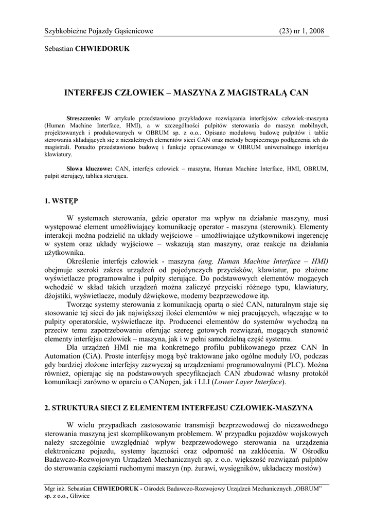 Szybkobieżne Pojazdy Gąsienicowe (23) nr 1, 2008 Sebastian CHWIEDORUK INTERFEJS CZŁOWIEK – MASZYNA Z MAGISTRALĄ CAN Streszczenie: W artykule przedstawiono przykładowe rozwiązania interfejsów człowiek-maszyna (Human Machine Interface, HMI), a w szczególności pulpitów sterowania do maszyn mobilnych, projektowanych i produkowanych w OBRUM sp. z o.o.. Opisano modułową budowę pulpitów i tablic sterowania składających się z niezależnych elementów sieci CAN oraz metody bezpiecznego podłączenia ich do magistrali. Ponadto przedstawiono budowę i funkcje opracowanego w OBRUM uniwersalnego interfejsu klawiatury. Słowa kluczowe: CAN, interfejs człowiek – maszyna, Human Machine Interface, HMI, OBRUM, pulpit sterujący, tablica sterująca. 1. WSTĘP W systemach sterowania, gdzie operator ma wpływ na działanie maszyny, musi występować element umożliwiający komunikację operator - maszyna (sterownik). Elementy interakcji można podzielić na układy wejściowe – umożliwiające użytkownikowi ingerencję w system oraz układy wyjściowe – wskazują stan maszyny, oraz reakcje na działania użytkownika. Określenie interfejs człowiek - maszyna (ang. Human Machine Interface – HMI) obejmuje szeroki zakres urządzeń od pojedynczych przycisków, klawiatur, po złożone wyświetlacze programowalne i pulpity sterujące. Do podstawowych elementów mogących wchodzić w skład takich urządzeń można zaliczyć przyciski różnego typu, klawiatury, dżojstiki, wyświetlacze, moduły dźwiękowe, modemy bezprzewodowe itp. Tworząc systemy sterowania z komunikacją opartą o sieć CAN, naturalnym staje się stosowanie tej sieci do jak największej ilości elementów w niej pracujących, włączając w to pulpity operatorskie, wyświetlacze itp. Producenci elementów do systemów wychodzą na przeciw temu zapotrzebowaniu oferując szereg gotowych rozwiązań, mogących stanowić elementy interfejsu człowiek – maszyna, jak i w pełni samodzielną część systemu. Dla urządzeń HMI nie ma konkretnego profilu publikowanego przez CAN In Automation (CiA). Proste interfejsy mogą być traktowane jako ogólne moduły I/O, podczas gdy bardziej złożone interfejsy zazwyczaj są urządzeniami programowalnymi (PLC). Można również, opierając się na podstawowych specyfikacjach CAN zbudować własny protokół komunikacji zarówno w oparciu o CANopen, jak i LLI (Lower Layer Interface). 2. STRUKTURA SIECI Z ELEMENTEM INTERFEJSU CZŁOWIEK-MASZYNA W wielu przypadkach zastosowanie transmisji bezprzewodowej do niezawodnego sterowania maszyną jest skomplikowanym problemem. W przypadku pojazdów wojskowych należy szczególnie uwzględniać wpływ bezprzewodowego sterowania na urządzenia elektroniczne pojazdu, systemy łączności oraz odporność na zakłócenia. W Ośrodku Badawczo-Rozwojowym Urządzeń Mechanicznych sp. z o.o. większość rozwiązań pulpitów do sterowania częściami ruchomymi maszyn (np. żurawi, wysięgników, układaczy mostów) Mgr inż. Sebastian CHWIEDORUK - Ośrodek Badawczo-Rozwojowy Urządzeń Mechanicznych „OBRUM” sp. z o.o., Gliwice Sebastian CHWIEDORUK jest podłączana do układu przewodem o długości od kilku do kilkudziesięciu metrów. Długość przewodów musi być taka, żeby zapewnić bezpieczeństwo i dobrą widoczność operatorowi. Pulpit wynośny, połączony przewodem z systemem CAN na pojeździe, jest narażony na uszkodzenie tegoż przewodu, co w skrajnym przypadku może powodować zaburzenie pracy całej sieci. Jest to szczególnie niebezpieczne jeśli przewód zewnętrzny jest podłączany bezpośrednio do głównej magistrali CAN. Z tych powodów celowe jest odizolowane tej części magistrali. Możliwe jest to przez zastosowanie układów oddzielających elektrycznie czyli urządzeń typu repeater lub w bardziej złożonych przypadkach typu most (ang. Bridge). Repeater stanowi oddzielenie elektryczne, a nie logiczne. W związku z tym, z punktu widzenia programowego, wstawienie elementu takiego typu nie ma znaczenia. Z punktu widzenia elektrycznego wypięcie części oddzielonej elementem typu repeater nie zmienia struktury sieci jako magistrali. W podobny sposób można uniknąć ingerencji w magistralę od strony złącza diagnostycznego, jeżeli takie jest przewidziane w aplikacji. Przykład takiego podłączenia przedstawiono na rys.1. b). Rys.1. Podłączenia interfejsu człowiek – maszyna z pojedynczą siecią CAN: a) podłączenie bezpośrednie b) podłączenie poprzez repeater c) podłączenie drogą radiową Podobną strukturę można uzyskać stosując transmisję radiową (rys.1.c). W tym przypadku ograniczenia, co do sposobu i ilości przesyłanych danych mogą występować po stronie transmisyjnej. Współczesne sterowniki czy też wyświetlacze, wspierające technologie CAN wyposażone są w dwa lub więcej niezależnych interfejsów CAN. Dlatego możliwe jest podzielenie całej struktury sieci na podsieci, w tym na przykład jedną do obsługi HMI. 2 Interfejs człowiek – maszyna z magistralą CAN Rysunek 2 przedstawia możliwe podłączenia w przypadku dwóch sieci w systemie. Przykład a) pokazuje klasyczną sytuację, w której sterownik obsługuje dwie sieci CAN - jedną główną sieć sterowania i drugą sieć komunikacji z HMI. Jeżeli jest to uzasadnione technicznie, interfejs człowiek - maszyna może również monitorować bezpośrednio stan magistrali sterowania i niezależnie wymieniać dane poprzez drugą magistralę. Taką sytuację przedstawia przypadek b) rysunku 2. Nowoczesne panele operatorskie czy też wyświetlacze mogą w wielu przypadkach spełniać również rolę sterownika w systemie. Jedną z możliwych struktur w takim rozwiązaniu pokazuje przypadek c) rysunku 2. Sterowanie systemu może być realizowane poprzez rozproszone układy wejścia wyjścia (I/O), połączone z jednostką sterującą magistralą CAN. Rys.2. Podłączenia interfejsu człowiek – maszyna dla struktury z 