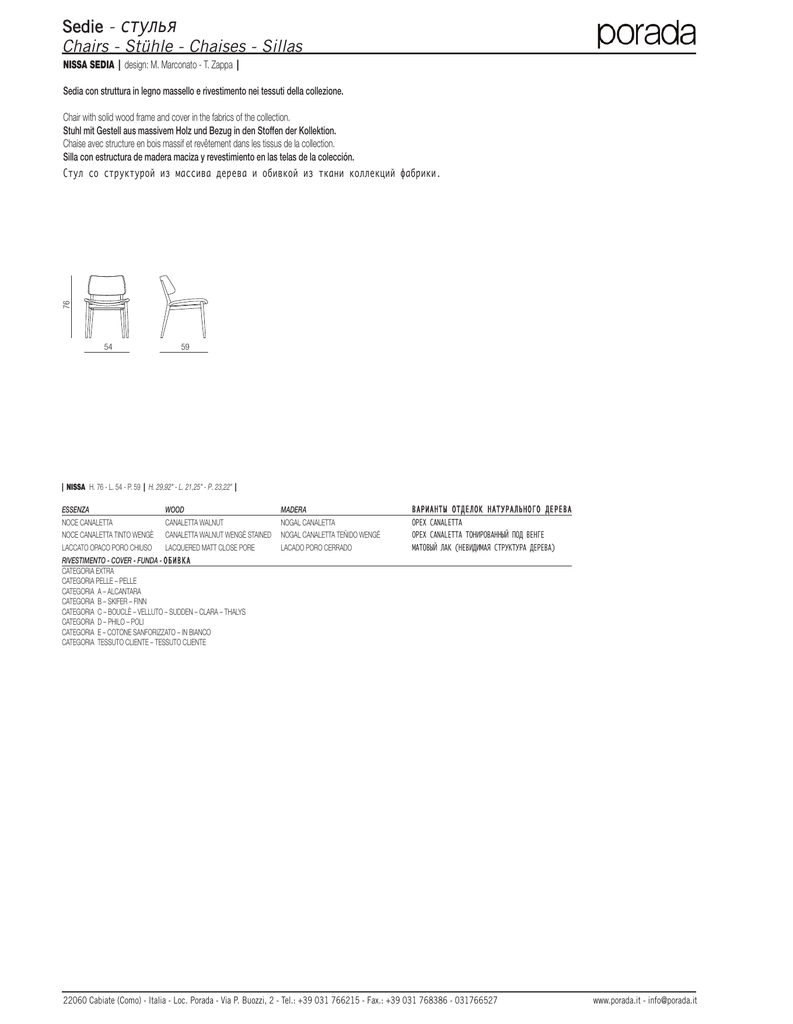 Sedie - cтyлья Chairs - Stühle - Chaises - Sillas NISSA SEDIA | design: M. Marconato - T. Zappa | Sedia con struttura in legno massello e rivestimento nei tessuti della collezione. 76 Chair with solid wood frame and cover in the fabrics of the collection. Stuhl mit Gestell aus massivem Holz und Bezug in den Stoffen der Kollektion. Chaise avec structure en bois massif et revêtement dans les tissus de la collection. Silla con estructura de madera maciza y revestimiento en las telas de la colección. Стул со структурой из массива дерева и обивкой из ткани коллекций фабрики. 54 59 | NISSA H. 76 - L. 54 - P. 59 | H. 29,92" - L. 21,25" - P. 23,22" | ESSENZA WOOD NOCE CANALETTA CANALETTA WALNUT NOCE CANALETTA TINTO WENGÈ CANALETTA WALNUT WENGÈ STAINED LACCATO OPACO PORO CHIUSO LACQUERED MATT CLOSE PORE RIVESTIMENTO - COVER - FUNDA - О Б И В К А CATEGORIA EXTRA CATEGORIA PELLE – PELLE CATEGORIA A – ALCANTARA CATEGORIA B – SKIFER – FINN CATEGORIA C – BOUCLÈ – VELLUTO – SUDDEN – CLARA – THALYS CATEGORIA D – PHILO – POLI CATEGORIA E – COTONE SANFORIZZATO – IN BIANCO CATEGORIA TESSUTO CLIENTE – TESSUTO CLIENTE MADERA NOGAL CANALETTA NOGAL CANALETTA TEÑIDO WENGÉ LACADO PORO CERRADO ВАРИАНТЫ ОТДЕЛОК НАТУРАЛЬНОГО ДЕРЕВА ОРЕХ CANALETTA ОРЕХ CANALETTA ТОНИРОВАННЫЙ ПОД ВЕНГЕ МАТОВЫЙ ЛАК (НЕВИДИМАЯ СТРУКТУРА ДЕРЕВА) 22060 Cabiate (Como) - Italia - Loc. Porada - Via P. Buozzi, 2 - Tel.: +39 031 766215 - Fax.: +39 031 768386 - 031766527 www.porada.it - [email protected] Sedie - cтyлья Chairs - Stühle - Chaises - Sillas NISSA SEDIA CON BRACCIOLI | design: M. Marconato - T. Zappa | Sedia con braccioli con struttura in legno massello e rivestimento nei tessuti della collezione. 63 76 Chair with arms with solid wood frame and cover in the fabrics of the collection. Stuhl mit Lehnen mit Gestell aus massivem Holz und Bezug in den Stoffen der Kollektion. Chaise avec accoudoirs avec structure en bois massif et revêtement dans les tissus de la collection. Silla con brazos con estructura en madera maciza y revestimiento en las telas de la colección. 62 60 | NISSA CON BRACCIOLI H. 76 - L. 62 - P. 60 | H. 29,92" - L. 24,40" - P. 23,62" | ESSENZA WOOD NOCE CANALETTA CANALETTA WALNUT NOCE CANALETTA TINTO WENGÈ CANALETTA WALNUT WENGÈ STAINED LACCATO OPACO PORO CHIUSO LACQUERED MATT CLOSE PORE RIVESTIMENTO - COVER - FUNDA - О Б И В К А CATEGORIA EXTRA CATEGORIA PELLE – PELLE CATEGORIA A – ALCANTARA CATEGORIA B – SKIFER – FINN CATEGORIA C – BOUCLÈ – VELLUTO – SUDDEN – CLARA – THALYS CATEGORIA D – PHILO – POLI CATEGORIA E – COTONE SANFORIZZATO – IN BIANCO CATEGORIA TESSUTO CLIENTE – TESSUTO CLIENTE MADERA NOGAL CANALETTA NOGAL CANALETTA TEÑIDO WENGÉ LACADO PORO CERRADO ВАРИАНТЫ ОТДЕЛОК НАТУРАЛЬНОГО ДЕРЕВА ОРЕХ CANALETTA ОРЕХ CANALETTA ТОНИРОВАННЫЙ ПОД ВЕНГЕ МАТОВЫЙ ЛАК (НЕВИДИМАЯ СТРУКТУРА ДЕРЕВА) 22060 Cabiate (Como) - Italia - Loc. Porada - Via P. Buozzi, 2 - Tel.: +39 031 766215 - Fax.: +39 031 768386 - 031766527 www.porada.it - [email protected]