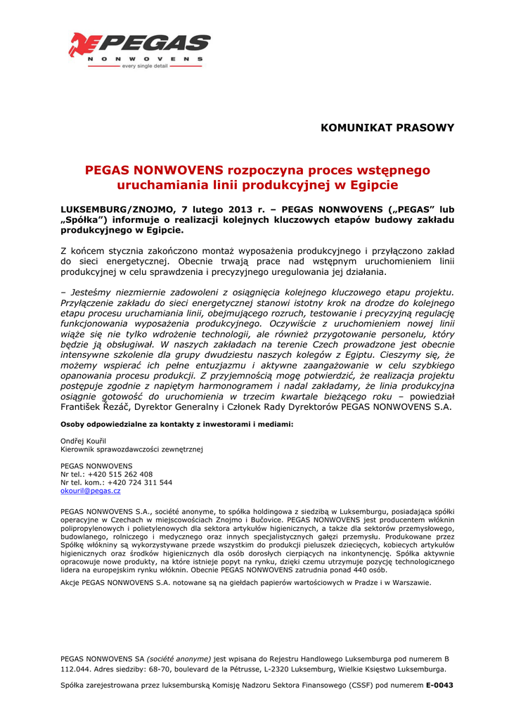 KOMUNIKAT PRASOWY PEGAS NONWOVENS rozpoczyna proces wstępnego uruchamiania linii produkcyjnej w Egipcie LUKSEMBURG/ZNOJMO, 7 lutego 2013 r. – PEGAS NONWOVENS („PEGAS” lub „Spółka”) informuje o realizacji kolejnych kluczowych etapów budowy zakładu produkcyjnego w Egipcie. Z końcem stycznia zakończono montaż wyposażenia produkcyjnego i przyłączono zakład do sieci energetycznej. Obecnie trwają prace nad wstępnym uruchomieniem linii produkcyjnej w celu sprawdzenia i precyzyjnego uregulowania jej działania. – Jesteśmy niezmiernie zadowoleni z osiągnięcia kolejnego kluczowego etapu projektu. Przyłączenie zakładu do sieci energetycznej stanowi istotny krok na drodze do kolejnego etapu procesu uruchamiania linii, obejmującego rozruch, testowanie i precyzyjną regulację funkcjonowania wyposażenia produkcyjnego. Oczywiście z uruchomieniem nowej linii wiąże się nie tylko wdrożenie technologii, ale również przygotowanie personelu, który będzie ją obsługiwał. W naszych zakładach na terenie Czech prowadzone jest obecnie intensywne szkolenie dla grupy dwudziestu naszych kolegów z Egiptu. Cieszymy się, że możemy wspierać ich pełne entuzjazmu i aktywne zaangażowanie w celu szybkiego opanowania procesu produkcji. Z przyjemnością mogę potwierdzić, że realizacja projektu postępuje zgodnie z napiętym harmonogramem i nadal zakładamy, że linia produkcyjna osiągnie gotowość do uruchomienia w trzecim kwartale bieżącego roku – powiedział František Řezáč, Dyrektor Generalny i Członek Rady Dyrektorów PEGAS NONWOVENS S.A. Osoby odpowiedzialne za kontakty z inwestorami i mediami: Ondřej Kouřil Kierownik sprawozdawczości zewnętrznej PEGAS NONWOVENS Nr tel.: +420 515 262 408 Nr tel. kom.: +420 724 311 544 [email protected] PEGAS NONWOVENS S.A., société anonyme, to spółka holdingowa z siedzibą w Luksemburgu, posiadająca spółki operacyjne w Czechach w miejscowościach Znojmo i Bučovice. PEGAS NONWOVENS jest producentem włóknin polipropylenowych i polietylenowych dla sektora artykułów higienicznych, a także dla sektorów przemysłowego, budowlanego, rolniczego i medycznego oraz innych specjalistycznych gałęzi przemysłu. Produkowane przez Spółkę włókniny są wykorzystywane przede wszystkim do produkcji pieluszek dziecięcych, kobiecych artykułów higienicznych oraz środków higienicznych dla osób dorosłych cierpiących na inkontynencję. Spółka aktywnie opracowuje nowe produkty, na które istnieje popyt na rynku, dzięki czemu utrzymuje pozycję technologicznego lidera na europejskim rynku włóknin. Obecnie PEGAS NONWOVENS zatrudnia ponad 440 osób. Akcje PEGAS NONWOVENS S.A. notowane są na giełdach papierów wartościowych w Pradze i w Warszawie. PEGAS NONWOVENS SA (société anonyme) jest wpisana do Rejestru Handlowego Luksemburga pod numerem B 112.044. Adres siedziby: 68-70, boulevard de la Pétrusse, L-2320 Luksemburg, Wielkie Księstwo Luksemburga. Spółka zarejestrowana przez luksemburską Komisję Nadzoru Sektora Finansowego (CSSF) pod numerem E-0043 Podstawowe informacje na temat budowy zakładu produkcyjnego w Egipcie: Wytwórnia będzie zlokalizowana w strefie przemysłowej, niedaleko położonego pod Kairem Miasta 6 Października. Przewiduje się, że pierwsza linia, o zdolnościach produkcyjnych ok. 20 tys. ton rocznie (w zależności od portfela produktów), zostanie oddana do użytku w trzecim kwartale 2013 r. W wypadku korzystnej koniunktury rynkowej w regionie Spółka planuje rozbudowę zakładu w latach 2015–2016 o kolejną linię, która zwiększy moce produkcyjne zakładu do 45–50 tys. ton rocznie. Dzięki zawarciu umowy z dużym odbiorcą, PEGAS zapewnił sobie zbyt większości wyrobów, jakie będzie produkował zakład w Egipcie. Zdjęcia z budowy PEGAS NONWOVENS SA (société anonyme) jest wpisana do Rejestru Handlowego Luksemburga pod numerem B 112.044. Adres siedziby: 68-70, boulevard de la Pétrusse, L-2320 Luksemburg, Wielkie Księstwo Luksemburga. Spółka zarejestrowana przez luksemburską Komisję Nadzoru Sektora Finansowego (CSSF) pod numerem E-0043