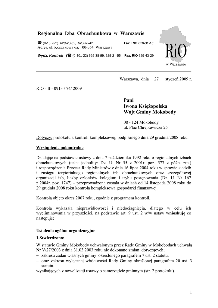 Regionalna Izba Obrachunkowa w Warszawie (0-10..-22) 628-28-62, 628-78-42, Adres, ul. Koszykowa 6a, 00-564 Warszawa Fax. RIO 628-31-16 Wydz. Kontroli ( (0-10..-22) 625-38-59, 625-21-55, Fax. RIO 629-43-29 Warszawa, dnia 27 styczeń 2009 r. RIO - II - 0913 / 74/ 2009 Pani Iwona KsięŜopolska Wójt Gminy Mokobody 08 - 124 Mokobody ul. Plac Chreptowicza 25 Dotyczy: protokołu z kontroli kompleksowej, podpisanego dnia 29 grudnia 2008 roku. Wystąpienie pokontrolne Działając na podstawie ustawy z dnia 7 października 1992 roku o regionalnych izbach obrachunkowych (tekst jednolity: Dz. U. Nr 55 z 2001r. poz. 577 z późn. zm.) i rozporządzenia Prezesa Rady Ministrów z dnia 16 lipca 2004 roku w sprawie siedzib i zasięgu terytorialnego regionalnych izb obrachunkowych oraz szczegółowej organizacji izb, liczby członków kolegium i trybu postępowania (Dz. U. Nr 167 z 2004r. poz. 1747) – przeprowadzona została w dniach od 14 listopada 2008 roku do 29 grudnia 2008 roku kontrola kompleksowa gospodarki finansowej. Kontrolą objęto okres 2007 roku, zgodnie z programem kontroli. Kontrola wykazała nieprawidłowości i niedociągnięcia, dlatego w celu ich wyeliminowania w przyszłości, na podstawie art. 9 ust. 2 w/w ustaw wnioskuję co następuje: Ustalenia ogólno-organizacyjne 1.Stwierdzono: W statucie Gminy Mokobody uchwalonym przez Radę Gminy w Mokobodach uchwałą Nr V/27/2003 z dnia 31.03.2003 roku nie dokonano zmian dotyczących; − zakresu zadań własnych gminy określonego paragrafem 7 ust. 2 statutu. − oraz zakresu wyłącznej właściwości Rady Gminy określonej paragrafem 20 ust. 3 statutu. wynikających z nowelizacji ustawy o samorządzie gminnym (str. 2 protokołu). 1 Wnioskuję: Stosownie do zmian wynikających z nowelizacji ustawy z dnia 08 marca 1990 roku o samorządzie gminnym (tekst jednolity z 2001 roku, Dz. U. Nr 142, poz. 1591 z późniejszymi zmianami) przedkładać Radzie Gminy w Mokobodach projekt odpowiednich zmian statutu Gminy Mokobody celem ich uchwalenia. Księgowość, sprawozdawczość budŜetowa 2.Stwierdzono: Zapisy w księdze głównej za czerwiec 2007 roku nie zawierają określenia rodzaju i numerów dowodów księgowych na podstawie których dokonano zaksięgowania operacji gospodarczych (str. 8 protokołu). Wnioskuję: W zapisach księgi głównej uwzględnić określenie rodzaju i numeru identyfikacyjnego dowodu księgowego stanowiącego podstawę zapisu zgodnie z art. 23 ust. 2 pkt 2 ustawy z dnia 29 września o rachunkowości (tekst jednolity z 2002 roku, Dz. U. Nr 76, poz. 694 z późniejszymi zmianami). Gospodarka pienięŜna i rozrachunki 3.Stwierdzono: Dwa raporty kasowe sporządzone w sierpniu 2007 roku w zakresie wpłat opłaty targowej i wpłat za wydane dowody osobiste nie były prowadzone na bieŜąco (str. 12 protokołu). Wnioskuję: W zakresie raportów kasowych przestrzegać obowiązku bieŜącego ich sporządzania, co wynika z art. 24 ust. 5 pkt 3 ustawy z dnia 29 września 1994 roku (tekst jednolity z 2002 roku, Dz. U. Nr 76, poz. 694 z późniejszymi zmianami). Wykonanie budŜetu 4. Stwierdzono: Nie opracowanie projektu Gminnego Programu Przeciwdziałania Narkomanii na rok 2007 (str. 17 protokołu). Wnioskuję: W przyszłości Wójt Gminy w celu realizacji zadań z zakresu przeciwdziałania narkomanii w myśl postanowień art. 10 ust. 2 i 3 ustawy z dnia 29 lipca 2005 roku o przeciwdziałaniu narkomanii (Dz. U. z 2005 r. Nr 175 poz. 1485 z późn. zm.) winien opracować projekt Gminnego Programu Przeciwdziałania Narkomanii, a następnie przedłoŜyć Radzie Gminy celem uchwalenia. 5.Stwierdzono: Nie dokonanie od 1 kwietnia 2007 roku opodatkowania gruntów związanych z prowadzeniem działalności gospodarczej zadeklarowanych przez podatnika w informacji nieruchomości i obiektów budowlanych (str. 20 - 21 protokołu). Wnioskuję: Powierzchnie związane z prowadzoną działalnością gospodarczą deklarowane przez podatników w informacjach nieruchomości i obiektów budowlanych obejmować obowiązkiem podatkowym od pierwszego dnia miesiąca następującego po miesiącu, w którym powstały okoliczności uzasadniające powstanie tego obowiązku, co wynika art. 6 ust. 1 ustawy z dnia 12 stycznia 1991 roku o podatkach i opłatach lokalnych (tekst jednolity: Dz. U. z 2006 r. Nr 121, poz. 844 z późn. zm.). 2 6. Stwierdzono: W stosunku do 5 podatników nieprawidłowo przyjęto okres opodatkowania podatkiem od nieruchomości (str. 22 protokołu). Wnioskuję: JeŜeli okolicznością, od której jest uzaleŜniony obowiązek podatkowy, jest istnienie budowli albo budynku lub ich części, zgodnie z art. 6 ust. 2 ustawy z dnia 12 stycznia 1991 roku o podatkach i opłatach lokalnych (Dz. U. z 2006 r. Nr 121, poz. 844 z późn. zm.) obejmować z dniem 1 stycznia roku następującego po roku, w którym budowa została zakończona albo w którym rozpoczęto uŜytkowanie budowli albo budynku lub ich części przed ich ostatecznym wykończeniem. 7. Stwierdzono: Nie dokonanie czynności sprawdzających w zakresie zgodności danych wykazanych w informacjach złoŜonymi przez podatników podatku od nieruchomości stanowiącej podstawę wymiaru podatku z dokumentami przedstawionymi przez Powiatowego Inspektora Nadzoru Budowlanego w Siedlcach (str. 24 protokołu). Wnioskuję: Stosownie do art. 274 § 1 oraz art. 281 § 1 ustawy z dnia 29 sierpnia 1997 roku Ordynacja podatkowa (tekst jednolity: Dz. U. z 2005 r. Nr 8, poz. 60 z późn. zm.) organ podatkowy winien dokonywać czynności sprawdzających mających na celu ustalenie stanu faktycznego w zakresie niezbędnym do stwierdzenia jego zgodności z przedstawionymi dokumentami. W razie wątpliwości co do rzetelności danych zawartych w deklaracji organ podatkowy winien równieŜ wezwać w trybie art. 274 a § 2 cytowanej ustawy do udzielenia, w wyznaczonym terminie, niezbędnych wyjaśnień lub uzupełnienia deklaracji, wskazując przyczyny podania w wątpliwość rzetelności danych w niej zawa