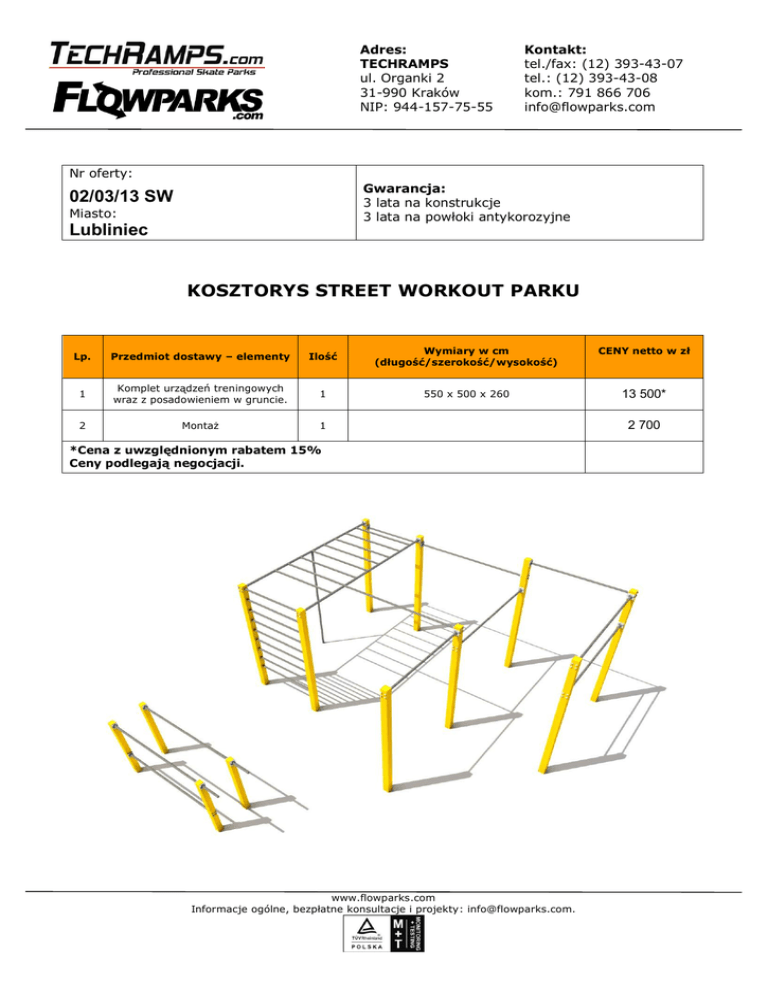 Adres: TECHRAMPS ul. Organki 2 31-990 Kraków NIP: 944-157-75-55 Kontakt: tel./fax: (12) 393-43-07 tel.: (12) 393-43-08 kom.: 791 866 706 [email protected] Nr oferty: Gwarancja: 3 lata na konstrukcje 3 lata na powłoki antykorozyjne 02/03/13 SW Miasto: Lubliniec KOSZTORYS STREET WORKOUT PARKU Lp. Przedmiot dostawy – elementy Ilość Wymiary w cm (długość/szerokość/wysokość) CENY netto w zł 1 Komplet urządzeń treningowych wraz z posadowieniem w gruncie. 1 550 x 500 x 260 13 500* 2 Montaż 1 *Cena z uwzględnionym rabatem 15% Ceny podlegają negocjacji. www.flowparks.com Informacje ogólne, bezpłatne konsultacje i projekty: [email protected]. 2 700 Adres: TECHRAMPS ul. Organki 2 31-990 Kraków NIP: 944-157-75-55 Kontakt: tel./fax: (12) 393-43-07 tel.: (12) 393-43-08 kom.: 791 866 706 [email protected] www.flowparks.com Informacje ogólne, bezpłatne konsultacje i projekty: [email protected]. Adres: TECHRAMPS ul. Organki 2 31-990 Kraków NIP: 944-157-75-55 Kontakt: tel./fax: (12) 393-43-07 tel.: (12) 393-43-08 kom.: 791 866 706 [email protected] www.flowparks.com Informacje ogólne, bezpłatne konsultacje i projekty: [email protected]. Adres: TECHRAMPS ul. Organki 2 31-990 Kraków NIP: 944-157-75-55 Kontakt: tel./fax: (12) 393-43-07 tel.: (12) 393-43-08 kom.: 791 866 706 [email protected] SPECYFIKACJA STREET WORKOUT PARKU Wymagania dot. Urządzeń: Wszystkie rury koliste użyte do produkcji muszą mieć średnicę min. 33,7 mm i grubość ścianki większą niż 3,1 mm. Dopuszcza się stosowanie litych prętów ciągnionych dla długości pojedynczego elementu większej od 1,5 m. Każda rura musi być galwanizowana oraz pomalowana proszkowo na kolor żółty – RAL 1023 lub ciemnoszary RAL 9011 (dla rur i prętów 1”). Wszystkie łączenia rur muszą być zespolone w sposób uniemożliwiający wystawanie ostrych krawędzi. Dopuszcza się łączenie poszczególnych modułów Parku przy użyciu czopów rurowych oraz śrub o średnicy nie mniejszej niż 12 mm. Wszystkie śruby muszą być zabezpieczone zaślepkami polimerowymi. Wszystkie ostre krawędzie musza być zaokrąglone. Każdy element i konstrukcja spawana musi być wykonana przez spawacza z minimum 5-letnim doświadczeniem. Dopuszcza się stosowanie złączy systemowych zabezpieczonych przed korozją (np. żeliwnych). Dopuszcza się zastosowanie elementów z tworzywa sztucznego. Konstrukcja Parku musi zostać przymocowana do podłoża na głębokość minimum 15% wysokości słupa lub przeszkody za pomocą śrub montażowych (min. 4 śruby na jeden słup) lub poprzez zabetonowanie stopy. Dopuszcza się zmianę wymiarów urządzeń o 6%. Nie jest wymagana bezpieczna nawierzchnia. Dopuszcza się umiejscowienie urządzeń na podłożu naturalnym (trawa, piasek, żwir). Wymagania dot. Wykonawcy: Wykonawca udzieli co najmniej trzyletniej gwarancji na konstrukcję urządzeń i elementy metalowe wraz z ich zabezpieczeniem antykorozyjnym. Wykonawcy muszą posiadać doświadczenie w realizacji zadań inwestycyjnych o charakterze i złożoności porównywalnej z zakresem przedmiotu zamówienia. Wykonali i dostarczyli w ciągu ostatnich 5 lat min. 15 skateparków lub parkour parków na kwotę powyżej 100 tys. zł brutto każdy, udokumentowane referencjami. www.flowparks.com Informacje ogólne, bezpłatne konsultacje i projekty: [email protected].