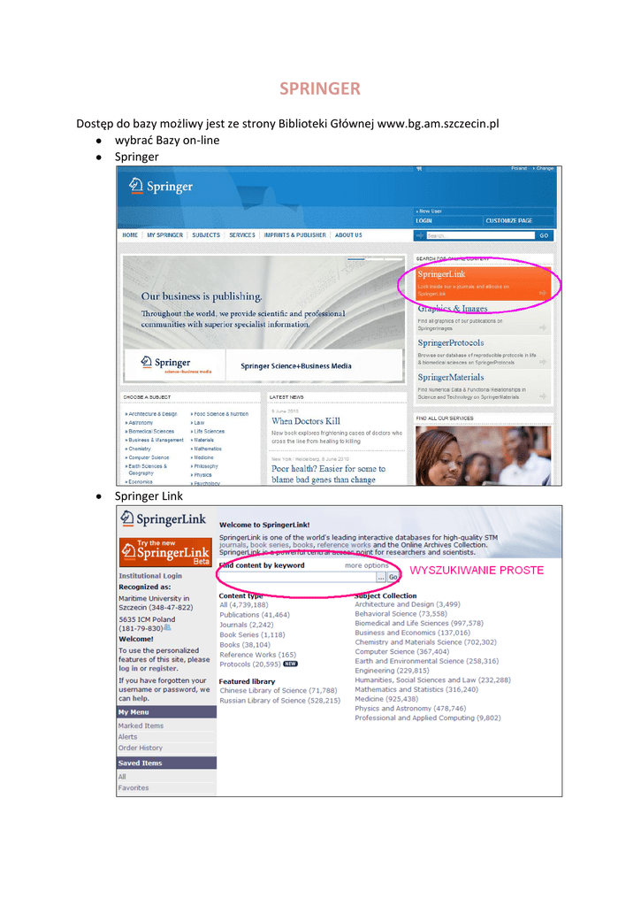 SPRINGER Dostęp do bazy możliwy jest ze strony Biblioteki Głównej www.bg.am.szczecin.pl wybrad Bazy on-line Springer Springer Link Wyszukiwanie zaawansowane możliwe po wybraniu “MORE OPTIONS” WYSZUKIWANIE Podczas przeglądania bazy tak na ekranie wyjściowym, jak i na każdym innym poziomie można wpisad termin wyszukiwawczy (słowo lub kilka słów) w okienku na górze strony. Po wpisaniu terminu w okienko należy kliknąd na przycisk „Go", aby rozpocząd wyszukiwanie artykułów spełniających wytyczone kryteria. Aby otworzyd pełny tekst musi byd zainstalowany na komputerze program Adobe Acrobat. Rezultat prowadzonych poszukiwao zostanie wyświetlony jako lista wyników. Aby otworzyd pełen tekst artykułu należy kliknąd na ikonkę PDF. Po chwili na ekranie wyświetli się tekst, który będzie można wydrukowad lub wysład mailem. Dla uzyskania dokładniejszych wyników wyszukiwania można zastosowad operatory: AND - jeśli użyjemy go między terminami wyszukiwawczymi znajdziemy artykuły zawierające wszystkie te terminy. Wpisując, np.: aspirin AND ulcer AND stomach, znajdziemy artykuły zawierające i słowo „aspirin" i „ulcer" i „stomach". OR - jeśli użyjemy go między terminami wyszukiwawczymi, znajdziemy artykuły zawierające przynajmniej jeden z tych terminów. Wpisując, np.: coral OR reef OR degradation, znajdziemy artykuły zawierające słowo „coral" lub „reef lub „degradation". NOT - jeśli użyjemy go między terminami wyszukiwawczymi, znajdziemy artykuły zawierające pierwszy z nich, ale nie drugi. Wpisując, np.: coral NOT reef znajdziemy artykuły zawierające słowo „coral" bez słowa „reef. ADJ - używamy go kiedy chcemy znaleźd artykuły, w których termin wpisany po operatorze występuje zaraz za terminem wpisanym przed operatorem. Wpisując, np.: coral ADJ reef znajdziemy artykuły, w których słowa „coral" i „reef występują obok siebie w takiej właśnie kolejności. NEAR lub NEAR [n] - jeśli użyjemy go między terminami wyszukiwawczymi znajdziemy artykuły, w których wystąpią one w odległości kilku słów od siebie (najwięcej 10). Wpisując, np.: coral NEAR [5] reef znajdziemy artykuły, w których słowo „coral" i słowo „reef występują w odległości 5 słów od siebie. NALEŻY PAMIĘTAĆ, ŻE OPERATORY MUSZĄ BYĆ ZAPISYWANE DUŻYMI LITERAMI (w przeciwieostwie do innych terminów wyszukiwawczych). Znak („’’) wokół terminu oznacza, że poszukujemy dokładnie takiej frazy. Wpisując np. „coral reef degradation’’, znajdziemy artykuły zwierające słowa wpisane w cudzysłowie w takiej właśnie kolejności. Nawiasów ( ) używamy, aby zaznaczyd kolejnośd poszukiwao. Wpisując, np.: blood AND brain OR barrier, znajdziemy dokumenty zwierające słowo „blood" i słowo „brain" lub słowo „barrier". Szukając dokumentów zawierających słowo „blood" i słowa „brain" lub „barrier" należy wpisad: blood AND (brain OR barrier). Wpisując w okienko słowo, którego poszukujemy możemy użyd znaku (*) wpisanego po kilku pierwszych literach słowa. Umożliwi to wyszukanie większej ilości pokrewnych terminów. Wpisując, np.: micro*, znajdziemy artykuły zawierające słowa „microscope", „microcomputer", „micron".
