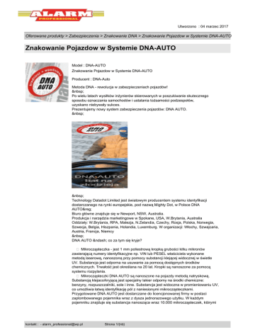 Utworzono : 04 marzec 2017 Oferowane produkty > Zabezpieczenia > Znakowanie DNA > Znakowanie Pojazdow w Systemie DNA-AUTO Znakowanie Pojazdow w Systemie DNA-AUTO Model : DNA-AUTO Znakowanie Pojazdow w Systemie DNA-AUTO Producent : DNA-Auto Metoda DNA - rewolucja w zabezpieczeniach pojazdów! Po wielu latach wysiłków inżynierów skierowanych w poszukiwanie skutecznego sposobu oznaczania samochodów i ustalania tożsamości podzespołów, uzyskano niebywały sukces. Prezentujemy nowy system zabezpieczenia pojazdów: DNA AUTO. Technology Datadot Limited jest światowym producentem systemu identyfikacji dostarczanego na rynki europejskie, pod nazwą Mighty Dot, w Polsce DNA AUTO® Biuro główne znajduje się w Newport, NSW, Australia. Produkcja i narzędzia marketingowe w Spokane, USA, W.Brytania, Australia Oddziały: W.Brytania, RPA, Malezja, N.Zelandia, Czechy, Rosja, Polska, Norwegia, Szwecja, Belgia, Hiszpania, Holandia, Luxemburg. W organizacji: Włochy, Szwajcaria, Austria, Francja, Niemcy DNA AUTO – co za tym się kryje? � Mikrocząsteczka - jest 1 mm poliestrową kropką grubości kilku mikronów zawierającą numery identyfikacyjne np. VIN lub PESEL właściciela wykonane metodą laserową, nanoszoną przy pomocy substancji klejącej widocznej w świetle UV. Substancja jest odporna na usuwanie za pomocą dostępnych środków chemicznych. Trwałość jest określana na 20 lat. Kropki są nanoszone za pomocą systemu rozpylania. � Mikrocząsteczki DNA AUTO są nanoszone na pojazdy metodą natryskową. Substancją klejaco/kryjącą jest specjalny lakier odporny na środki chemiczne: benzyny, rozpuszczalniki, sole i inne. Substancja jest widoczna w promieniowaniu UV, co umożliwia łatwą identyfikację pól z naniesionymi mikrocząsteczkami. Przygotowane DNA AUTO jest dostarczane do licencjonowanej firmy w postaci zaplombowanego pojemnika wraz z dysza jednorazowego użytku. W każdym pojemniku znajduje się substancja nanosząca wraz 10.000 mikrocząsteczek, którymi kontakt : - [email protected] Strona 1/{nb} Utworzono : 04 marzec 2017 Oferowane produkty > Zabezpieczenia > Znakowanie DNA > Znakowanie Pojazdow w Systemie DNA-AUTO Znakowanie Pojazdow w Systemie DNA-AUTO pokrywa się w samochodzie ok. 42 „strategicznych” miejsc. Duża ilość mikrocząsteczek, w połączeniu z natryskiwaniem miejsc trudnodostępnych powoduje ze tak oznakowany pojazd przestaje być atrakcyjnym celem dla przestępcy. Ich usuniecie w celu nadania pojazdowi nowych cech identyfikacyjnych jest wręcz niemożliwe i nieopłacalne. Zastosowanie DNA AUTO powoduje, że próby (przez przestępców) zmiany tożsamości samochodu poprzez tzw. „wszczepienie” nowych numerów identyfikacyjnych takich jak numer VIN w celu nadania cech legalności pojazdu jest bezskuteczne. Jest też w sposób bardzo prosty możliwa precyzyjna identyfikacja części i podzespołów pochodzących z kradzieży. Cena : 0,00 zł Brutto ( 0,00 zł Netto) Dostępność: Produkt dostępny w naszym sklepie od 23 listopad 2010 kontakt : - [email protected] Strona 2/{nb}