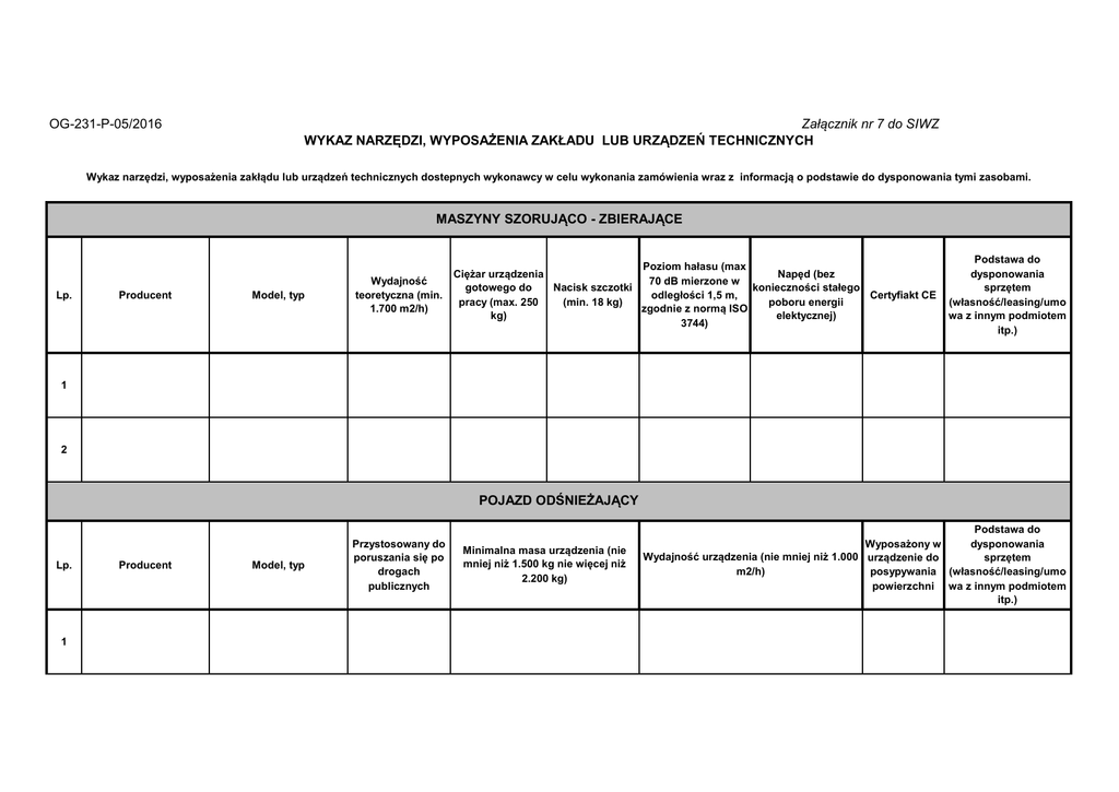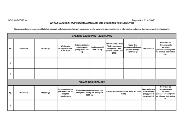 OG-231-P-05/2016 Załącznik nr 7 do SIWZ WYKAZ NARZĘDZI, WYPOSAŻENIA ZAKŁADU LUB URZĄDZEŃ TECHNICZNYCH Wykaz narzędzi, wyposażenia zakłądu lub urządzeń technicznych dostepnych wykonawcy w celu wykonania zamówienia wraz z informacją o podstawie do dysponowania tymi zasobami. MASZYNY SZORUJĄCO - ZBIERAJĄCE Lp. Producent Model, typ Wydajność teoretyczna (min. 1.700 m2/h) Poziom hałasu (max Ciężar urządzenia Napęd (bez 70 dB mierzone w gotowego do Nacisk szczotki konieczności stałego odległości 1,5 m, Certyfiakt CE pracy (max. 250 (min. 18 kg) poboru energii zgodnie z normą ISO kg) elektycznej) 3744) Podstawa do dysponowania sprzętem (własność/leasing/umo wa z innym podmiotem itp.) 1 2 POJAZD ODŚNIEŻAJĄCY Lp. 1 Producent Model, typ Przystosowany do poruszania się po drogach publicznych Minimalna masa urządzenia (nie mniej niż 1.500 kg nie więcej niż 2.200 kg) Podstawa do Wyposażony w dysponowania Wydajność urządzenia (nie mniej niż 1.000 urządzenie do sprzętem m2/h) posypywania (własność/leasing/umo powierzchni wa z innym podmiotem itp.) ZAMIATARKA SPALINOWA Lp. Producent Model, typ Wydajność Moc napędu (min. teoretyczna (min. 3000 W) 3.000 m2/h) Powierzchnia filtracyjna (min. 1,5 m2) Prędkość robocza (min. 4 km/h) Zbiornik na śmieci (min. 30 l.) Ciężar (max. 95 kg) Podstawa do dysponowania sprzętem (własność/leasing/umo wa z innym podmiotem itp.) 1 SPALINOWY ODKURZACZ DO LIŚCI Lp. Producent Model, typ Moc (min 0,6 kW/min. 0,8 KM) Pojemność skokowa cm3 (min. 25 cm3) Wydajność tubiny m3/h (min. 600) Poziom ciśnienia akustycznego dB(A) (max 100 dB(A) Podstawa do Poziom mocy dysponowania akustycznej sprzętem dB(A) - (max (własność/leasing/umo 110 dB(A) wa z innym podmiotem itp.) 1 1. Przed wprowadzeniem maszyn Wykonawca musi przedstawić kartę techniczną urządzęń lub inny dokument z podanym symbolem i nazwą producenta w celu weryfiakcji. …………………………., dnia ………………….. 2016r. ……………………………………………………………….. Podpis osoby (osób) upoważnionej do występowania w imieniu Wykonawcy ( Pożądany czytelny podpis albo podpis i pieczątka z imieniem i nazwiskiem ).
