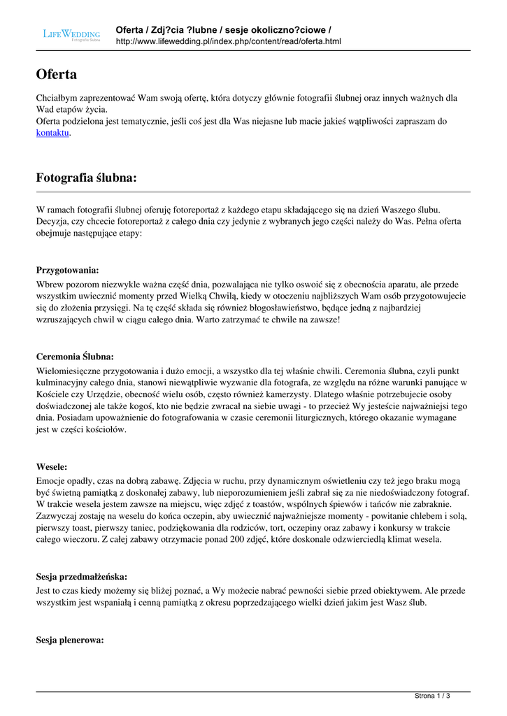 Oferta / Zdj?cia ?lubne / sesje okoliczno?ciowe / http://www.lifewedding.pl/index.php/content/read/oferta.html Oferta Chciałbym zaprezentować Wam swoją ofertę, która dotyczy głównie fotografii ślubnej oraz innych ważnych dla Wad etapów życia. Oferta podzielona jest tematycznie, jeśli coś jest dla Was niejasne lub macie jakieś wątpliwości zapraszam do kontaktu. Fotografia ślubna: W ramach fotografii ślubnej oferuję fotoreportaż z każdego etapu składającego się na dzień Waszego ślubu. Decyzja, czy chcecie fotoreportaż z całego dnia czy jedynie z wybranych jego części należy do Was. Pełna oferta obejmuje następujące etapy: Przygotowania: Wbrew pozorom niezwykle ważna część dnia, pozwalająca nie tylko oswoić się z obecnościa aparatu, ale przede wszystkim uwiecznić momenty przed Wielką Chwilą, kiedy w otoczeniu najbliższych Wam osób przygotowujecie się do złożenia przysięgi. Na tę część składa się również błogosławieństwo, będące jedną z najbardziej wzruszających chwil w ciągu całego dnia. Warto zatrzymać te chwile na zawsze! Ceremonia Ślubna: Wielomiesięczne przygotowania i dużo emocji, a wszystko dla tej właśnie chwili. Ceremonia ślubna, czyli punkt kulminacyjny całego dnia, stanowi niewątpliwie wyzwanie dla fotografa, ze względu na różne warunki panujące w Kościele czy Urzędzie, obecność wielu osób, często również kamerzysty. Dlatego właśnie potrzebujecie osoby doświadczonej ale także kogoś, kto nie będzie zwracał na siebie uwagi - to przecież Wy jesteście najważniejsi tego dnia. Posiadam upoważnienie do fotografowania w czasie ceremonii liturgicznych, którego okazanie wymagane jest w części kościołów. Wesele: Emocje opadły, czas na dobrą zabawę. Zdjęcia w ruchu, przy dynamicznym oświetleniu czy też jego braku mogą być świetną pamiątką z doskonałej zabawy, lub nieporozumieniem jeśli zabrał się za nie niedoświadczony fotograf. W trakcie wesela jestem zawsze na miejscu, więc zdjęć z toastów, wspólnych śpiewów i tańców nie zabraknie. Zazwyczaj zostaję na weselu do końca oczepin, aby uwiecznić najważniejsze momenty - powitanie chlebem i solą, pierwszy toast, pierwszy taniec, podziękowania dla rodziców, tort, oczepiny oraz zabawy i konkursy w trakcie całego wieczoru. Z całej zabawy otrzymacie ponad 200 zdjęć, które doskonale odzwierciedlą klimat wesela. Sesja przedmałżeńska: Jest to czas kiedy możemy się bliżej poznać, a Wy możecie nabrać pewności siebie przed obiektywem. Ale przede wszystkim jest wspaniałą i cenną pamiątką z okresu poprzedzającego wielki dzień jakim jest Wasz ślub. Sesja plenerowa: Strona 1 / 3 Oferta / Zdj?cia ?lubne / sesje okoliczno?ciowe / http://www.lifewedding.pl/index.php/content/read/oferta.html To właśnie sesja plenerowa jest najbardziej wymagającym etapem dla kreatywności fotografa, któremu powierzycie wykonanie tego zadania. Nie jest to typowy reportaż, tylko urzeczywistnianie wspólnych pomysłów i wizji. Ale nie jest to sprawdzian tylko dla fotografa, lecz również dla Was. Dla mnie najważniejsze jest by uchwycić relacje i emocje między Wami, tak by zdjęcia ślubne były pamiątką nie tylko dla Was ale także dzieci i wnucząt. Unikam powielania schematów, lokacji i wcześniej realizowanych koncepcji. Oferta podstawowa składa się z następujących części: 1. Błogosławieństwo 2. Ślub (USC) 3. Wesele 4. Sesja plenerowa W ramach oferty młoda para otrzymuje: - Album tradycyjny wyklejany 40-60 stron (zdjęcia w formacie 15x21 cm). - Płytę DVD zawierającą wykonane zdjęcia w pełnej rozdzielczości (około 300 zdjęć). - Płytę DVD z prezentacją (slideshow). Dodatkowo oferuję: 1. Sesja przedmałżeńska (zaręczynowa). 2. Przygotowania ślubne. 3. Fotoksiążka. 4. Dodatkowe albumy. Chrzty Oferta podstawowa składa się z: 1. Przygotowania. 2. Chrzest. W ramach oferty klient otrzymuje: - Album tradycyjny wyklejany 20 stron (zdjęcia w formacie 15x21 cm). - Płytę DVD zawierającą wykonane zdjęcia w pełnej rozdzielczości (około 60 zdjęć). - Płytę DVD z prezentacją (slideshow). Dodatkowo możliwość wykonana sesji plenerowej lub domowej. Strona 2 / 3 Oferta / Zdj?cia ?lubne / sesje okoliczno?ciowe / http://www.lifewedding.pl/index.php/content/read/oferta.html Komunie Pierwsza Komunia to bardzo ważny dzień dla Waszego dziecka, ale także dla Was. W ramach fotoreportażu proponuję wykonanie zdjęć w domu w trakcie przygotowań, następnie w kościele (o ile jest zgoda na fotografowanie przez fotografa innego niż wspólny dla całej uroczystości kościelnej) oraz w trakcie poczęstunku po uroczystościach. Dodatkowo oferuję sesję plenerową z rodzicami oraz rodzicami chrzestnymi. Fotografia rodzinna Każdy z nas oglądając zdjęcia w katalogach myśli czasem, że sam chciałby takie mieć. Dlaczego więc nie zrobić profesjonalnej sesji fotograficznej sobie i swojej rodzinie? W ramach usługi oferuję zdjęcia rodzinne, które możemy zrealizować zarówno w plenerze jak też u Was w domu. Fotografia reklamowa Fotografowanie obiektów, budynków, zdjęcia produktowe (packshot). Przygotowanie graficzne do druku oraz profesjonalny druk folderów i katalogów. Druk wielkoformatowy Możliwość wydruków zdjęć na wielkoformatowych maszynach solwentowych o dużej rozdzielczości. Wydruki możliwe na materiałach takich jak: papier, baner, pleksa, aluminium, szkło. Strona 3 / 3