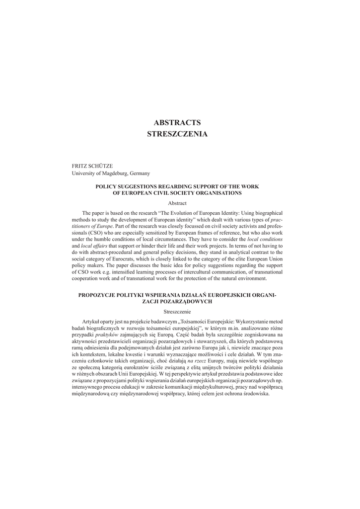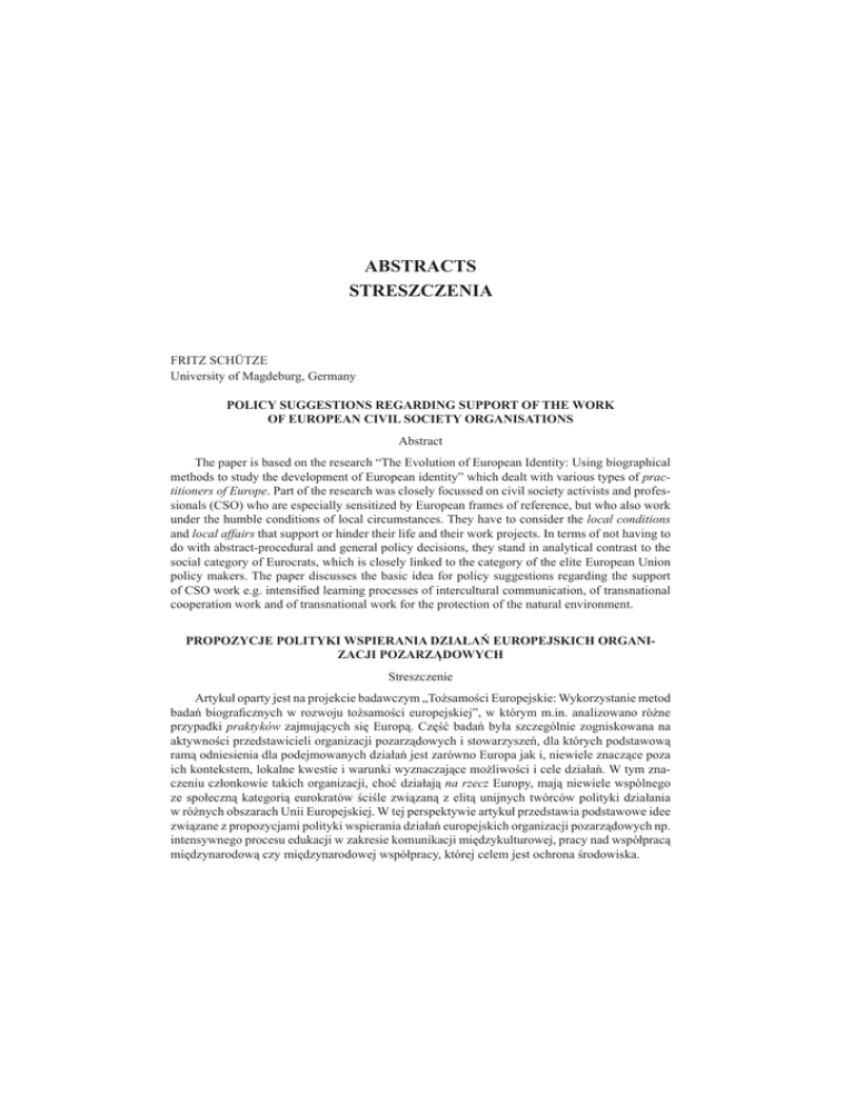 ABSTRACTS STRESZCZENIA FRITZ SCHÜTZE University of Magdeburg, Germany POLICY SUGGESTIONS REGARDING SUPPORT OF THE WORK OF EUROPEAN CIVIL SOCIETY ORGANISATIONS Abstract The paper is based on the research “The Evolution of European Identity: Using biographical methods to study the development of European identity” which dealt with various types of practitioners of Europe. Part of the research was closely focussed on civil society activists and professionals (CSO) who are especially sensitized by European frames of reference, but who also work under the humble conditions of local circumstances. They have to consider the local conditions and local affairs that support or hinder their life and their work projects. In terms of not having to do with abstract-procedural and general policy decisions, they stand in analytical contrast to the social category of Eurocrats, which is closely linked to the category of the elite European Union policy makers. The paper discusses the basic idea for policy suggestions regarding the support of CSO work e.g. intensified learning processes of intercultural communication, of transnational cooperation work and of transnational work for the protection of the natural environment. PROPOZYCJE POLITYKI WSPIERANIA DZIAŁAŃ EUROPEJSKICH ORGANIZACJI POZARZĄDOWYCH Streszczenie Artykuł oparty jest na projekcie badawczym „Tożsamości Europejskie: Wykorzystanie metod badań biograficznych w rozwoju tożsamości europejskiej”, w którym m.in. analizowano różne przypadki praktyków zajmujących się Europą. Część badań była szczególnie zogniskowana na aktywności przedstawicieli organizacji pozarządowych i stowarzyszeń, dla których podstawową ramą odniesienia dla podejmowanych działań jest zarówno Europa jak i, niewiele znaczące poza ich kontekstem, lokalne kwestie i warunki wyznaczające możliwości i cele działań. W tym znaczeniu członkowie takich organizacji, choć działają na rzecz Europy, mają niewiele wspólnego ze społeczną kategorią eurokratów ściśle związaną z elitą unijnych twórców polityki działania w różnych obszarach Unii Europejskiej. W tej perspektywie artykuł przedstawia podstawowe idee związane z propozycjami polityki wspierania działań europejskich organizacji pozarządowych np. intensywnego procesu edukacji w zakresie komunikacji międzykulturowej, pracy nad współpracą międzynarodową czy międzynarodowej współpracy, której celem jest ochrona środowiska. 2 ABSTRACTS / STRESZCZENIA ANETA KRZEWIŃSKA University of Łódź TOMORROW’S EUROPE DELIBERATIVE POLL® AS A PROPOSAL TO RESEARCH EUROPEAN PUBLIC OPINION Abstract This article discusses a project known as Tomorrow’s Europe deliberative poll®, whose participants consisted of inhabitants of the 27 Member State countries of the European Union. The first section of the article presents the stages of that interesting study and briefly describes its most important results. The second section discusses essential issues to potential organizers of such polls, and more importantly to interpreters of the research data. It focuses on issues such as: problems related to conducting deliberations in a multi-lingual environment; the acculturation of the research method itself; the possibilities for researching Europea public opinion; and benefits resulting from this type of study. SONDAŻ DELIBERATYWNY® TOMORROW’S EUROPE JAKO PROPOZYCJA BADANIA EUROPEJSKIEJ OPINII PUBLICZNEJ Streszczenie W artykule prezentuję sondaż deliberatywny® Tomorrow’s Europe, którego uczestnikami byli mieszkańcy 27 krajów-członków Unii Europejskiej. W pierwszej części artykułu przedstawiam etapy tego interesującego badania i pokrótce referuję jego najważniejsze rezultaty. Druga część poświęcona jest omówieniu kwestii istotnych dla potencjalnych organizatorów, a co ważniejsze interpretatorów otrzymanych rezultatów badań. Moja uwaga skupia się m.in. na: problemie związanym z prowadzeniem deliberacji w wielu językach, kwestii dotyczącej akulturacji samej metody badawczej, możliwościach zbadania europejskiej opinii publicznej oraz korzyściach wynikające z realizacji tego typu badań. JAKUB RYSZARD STEMPIEŃ Uniwersytet Medyczny w Łodzi USE OF THE “PRINCIPAL-AGENT” MODEL IN THE PROCESS OF INVESTIGATING AND ANALYZING REPRESENTATIVE DEMOCRACATIC SYSTEMS Abstract This article presents the basic elements of the “Principal-Agent” model. Some of the reasons for applying this economic model to the process of investigating and analyzing contemporary systems of representative democracies are given. The main point of the analysis is the problem of cognitive/ informational asymmetry among the Principal-Agent relation. Thompson’s strategies for diminishing the consequences of this asymmetry are scrutinized. From this point of view the currently growing demand for accountability and transparency of governments’ actions is discussed in the ABSTRACTS / STRESZCZENIA 3 article. Four possible ways of holding central and local governments accountable are proposed and analyzed. The author’s own proposal is to use three criteria – effectiveness, scope, and civic status – to describe and deliberate on the various forms for holding government accountable. The criteria and the perspective offered by the “Principal-Agent” model are also used in order to describe and analyze the activities of watchdog NGOs. Finally, some proposals are suggested for implementing the “Principal-Agent” model into research practice (both methodologically and thematically). MOŻLIWOŚCI I SKUTKI ZASTOSOWANIA MODELU “PRINCIPAL –AGENT” W BADANIU I ANALIZOWANIU SYSTEMU REPREZENTATYWNEJ DEMOKRACJI Streszczenie Artykuł przedstawia podstawy modelu “Principal-agent”. Sugeruje się niektóre przyczyny zastosowania tego ekonomicznego modelu do badania i analizowania współczesnych systemów reprezentatywnej demokracji. Głównym elementem analizy jest problem pozn