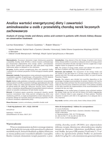 538 Probl Hig Epidemiol 2011, 92(3): 538-540 Analiza wartości energetycznej diety i zawartości aminokwasów u osób z przewlekłą chorobą nerek leczonych zachowawczo Analysis of energy intake and dietary amino acid content in patients with chronic kidney disease on conservative treatment Lucyna Kozłowska 1/, Danuta Gajewska 1/, Robert Małecki 2/ Katedra Dietetyki, Wydział Nauk o Żywieniu Człowieka i Konsumpcji, Szkoła Główna Gospodarstwa Wiejskiego (SGGW) w Warszawie 2/ Oddział Chorób Wewnętrznych i Nefrologii, Miejski Szpital Specjalistyczny w Warszawie 1/ Wprowadzenie. Kluczowym elementem terapii dietetycznej pacjentów z przewlekłą chorobą nerek (PCHN) w okresie leczenia zachowawczego jest dostarczenie odpowiedniej ilości energii, białka i aminokwasów (AA) w diecie. Zarówno zbyt wysoka jak i zbyt niska podaż mają bardzo niekorzystny wpływ na rokowanie w tym schorzeniu. Cel pracy. Analiza wartości energetycznej diety oraz zawartości białka i wybranych AA w dietach pacjentów z PCHN stosujących dowolny sposób żywienia. Materiały i metody. Przeprowadzono ocenę wybranych parametrów diety na podstawie wywiadu 24-godzinnego u 28 pacjentów z PCHN. Badania wykonano w 2003 r. w ramach Programu Zapobiegania Mocznicy. Wyniki. Badane osoby podzielono na kwartyle w zależności od procentowej realizacji zaleceń na białko na poziomie średniego zapotrzebowania dla osób dorosłych. Osoby z Q1 miały najniższą wartość energetyczną diety i niższą od zaleceń podaż AA, takich jak: izoleucyna, leucyna, lizyna, metionina i walina. U pacjentów zakwalifikowanych do pozostałych kwartyli realizacja zaleceń na wszystkie analizowane AA była bardzo wysoka. Wnioski. W badanej grupie pacjentów stosujących dowolny sposób żywienia stwierdzono zbyt niską wartość energetyczną diety oraz niewłaściwy profil AA, co wiąże się bezpośrednio ze złym rokowaniem tych pacjentów, dlatego też niezwykle istotna jest edukacja pacjentów z PCHN w zakresie stosowania odpowiedniej diety. Introduction. A key element of the diet therapy of patients with chronic kidney disease (CKD) is to provide an adequate amount of energy, protein and amino acids (AA) in the diet. Too high or too low a supply have a major negative impact on prognosis in this disease. Aim. The analysis of energy intake, protein and selected AA content in the diets of patients with CKD using unlimited nutrition. Materials and methods. The assessment of the energy intake and AA content in the diet based on a 24-hour recall was conducted in 28 patients with CKD. The study was performed in 2003, as a part of Uremia Prevention Program. Results. The subjects were divided into quartiles depending on the percentage of average recommendations for protein. Patients in Q1 had the lowest energy intake and lower than the recommended levels of AA such as: isoleucine, leucine, lysine, methionine and valine. In the patients classified to the other quartiles the implementation of the recommendations of all analyzed AA was very high. Conclusions. In the studied group of patients using unlimited nutrition the energy intake was too low and the dietary AA profile inappropriate, which is directly linked to poor prognosis of these patients. Therefore education of patients with CKD in the application of an adequate diet is very important. Key words: nutrition, amino acids, chronic kidney disease (CKD) Słowa kluczowe: żywienie, aminokwasy, przewlekła choroba nerek © Probl Hig Epidemiol 2011, 92(3): 538-540 www.phie.pl Nadesłano: 10.06.2011 Zakwalifikowano do druku: 08.07.2011 Wprowadzenie Wraz ze zmniejszaniem się ilości czynnego miąższu nerek dochodzi do rozwoju wielu poważnych zaburzeń metabolicznych, których skutkiem są objawy kliniczne ze strony praktycznie wszystkich układów i narządów. Bardzo ważnym elementem terapii pacjentów z prze- Adres do korespondencji / Address for correspondence dr Lucyna Kozłowska Katedra Dietetyki, Wydział Nauk o Żywieniu Człowieka i Konsumpcji SGGW w Warszawie ul. Nowoursynowska 159C, 02-776 Warszawa tel. (48 22) 593 71 26; fax (48 22) 593 70 18 e-mail: [email protected] wlekłą chorobą nerek (PCHN) jest odpowiednio dobrana terapia dietetyczna ukierunkowana między innymi na ilościowe i jakościowe modyfikacje zawartości białka. Już przy GFR poniżej 70 ml/min/1,73 m2 zaleca się ograniczenia podaży białka na poziomie około 0,6 g/kg/d w celu zmniejszenia generacji toksyn Kozłowska L i wsp. Analiza wartości energetycznej diety i zawartości aminokwasów u osób z przewlekłą chorobą nerek ... mocznicowych, a co za tym idzie zmniejszenia nasilenia występujących zaburzeń i objawów klinicznych. Stwierdzono ponadto, że diety niskobiałkowe spowalniają postęp PCHN. Niezwykle istotne są też proporcje między białkiem roślinnym i zwierzęcym, które muszą być tak dobrane, aby zapewniały odpowiednią podaż aminokwasów (AA) egzogennych i nie indukowały utraty masy mięśniowej [1]. Cel badań Analiza wartości energetycznej diety oraz zawartości białka i wybranych AA w dietach pacjentów z PCHN stosujących dowolny sposób żywienia. Materiał i metody W badaniach wzięło udział 28 osób (14 kobiet w wieku 54,8±13,3 lat i 14 mężczyzn w wieku 60,9±9,4 lat) z PCHN będących pod opieką Poradni Nefrologicznej Międzyleskiego Szpitala Specjalistycznego w Warszawie. Badania przeprowadzono w ramach Programu Zapobiegania Mocznicy w 2003, który był zorganizowany i koordynowany przez firmę Fresenius Kabi [2]. W ramach tego programu zostały zebrane informacje dotyczące wieku pacjentów oraz wykonane pomiary wzrostu, masy ciała oraz eGFR. Przeprowadzony został ponadto wywiad 24-godzinny o spożyciu produktów potraw i napojów. Przy pomocy programu komputerowego Energia® wyliczono wartość energetyczną jadłospisów, zawartość w nich makroskładników i AA. Za wartości docelowe przyjęto kaloryczność diety na poziomie 35 kcal/kg/d [1] i p