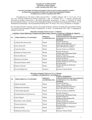 Zarządzenie Nr 0050.142.2015 Burmistrza Miasta Płońsk z dnia 5 października 2015 roku w sprawie powołania obwodowych komisji wyborczych do przeprowadzenia wyborów do Sejmu Rzeczypospolitej Polskiej i do Senatu Rzeczypospolitej Polskiej zarządzonych na dzień 25 października 2015 r. Na podstawie art. 182 ustawy z dnia 5 stycznia 2011 r. – Kodeks wyborczy (Dz. U. Nr 21, poz. 112 ze zm.) oraz Uchwały Państwowej Komisji Wyborczej z dnia 11 kwietnia 2011 r. w sprawie powoływania obwodowych komisji wyborczych w obwodach głosowania utworzonych w kraju, w wyborach do Sejmu Rzeczypospolitej Polskiej i do Senatu Rzeczypospolitej Polskiej, Prezydenta Rzeczypospolitej Polskiej oraz do Parlamentu Europejskiego w Rzeczypospolitej Polskiej (M.P. Nr 30 poz. 345 ze zm.), zarządzam co następuje: § 1. Powołuję obwodowe komisje wyborcze do przeprowadzenia wyborów do Sejmu Rzeczypospolitej Polskiej i do Senatu Rzeczypospolitej Polskiej zarządzonych na dzień 25 października 2015 roku w następujących składach osobowych: Obwodowa Komisja Wyborcza Nr 1 w Płońsku z siedzibą w Kasie Rolniczego Ubezpieczenia Społecznego, Placówce Terenowej w Płońsku ul. Zajazd 4 NAZWA PODMIOTU MIEJSCE UPRAWNIONEGO DO ZGŁOSZENIA LP. IMIĘ (IMIONA) I NAZWISKO ZAMIESZKANIA KANDYDATA NA CZŁONKA KOMISJI Komitet Wyborczy Płońsk 1. Andrzej Piotr Karwowski Prawo i Sprawiedliwość Koalicyjny Komitet Wyborczy Płońsk 2. Jerzy Krajewski SLD+TR+PPS+UP+Zieloni 3. Anna Kowalska Płońsk 4. Damian Jan Januszewski Płońsk 5. Dawid Żółtowski Płońsk 6. Katarzyna Zasońska Płońsk 7. Krystian Damian Jobski Płońsk 8. Dariusz Pietrzak Płońsk 9. Leszek Stępkowski Sochocin Komitet Wyborczy KORWiN Komitet Wyborczy Narodowego Odrodzenia Polski Komitet Wyborczy Platformy Obywatelskiej RP Komitet Wyborczy Polskie Stronnictwo Ludowe Komitet Wyborczy Nowoczesna Ryszarda Petru Komitet Wyborczy Wyborców „Kukiz’15” Burmistrz Miasta Płońsk Obwodowa Komisja Wyborcza Nr 2 w Płońsku z siedzibą w Przedszkolu nr 1 ul. Kolejowa 5 NAZWA PODMIOTU MIEJSCE UPRAWNIONEGO DO ZGŁOSZENIA LP. IMIĘ (IMIONA) I NAZWISKO ZAMIESZKANIA KANDYDATA NA CZŁONKA KOMISJI Komitet Wyborczy Płońsk 1. Marek Kośmider Prawo i Sprawiedliwość Koalicyjny Komitet Wyborczy Płońsk 2. Małgorzata Gadomska SLD+TR+PPS+UP+Zieloni 3. Alicja Janina Ignasiak Płońsk 4. Dominik Bartosz Dzienisiewicz Płońsk 5. Anna Stępień Płońsk 6. Kazimiera Anna Lipińska Płońsk 7. Dorota Jackiewicz Płońsk 8. Zofia Sosińska Płońsk 9. Marianna Gołaszewska Płońsk Komitet Wyborczy KORWiN Komitet Wyborczy Narodowego Odrodzenia Polski Komitet Wyborczy Platformy Obywatelskiej RP Komitet Wyborczy Polskie Stronnictwo Ludowe Komitet Wyborczy Nowoczesna Ryszarda Petru Komitet Wyborczy Wyborców „Kukiz’15” Burmistrz Miasta Płońsk 1 Obwodowa Komisja Wyborcza Nr 3 w Płońsku z siedzibą w Zespole Szkół nr 2 im. L. Rutkowskiego ul. ZWM 10 NAZWA PODMIOTU MIEJSCE UPRAWNIONEGO DO ZGŁOSZENIA LP. IMIĘ (IMIONA) I NAZWISKO ZAMIESZKANIA KANDYDATA NA CZŁONKA KOMISJI Komitet Wyborczy Płońsk 1. Jolanta Jadwiga Madany Prawo i Sprawiedliwość Koalicyjny Komitet Wyborczy Płońsk 2. Wiesława Gołembiewska SLD+TR+PPS+UP+Zieloni 3. Bogumiła Namysło Płońsk 4. Joanna Kalinowska Płońsk 5. Patryk Jakub Szymański Płońsk 6. Irena Gizińska Płońsk 7. Małgorzata Gredke Płońsk 8. Daniela Wanda Chodorska Płońsk 9. Marek Lewandowski Drobin Komitet Wyborczy KORWiN Komitet Wyborczy Narodowego Odrodzenia Polski Komitet Wyborczy Platformy Obywatelskiej RP Komitet Wyborczy Polskie Stronnictwo Ludowe Komitet Wyborczy Nowoczesna Ryszarda Petru Komitet Wyborczy Wyborców „Kukiz’15” Burmistrz Miasta Płońsk Obwodowa Komisja Wyborcza Nr 4 w Płońsku z siedzibą w Przedsiębiorstwie Gospodarki Komunalnej Sp. z o.o. w Płońsku przy ulicy Mickiewicza 4 NAZWA PODMIOTU MIEJSCE UPRAWNIONEGO DO ZGŁOSZENIA LP. IMIĘ (IMIONA) I NAZWISKO ZAMIESZKANIA KANDYDATA NA CZŁONKA KOMISJI Komitet Wyborczy Płońsk 1. Ryszard Antoniewski Prawo i Sprawiedliwość Koalicyjny Komitet Wyborczy Płońsk 2. Iwona Grażyna Łoniewska SLD+TR+PPS+UP+Zieloni 3. Grażyna Irena Zielińska Płońsk 4. Damian Cichocki Płońsk 5. Joanna Iwona Szymańska Płońsk 6. Anna Grąbczewska Płońsk 7. Marzena Katarzyna Bielska Płońsk 8. Beniamin Adam Chodorski Płońsk 9. Beata Klik Sarnowo Góry Komitet Wyborczy KORWiN Komitet Wyborczy Narodowego Odrodzenia Polski Komitet Wyborczy Platformy Obywatelskiej RP Komitet Wyborczy Polskie Stronnictwo Ludowe Komitet Wyborczy Nowoczesna Ryszarda Petru Komitet Wyborczy Wyborców „Kukiz’15” Burmistrz Miasta Płońsk 2 Obwodowa Komisja Wyborcza nr 5 w Płońsku z siedzibą w Zakładzie Gospodarki Mieszkaniowej (Biblioteka Pedagogiczna) ul. Warszawska 7 NAZWA PODMIOTU MIEJSCE UPRAWNIONEGO DO ZGŁOSZENIA LP. IMIĘ (IMIONA) I NAZWISKO ZAMIESZKANIA KANDYDATA NA CZŁONKA KOMISJI Komitet Wyborczy Prawo Płońsk 1. Marcin Maciej Kośmider i Sprawiedliwość Koalicyjny Komitet Wyborczy Płońsk 2. Anna Gabryela Rogacka SLD+TR+PPS+UP+Zieloni 3. Emilia Orłowska Płońsk 4. Damian Bułka Płońsk 5. Barbara Bilińska Płońsk 6. Agnieszka Gabriela Graczyk Płońsk 7. Monika Kmiecińska Płońsk 8. Elżbieta Pietrzak Płońsk 9. Aneta Ślubowska Kamienica Komitet Wyborczy KORWiN Komitet Wyborczy Narodowego Odrodzenia Polski Komitet Wyborczy Platformy Obywatelskiej RP Komitet Wyborczy Polskie Stronnictwo Ludowe Komitet Wyborczy Nowoczesna Ryszarda Petru Komitet Wyborczy Wyborców „Kukiz’15” Burmistrz Miasta Płońsk Obwodowa Komisja Wyborcza nr 6 w Płońsku z siedzibą w Gimnazjum Publicznym nr 2 im. Bolesława Chrobrego ul. Wolności 4 NAZWA PODMIOTU MIEJSCE UPRAWNIONEGO DO ZGŁOSZENIA LP. IMIĘ (IMIONA) I NAZWISKO ZAMIESZKANIA KANDYDATA NA CZŁONKA KOMISJI Komitet Wyborczy Płońsk 1. Małgorzata Jaszczur Prawo i Sprawiedliwość Koalicyjny Komitet Wyborczy Płońsk 2. Danuta Marianna Chodorska SLD+TR+PPS+UP+Zieloni 3. Leszek Budek Płońsk 4