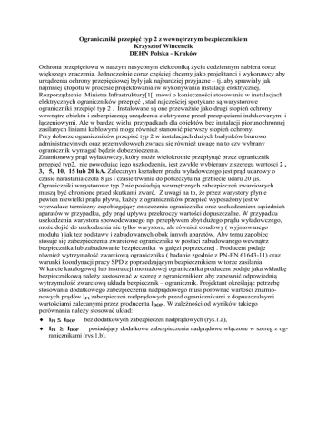 Ograniczniki przepięć typ 2 z wewnętrznym bezpiecznikiem Krzysztof Wincencik DEHN Polska - Kraków Ochrona przepięciowa w naszym nasyconym elektroniką życiu codziennym nabiera coraz większego znaczenia. Jednocześnie coraz częściej chcemy jako projektanci i wykonawcy aby urządzenia ochrony przepięciowej były jak najbardziej przyjazne – tj. aby sprawiały jak najmniej kłopotu w procesie projektowania iw wykonywania instalacji elektrycznej. Rozporządzenie Ministra Infrastruktury[1[ mówi o konieczności stosowaniu w instalacjach elektrycznych ograniczników przepięć , stad najczęściej spotykane są warystorowe ograniczniki przepięć typ 2 . Instalowane są one przeważnie jako drugi stopień ochrony wewnątrz obiektu i zabezpieczają urządzenia elektryczne przed przepięciami indukowanymi i łączeniowymi. Ale w bardzo wielu przypadkach dla obiektów bez instalacji piorunochronnej zasilanych liniami kablowymi mogą również stanowić pierwszy stopień ochrony. Przy doborze ograniczników przepięć typ 2 w instalacjach dużych budynków biurowo administracyjnych oraz przemysłowych zwraca się również uwagę na to czy wybrany ogranicznik wymagać będzie dobezpieczenia. Znamionowy prąd wyładowczy, który może wielokrotnie przepłynąć przez ogranicznik przepięć typ2, nie powodując jego uszkodzenia, jest zwykle wybierany z szeregu wartości 2 , 3, 5, 10, 15 lub 20 kA. Zalecanym kształtem prądu wyładowczego jest prąd udarowy o czasie narastania czoła 8 s i czasie trwania do półszczytu na grzbiecie udaru 20 s. Ograniczniki warystorowe typ 2 nie posiadają wewnętrznych zabezpieczeń zwarciowych muszą być chronione przed skutkami zwarć. Z uwagi na to, że przez warystory płynie pewien niewielki prądu pływu, każdy z ograniczników przepięć wyposażony jest w wyzwalacz termiczny zapobiegający zniszczeniu ogranicznika oraz uszkodzeniem sąsiednich aparatów w przypadku, gdy prąd upływu przekroczy wartości dopuszczalne. W przypadku uszkodzenia warystora spowodowanego np. przepływem zbyt dużego prądu wyładowczego, może dojść do uszkodzenia nie tylko warystora, ale również obudowy ( wyjmowanego modułu ) jak tez podstawy i zabudowanych obok innych aparatów. Aby temu zapobiec stosuje się zabezpieczenia zwarciowe ogranicznika w postaci zabudowanego wewnątrz bezpiecznika lub zabudowanie bezpiecznika w gałęzi poprzecznej . Producent podaje również wytrzymałość zwarciową ogranicznika ( badanie zgodnie z PN-EN 61643-11) oraz warunki koordynacji pracy SPD z poprzedzającym bezpiecznikiem w torze zasilania. W karcie katalogowej lub instrukcji montażowej ogranicznika producent podaje jaka wkładkę bezpiecznikową należy zastosować w szereg z ogranicznikiem aby zapewnić odpowiednią wytrzymałość zwarciową układu bezpiecznik – ogranicznik. Projektant określając potrzebę stosowania dodatkowego zabezpieczenia nadprądowego musi porównać wartości znamionowych prądów IF1 zabezpieczeń nadprądowych przed ogranicznikami z dopuszczalnymi wartościami zalecanymi przez producenta IDOP . W zależności od wyników takiego porównania należy stosować układ: IF1 IDOP bez dodatkowych zabezpieczeń nadprądowych (rys.1.a), IF1 IDOP posiadający dodatkowe zabezpieczenia nadprądowe włączone w szereg z ogranicznikami (rys.1.b). F1 F1 F2 ogranicznik przepięć klasy II a) ogranicznik przepięć klasy II b) Rys.1. Układy połączeń ograniczników przepięć typ 2 Rys 2 przykład dobezpieczenia ogranicznika przepięć typ 2 w rozdzielnicy Decydując się na stosowanie dobezpieczenia należy przestrzegać zaleceń producenta i nie forsować konieczności montażu dodatkowych bezpieczników w gałęzi poprzecznej w przypadku gdy nie wynika to z instrukcji montażowej producenta oraz stosowania bezpieczników o jak najmniejszym prądzie ( 32-40A) . Bezpieczniki te można łatwo zabudować na szynie obok ogranicznika, należy jednak również brać pod uwagę ich odporność na działanie prądów udarowych o kształcie 8/20. Przykładowe wartości prądów udarowych (8/20) powodujące zadziałanie bezpieczników pokazano na rys 3. Rys.3 Oddziaływanie prądu udarowego o kształcie 8/20s/s na bezpieczniki [2]. Problem zwiany z dobezpieczaniem ograniczników nie występuje gdy zastosujemy zespolone ograniczniki przepięć z wbudowanym wewnątrz bezpiecznikiem. Nie ma tutaj żadnych dodatkowych wymagań w stosunku do zainstalowanego bezpiecznika poprzedzającego miejsce montażu SPD. Należy w tym wypadku zwrócić uwagę na aby spodziewany prąd zwarcia w miejscu montażu ograniczniki, nie był wyższy niż podawana przez producenta wytrzymałość zwarciowa. Nowy ogranicznikiem w ofercie handlowej firmy DEHH wyposażonym w zintegrowany z modułem ochronnym bezpiecznik jest ogranicznik typu DEHNguard ..M/S… CI. Jest to ogranicznik przepięć typ 2 montowany na szynę TH 35 skoordynowany energetycznie ( wg PN-EN 62305-4) z innymi ogranicznikami przepięć firmy DEHN z serii czerwonej ( RED/Line). np. bezpośrednia z DEHNbloc Maxi, DEHNbloc M. Moduł ochronny zatrzaskuje się w podstawie i jest blokowany. Zabezpiecza to moduł przed wstrząsami w czasie transportu i przy niedopuszczalnie dużych udarach odprowadzonych przez ogranicznik. Wymiana modułu jest jednak łatwa i bez użycia narzędzi. Taki komfortowy efekt uzyskano stosując rygle w module. Ponadto, w każdym module zastosowano blokady mechaniczne przed wsunięciem nieodpowiedniego modułu ochronnego lub wsunięciem w nieodpowiednie miejsce. Rys 4a – Montaż/wymiana moduł w ograniczniku DG M TT CI 275. Stan każdego modułu ogranicznika sygnalizowany jest w okienku kontrolnym kolorem zielonym (sprawny) i czerwonym (uszkodzony). Obok standardowego optycznego wskaźnika uszkodzenia, ograniczniki z grupy DEHNguard M/S ……CI ... FM umożliwiają zdalną sygnalizację uszkodzenia przez złączkę z trzema stykami. Te trzy styki tworzą dwie pary zestyków wykonanych jako pr
