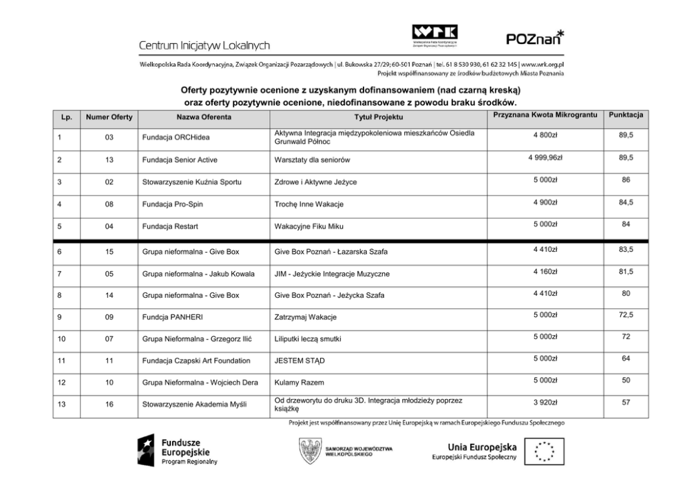 Oferty pozytywnie ocenione z uzyskanym dofinansowaniem (nad czarną kreską) oraz oferty pozytywnie ocenione, niedofinansowane z powodu braku środków. Lp. Numer Oferty Tytuł Projektu Nazwa Oferenta Przyznana Kwota Mikrograntu Punktacja 4 800zł 89,5 4 999,96zł 89,5 1 03 Fundacja ORCHidea Aktywna Integracja międzypokoleniowa mieszkańców Osiedla Grunwald Północ 2 13 Fundacja Senior Active Warsztaty dla seniorów 3 02 Stowarzyszenie Kuźnia Sportu Zdrowe i Aktywne Jeżyce 5 000zł 86 4 08 Fundacja Pro-Spin Trochę Inne Wakacje 4 900zł 84,5 5 04 Fundacja Restart Wakacyjne Fiku Miku 5 000zł 84 6 15 Grupa nieformalna - Give Box Give Box Poznań - Łazarska Szafa 4 410zł 83,5 7 05 Grupa nieformalna - Jakub Kowala JIM - Jeżyckie Integracje Muzyczne 4 160zł 81,5 8 14 Grupa nieformalna - Give Box Give Box Poznań - Jeżycka Szafa 4 410zł 80 9 09 Fundcja PANHERI Zatrzymaj Wakacje 5 000zł 72,5 10 07 Grupa Nieformalna - Grzegorz Ilić Liliputki leczą smutki 5 000zł 72 11 11 Fundacja Czapski Art Foundation JESTEM STĄD 5 000zł 64 12 10 Grupa Nieformalna - Wojciech Dera Kulamy Razem 5 000zł 50 13 16 Stowarzyszenie Akademia Myśli Od drzeworytu do druku 3D. Integracja młodzieży poprzez książkę 3 920zł 57 Oferty negatywnie ocenione pod względem formalnym Lp. 1 2 3 4 Numer Oferty Nazwa Oferenta Tytuł Projektu Przyznana Kwota Mikrograntu 01 Fundacja Ja-Ty-On-My Pożegnanie Wakacji na Łazarzu - 12 Grupa Nieformalna - Katarzyna Krzysztofiak Wakacyjna Akademia Małego Jogina - 17 Stowarzyszenie Lepszy Świat Wakacyjne Twórz-My - 06 Stowarzyszenie Otwarte Drzwi Bańka niepełnosprawności - przełamywanie barier w kontaktach z osobami niepełnosprawnymi - Punktacja -
