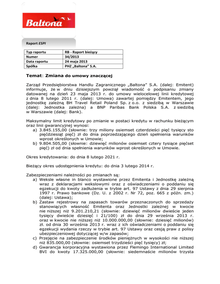 Raport ESPI Typ raportu Numer Data raportu Spółka RB - Raport bieżący 34/2013 24 maja 2013 PHZ „Baltona” S.A. Temat: Zmiana do umowy znaczącej Zarząd Przedsiębiorstwa Handlu Zagranicznego „Baltona” S.A. (dalej: Emitent) informuje, że w dniu dzisiejszym powziął wiadomość o podpisaniu zmiany datowanej na dzień 23 maja 2013 r. do umowy wielocelowej linii kredytowej z dnia 8 lutego 2011 r. (dalej: Umowa) zawartej pomiędzy Emitentem, jego jednostkę zależną BH Travel Retail Poland Sp. z o.o. z siedzibą w Warszawie (dalej: Jednostka zależna) a BNP Paribas Bank Polska S.A. z siedzibą w Warszawie (dalej: Bank). Maksymalny limit kredytowy po zmianie w postaci kredytu w rachunku bieżącym oraz linii gwarancyjnej wynosi: a) 3.845.155,00 (słownie: trzy miliony osiemset czterdzieści pięć tysięcy sto pięćdziesiąt pięć) zł do dnia poprzedzającego dzień spełnienia warunków wprost określonych w Umowie; b) 9.804.505,00 (słownie: dziewięć milionów osiemset cztery tysiące pięćset pięć) zł od dnia spełnienia warunków wprost określonych w Umowie. Okres kredytowania: do dnia 8 lutego 2021 r. Bieżący okres udostępnienia kredytu: do dnia 3 lutego 2014 r. Zabezpieczeniami należności po zmianach są: a) Weksle własne in blanco wystawione przez Emitenta i Jednostkę zależną wraz z deklaracjami wekslowymi oraz z oświadczeniami o poddaniu się egzekucji do kwoty zadłużenia w trybie art. 97 Ustawy z dnia 29 sierpnia 1997 r. Prawo bankowe (Dz. U. z 2002 r. Nr 72, poz. 665 z późn. zm.) (dalej: Ustawa); b) Zastaw rejestrowy na zapasach towarów przeznaczonych do sprzedaży stanowiących własność Emitenta oraz Jednostki zależnej w kwocie nie niższej niż 9.201.210,21 (słownie: dziewięć milionów dwieście jeden tysięcy dwieście dziesięć i 21/100) zł do dnia 29 września 2013 r. oraz w kwocie nie niższej niż 10.000.000,00 (słownie: dziesięć milionów) zł. od dnia 30 września 2013 r. wraz z ich oświadczeniami o poddaniu się egzekucji wydania rzeczy w trybie art. 97 Ustawy oraz cesją praw z polisy ubezpieczeniowej dotyczącej w/w zapasów; c) Przejęcie na zabezpieczenie środków pieniężnych w wysokości nie niższej niż 835.000,00 (słownie: osiemset trzydzieści pięć tysięcy) zł; d) Gwarancja korporacyjna wystawiona przez Flemingo International Limited BVI do kwoty 17.325.000,00 (słownie: siedemnaście milionów trzysta dwadzieścia pięć tysięcy) zł wraz z oświadczeniem Gwaranta o poddaniu się egzekucji w trybie art. 97 Ustawy; e) Gwarancja bankowa wystawiona przez Barclays Bank PLC w kwocie 2.950.000,00 (słownie: dwa miliony dziewięćset pięćdziesiąt tysięcy) zł z terminem ważności do 31 stycznia 2014 r.; f) Oświadczenie Emitenta i Jednostki zależnej o poddaniu się egzekucji w trybie art. 97 Ustawy. Pozostałe warunki Umowy nie uległy istotnym zmianom. Umowa istotna ze względu na wartość maksymalnego limitu kredytowego przewyższającego 10% kapitałów własnych Emitenta. Osoby reprezentujące spółkę: Andrzej Uryga - Prezes Zarządu Piotr Kazimierski - Członek Zarządu