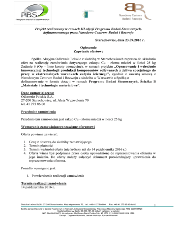 Projekt realizowany w ramach III edycji Programu Badań Stosowanych, dofinansowanego przez Narodowe Centrum Badań i Rozwoju Starachowice, dnia 23.09.2016 r. Ogłoszenie Zapytanie ofertowe Spółka Akcyjna Odlewnie Polskie z siedzibą w Starachowicach zaprasza do składania ofert na realizację zamówienia dotyczącego zakupu Cu - złomu miedzi w ilości 25 kg Zadanie 6 (Op – Inne koszty operacyjne), w ramach projektu „Opracowanie i wdrożenie innowacyjnej technologii produkcji komponentów odlewanych z żeliwa specjalnego do pracy w ekstremalnych warunkach zużycia ściernego”, zgodnie z zawartą umową z Narodowym Centrum Badań i Rozwoju z siedziba w Warszawie a Spółką o dofinansowanie w formie dotacji w ramach Programu Badań Stosowanych, Ścieżka B „Materiały i technologie materiałowe”. Dane zamawiającego: Odlewnie Polskie S.A. 27-200 Starachowice, ul. Aleja Wyzwolenia 70 tel. 41 275 86 00 Przedmiot zamówienia Przedmiotem zamówienia jest zakup Cu - złomu miedzi w ilości 25 kg Wymagania zamawiającego stawiane oferentowi Oferta powinna zawierać: Cenę z dostawą do siedziby zamawiającego Termin płatności Termin ważności oferty (nie krótszy niż do 14 października 2016 r.) Oferta winna być podpisana przez osoby upoważnione do reprezentowania oferenta w jego imieniu. Do oferty należy załączyć dokument potwierdzający uprawnienia do reprezentowania oferenta. 1. 2. 3. 4. Ponadto wymagane jest: 1. Potwierdzenie realizacji zamówienia Termin realizacji zamówienia 14 października 2016 r. Siedziba i adres Spółki: 27-200 Starachowice, Aleja Wyzwolenia 70; tel.: +48 41 275 86 00 Fax: +48 41 275 86 80 do 82 Spółka zarejestrowana w Sądzie Rejonowym w Kielcach, X Wydział Gospodarczy Krajowego Rejestru Sądowego KRS 0000024126 Kapitał zakładowy Spółki 30.996.181,50 złotych wpłacony w całości NIP: 664-00-05-475; Nr rachunku: Raiffeisen Bank Polska S.A. 47 1750 1110 0000 0000 2014 1228 Zarząd: Zbigniew Ronduda, Leszek Walczyk, Ryszard Pisarski 1 Projekt realizowany w ramach III edycji Programu Badań Stosowanych, dofinansowanego przez Narodowe Centrum Badań i Rozwoju Tryb oceny ofert: - ocenę ofert przeprowadza Komisja, - Komisja bada oferty pod względem ich zgodności z zapytaniem ofertowym, - spośród otrzymanych ofert Komisja wybierze najkorzystniejszą ofertę na podstawie niżej wymienionych kryteriów oceny; wybór dokonany przez Komisję podlega zatwierdzeniu przez zamawiającego, Kryteria oceny ofert: a) 70 % - cena (maksymalna ilość punktów do uzyskania 70), b) 30 % - termin płatności (maksymalna ilość punktów do uzyskania 30). Zasady oceny ofert według ustalonych kryteriów: a) Kryterium ceny Kryterium ceny oferty będzie rozpatrywane na podstawie ceny netto podanej przez oferenta. Punkty przyznane poszczególnym ofertom będą obliczane w następujący sposób: - pozyskana oferta o najniższej cenie otrzymuje 70 punktów; cena ta staje się oceną bazową dla oceny pozostałych ofert, - punkty przyznane każdej ofercie o cenie wyższej będą wyliczane według poniższego wzoru: P = 140 - 70 x O:ON gdzie: P – ilość przyznanych punktów za cenę, zaokrąglona do pełnych jedności, ON – cena bazowa (najniższa), O – cena oferowana (wyższa od ceny bazowej), W przypadku wyniku ujemnego, oferent otrzyma 0 punktów. b) Kryterium warunków płatności Punkty przyznane poszczególnym ofertom będą obliczane w następujący sposób: Termin płatności: do 7 dni od dostawy od 8 do 14 dni od dostawy od 15 do 21 dni od dostawy powyżej 21 dni od dostawy - 0 punktów 10 punktów 20 punktów 30 punktów Siedziba i adres Spółki: 27-200 Starachowice, Aleja Wyzwolenia 70; tel.: +48 41 275 86 00 Fax: +48 41 275 86 80 do 82 Spółka zarejestrowana w Sądzie Rejonowym w Kielcach, X Wydział Gospodarczy Krajowego Rejestru Sądowego KRS 0000024126 Kapitał zakładowy Spółki 30.996.181,50 złotych wpłacony w całości NIP: 664-00-05-475; Nr rachunku: Raiffeisen Bank Polska S.A. 47 1750 1110 0000 0000 2014 1228 Zarząd: Zbigniew Ronduda, Leszek Walczyk, Ryszard Pisarski 2 Projekt realizowany w ramach III edycji Programu Badań Stosowanych, dofinansowanego przez Narodowe Centrum Badań i Rozwoju Składanie ofert i wybór najkorzystniejszej oferty - oferty należy składać w siedzibie zamawiającego do dnia 06.10.2016 r. - wybór najkorzystniejszej oferty nastąpi w siedzibie zamawiającego w dniu 07.10.2016 r. - z przebiegu wyboru najkorzystniejszej oferty Komisja sporządzi protokół, w którym wskaże wybraną ofertę. Postanowienia końcowe - zamawiający unieważni postępowanie o udzielenie zamówienia w przypadku gdy nie złożono żadnej oferty spełniającej określone wyżej kryteria, - zamawiający może unieważnić postępowanie bez podania przyczyn, - organizator oraz uczestnik postępowania może żądać unieważnienia postępowania jeżeli strony postępowania, inny uczestnik lub osoba działająca w porozumieniu z nimi wpłynęły na wynik postępowania w sposób sprzeczny z prawem lub dobrymi obyczajami; uprawnienie to wygasa z upływem miesiąca od dnia, w którym uprawniony dowiedział się o zaistnieniu przyczyny unieważnienia, nie później jednak niż z upływem roku od zawarcia umowy - ogłoszenie zapytanie ofertowe, wyniki postępowania zostaną umieszczone na stronie internetowej Spółki oraz na tablicy ogłoszeń Spółki, - postępowanie nie podlega rygorowi ustawy z dnia 29 stycznia 2004 – Prawo Zamówień Publicznych, - osobami uprawnionymi do kontaktu z oferentami są: Marek Sokolnicki - Członek Komisji tel. (41) 275 86 31 Wojciech Krześniak – Członek Komisji tel. (41) 275 86 58 Przewodniczący Komisji Jacek Wojtan Siedziba i adres Spółki: 27-200 Starachowice, Aleja Wyzwolenia 70; tel.: +48 41 275 86 00 Fax: +48 41 275 86 80 do 82 Spółka zarejestrowana w Sądzie Rejonowym w Kielcach, X Wydział Gospodarczy Krajowego Rejestru Sądowego KRS 0000024126 Kapitał zakładowy Spółki 30.996.181