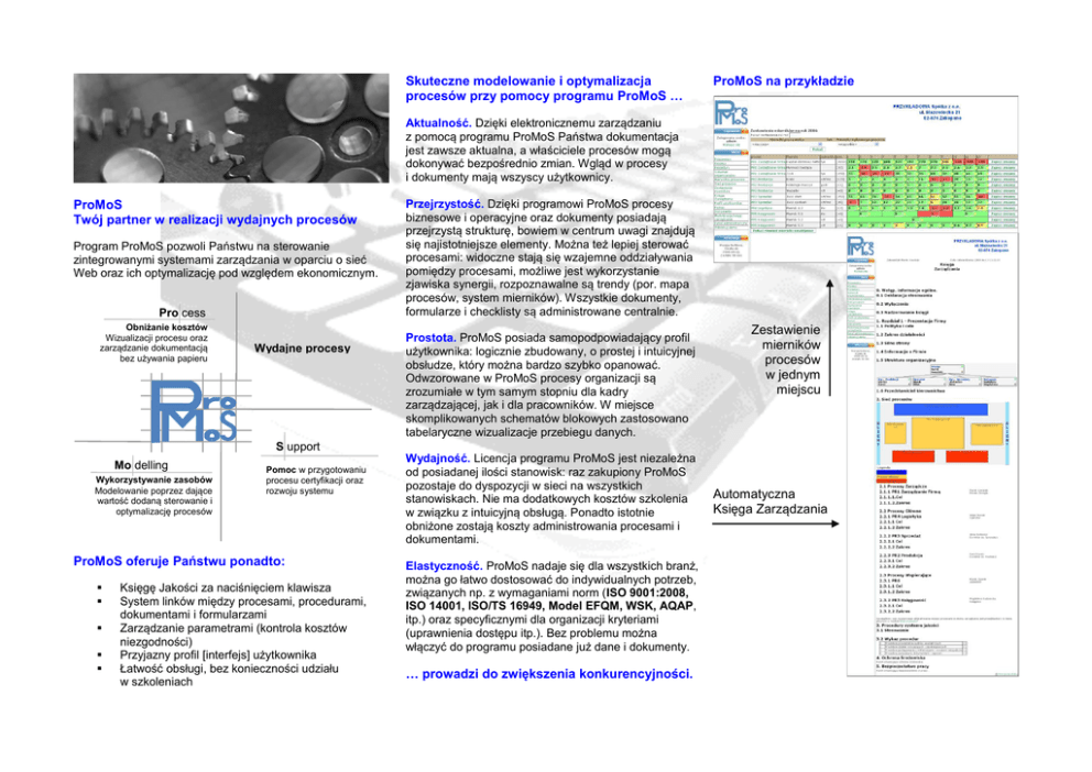Skuteczne modelowanie i optymalizacja procesów przy pomocy programu ProMoS … ProMoS na przykładzie Aktualność. Dzięki elektronicznemu zarządzaniu z pomocą programu ProMoS Państwa dokumentacja jest zawsze aktualna, a właściciele procesów mogą dokonywać bezpośrednio zmian. Wgląd w procesy i dokumenty mają wszyscy użytkownicy. ProMoS Twój partner w realizacji wydajnych procesów Program ProMoS pozwoli Państwu na sterowanie zintegrowanymi systemami zarządzania w oparciu o sieć Web oraz ich optymalizację pod względem ekonomicznym. Pro cess Obniżanie kosztów Wizualizacji procesu oraz zarządzanie dokumentacją bez używania papieru Wydajne procesy S upport Mo delling Wykorzystywanie zasobów Modelowanie poprzez dające wartość dodaną sterowanie i optymalizację procesów Pomoc w przygotowaniu procesu certyfikacji oraz rozwoju systemu ProMoS oferuje Państwu ponadto: Księgę Jakości za naciśnięciem klawisza System linków między procesami, procedurami, dokumentami i formularzami Zarządzanie parametrami (kontrola kosztów niezgodności) Przyjazny profil [interfejs] użytkownika Łatwość obsługi, bez konieczności udziału w szkoleniach Przejrzystość. Dzięki programowi ProMoS procesy biznesowe i operacyjne oraz dokumenty posiadają przejrzystą strukturę, bowiem w centrum uwagi znajdują się najistotniejsze elementy. Można też lepiej sterować procesami: widoczne stają się wzajemne oddziaływania pomiędzy procesami, możliwe jest wykorzystanie zjawiska synergii, rozpoznawalne są trendy (por. mapa procesów, system mierników). Wszystkie dokumenty, formularze i checklisty są administrowane centralnie. Prostota. ProMoS posiada samopodpowiadający profil użytkownika: logicznie zbudowany, o prostej i intuicyjnej obsłudze, który można bardzo szybko opanować. Odwzorowane w ProMoS procesy organizacji są zrozumiałe w tym samym stopniu dla kadry zarządzającej, jak i dla pracowników. W miejsce skomplikowanych schematów blokowych zastosowano tabelaryczne wizualizacje przebiegu danych. Wydajność. Licencja programu ProMoS jest niezależna od posiadanej ilości stanowisk: raz zakupiony ProMoS pozostaje do dyspozycji w sieci na wszystkich stanowiskach. Nie ma dodatkowych kosztów szkolenia w związku z intuicyjną obsługą. Ponadto istotnie obniżone zostają koszty administrowania procesami i dokumentami. Elastyczność. ProMoS nadaje się dla wszystkich branż, można go łatwo dostosować do indywidualnych potrzeb, związanych np. z wymaganiami norm (ISO 9001:2008, ISO 14001, ISO/TS 16949, Model EFQM, WSK, AQAP, itp.) oraz specyficznymi dla organizacji kryteriami (uprawnienia dostępu itp.). Bez problemu można włączyć do programu posiadane już dane i dokumenty. … prowadzi do zwiększenia konkurencyjności. Zestawienie mierników procesów w jednym miejscu Automatyczna Księga Zarządzania Praktyczne rozwiązanie programowe ProMoS został zaprojektowany we współpracy z menadżerami jakości i środowiska oraz kadrą kierowniczą z dwóch sektorów gospodarki - produkcji i usług. Długoletnie doświadczenia tych specjalistów umożliwiły dostosowanie programu do wymogów małych i średnich przedsiębiorstw. W praktyce program wielokrotnie się sprawdził, o czym świadczą pomyślnie zakończone procesy certyfikacji. Wymagania techniczne „Każde działanie można ująć w formie procesu i odpowiednio doskonalić.” (W.E. Deming) PLAN - PLANUJ Zdefiniowanie procesów i ich celów Ustalenie odpowiedzialności Modelowanie rozwiązań procesów DO - WYKONAJ ACT - DZIAŁAJ Zdefiniowanie działań doskonalących Minimalizacja ryzyk Identyfikacja potencjałów Wizualizacja procesów Dokumentowanie danych we / wy Identyfikacja oddziaływań Przyporządkowanie wskaźników ProMoS jest programem bazującym na sieci Web, zaprojektowanym przy zastosowaniu najnowszych, dużo bardziej niezawodnych technologii (np. bazy danych MySQL). Do instalacji oraz późniejszego użytkowania nie jest potrzebny dostęp do Internetu! Zainstalowany raz na komputerze służy jako serwer. Dla celów instalacji nie jest wymagane żadne dodatkowe oprogramowanie, z wyjątkiem standardowej przeglądarki i następujących wymagań dla serwera: system operacyjny: Win 2000, XP, Vista / Linux pamięć operacyjna: min. 128 MB RAM procesor: min. 1 GHz miejsce na dysku twardym: min. 50 MB plus wielkość dołączonych dokumentów ProMoS 3 600,00 PLN netto cena oprócz programu obejmuje: bezterminową licencję aktualizacje Wersja demonstracyjna Cykl Deminga (PDCA) w programie ProMoS CHECK - SPRAWDŹ Analiza wskaźników Kontrola skuteczności procesu Identyfikacja trendów Identyfikacja ryzyk Skuteczne narzędzie optymalizacyjne Elektroniczna Księga (Zarządzania) Jakości ProMoS pomoże Państwu w skutecznym przekształceniu modelu PDCA (Planuj-Wykonaj-Sprawdź-Działaj) w tworzenie wartości dodanej. Dzięki jego zastosowaniu mogą Państwo zwiększyć wydajność procesów i zapewnić ich długofalowe działanie. Dzięki przejrzystej prezentacji procesów oraz systemowi mierników ProMoS jest skutecznym i trwałym narzędziem sterowania i controllingu w zarządzaniu. Znajomość procesów i odpowiedzialności wspomaga myślenie procesowe oraz świadomość odpowiedzialności w całej organizacji. ProMoS generuje automatycznie Państwa Księgę Jakości. Nakład pracy zmniejsza się w istotny sposób, łatwiejsza staje się też cała dokumentacja procesu dzięki elektronicznej formie o przejrzystej strukturze. Zaoszczędzą Państwo czas i pieniądze, wdrażając system zarządzania, przygotowując się do procesu certyfikacji, utrzymując certyfikat oraz rozwijając system. Możesz również umieścić tu Księgę Zintegrowanych Systemów Zarządzania (ISO 9001:2008, ISO 14001, ISO/TS 16949, Model EFQM, WSK, AQAP, itp.) zobacz przykładową dokumentację SZJ w wersji demonstracyjnej programu – ściągnij z naszej strony http://www.qpc.pl/_oprogramowanie.htm Więcej 