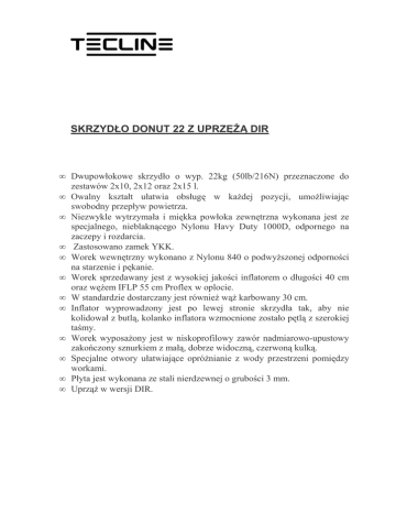 SKRZYDŁO DONUT 22 Z UPRZĘŻĄ DIR • Dwupowłokowe skrzydło o wyp. 22kg (50lb/216N) przeznaczone do zestawów 2x10, 2x12 oraz 2x15 l. • Owalny kształt ułatwia obsługę w każdej pozycji, umożliwiając swobodny przepływ powietrza. • Niezwykle wytrzymała i miękka powłoka zewnętrzna wykonana jest ze specjalnego, nieblaknącego Nylonu Havy Duty 1000D, odpornego na zaczepy i rozdarcia. • Zastosowano zamek YKK. • Worek wewnętrzny wykonano z Nylonu 840 o podwyższonej odporności na starzenie i pękanie. • Worek sprzedawany jest z wysokiej jakości inflatorem o długości 40 cm oraz wężem IFLP 55 cm Proflex w oplocie. • W standardzie dostarczany jest również wąż karbowany 30 cm. • Inflator wyprowadzony jest po lewej stronie skrzydła tak, aby nie kolidował z butlą, kolanko inflatora wzmocnione zostało pętlą z szerokiej taśmy. • Worek wyposażony jest w niskoprofilowy zawór nadmiarowo-upustowy zakończony sznurkiem z małą, dobrze widoczną, czerwoną kulką. • Specjalne otwory ułatwiające opróżnianie z wody przestrzeni pomiędzy workami. • Płyta jest wykonana ze stali nierdzewnej o grubości 3 mm. • Uprząż w wersji DIR.