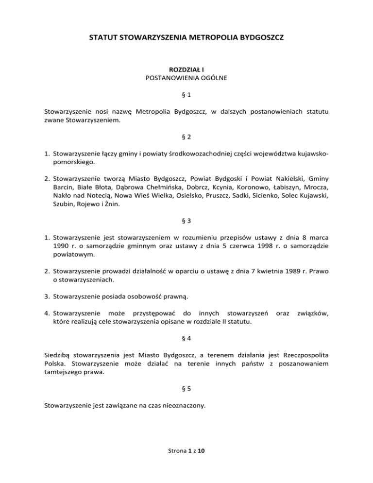 STATUT STOWARZYSZENIA METROPOLIA BYDGOSZCZ ROZDZIAŁ I POSTANOWIENIA OGÓLNE §1 Stowarzyszenie nosi nazwę Metropolia Bydgoszcz, w dalszych postanowieniach statutu zwane Stowarzyszeniem. §2 1. Stowarzyszenie łączy gminy i powiaty środkowozachodniej części województwa kujawskopomorskiego. 2. Stowarzyszenie tworzą Miasto Bydgoszcz, Powiat Bydgoski i Powiat Nakielski, Gminy Barcin, Białe Błota, Dąbrowa Chełmińska, Dobrcz, Kcynia, Koronowo, Łabiszyn, Mrocza, Nakło nad Notecią, Nowa Wieś Wielka, Osielsko, Pruszcz, Sadki, Sicienko, Solec Kujawski, Szubin, Rojewo i Żnin. §3 1. Stowarzyszenie jest stowarzyszeniem w rozumieniu przepisów ustawy z dnia 8 marca 1990 r. o samorządzie gminnym oraz ustawy z dnia 5 czerwca 1998 r. o samorządzie powiatowym. 2. Stowarzyszenie prowadzi działalność w oparciu o ustawę z dnia 7 kwietnia 1989 r. Prawo o stowarzyszeniach. 3. Stowarzyszenie posiada osobowość prawną. 4. Stowarzyszenie może przystępować do innych stowarzyszeń które realizują cele stowarzyszenia opisane w rozdziale II statutu. oraz związków, §4 Siedzibą stowarzyszenia jest Miasto Bydgoszcz, a terenem działania jest Rzeczpospolita Polska. Stowarzyszenie może działać na terenie innych państw z poszanowaniem tamtejszego prawa. §5 Stowarzyszenie jest zawiązane na czas nieoznaczony. Strona 1 z 10 §6 Stowarzyszenie wykonuje zadania w imieniu własnym i na własną odpowiedzialność. §7 Stowarzyszenie w celu realizacji zadań statutowych lub zadań zleconych może zatrudniać pracowników. ROZDZIAŁ II CELE I SPOSOBY ICH REALIZACJI §8 1. Celem Stowarzyszenia jest wspieranie idei samorządu terytorialnego oraz współpraca i wzajemne wspieranie się członków stowarzyszenia we wspólnych działaniach, których celem jest rozwój obszaru stowarzyszenia, a także wzrost jakości życia mieszkańców. 2. Celem szczególnym jest wspieranie rozwoju społeczno-gospodarczego członków Stowarzyszenia oraz obrona wspólnych interesów członków stowarzyszenia. 3. Celem stowarzyszenia jest również prowadzenie działań na rzecz utworzenia związku metropolitalnego. §9 Stowarzyszenie swe cele realizuje w szczególności poprzez: 1) działania wspierające wypracowanie i wdrażanie wspólnej strategii rozwoju, 2) działania umożliwiające efektywne i skuteczne zarządzanie, 3) reprezentowanie członków Stowarzyszenia we wspólnych sprawach, 4) opiniowanie projektów aktów prawnych, dotyczących samorządów terytorialnych, 5) wymianę uwag i doświadczeń w zakresie wykonywanych zadań własnych gmin i powiatów oraz zadań im zleconych przez administrację rządową, 6) podejmowanie wspólnych inicjatyw gospodarczych, mających wpływ na rozwój gmin i powiatów wchodzących w skład Stowarzyszenia, 7) podejmowanie wspólnych inicjatyw służących kulturalnemu i społecznemu rozwojowi gmin i powiatów, 8) prowadzenie działalności informacyjnej, konsultacyjnej i programowej, w celu wspólnego rozwiązywanie problemów w zakresie działalności samorządu gminnego i powiatowego, 9) inicjowanie i wspieranie prac naukowo-badawczych, 10) prowadzenie działalności wydawniczej, szkoleniowej i promocyjnej, 11) podejmowanie innych działań zmierzających do osiągania celów stowarzyszenia, 12) współpraca z innymi samorządami, stowarzyszeniami i związkami samorządów oraz z organizacjami międzynarodowymi. Strona 2 z 10 ROZDZIAŁ III CZŁONKOWIE – PRAWA I OBOWIĄZKI § 10 1. Członkami Stowarzyszenia są jego założyciele, których wymienia § 2, którzy tworzą Radę Metropolii oraz członkowie, przyjęci do stowarzyszeni w trakcie jego funkcjonowania. 2. Nowych członków Stowarzyszenia przyjmuje Rada Metropolii w drodze uchwały. Warunkiem członkostwa jest podjęcie przez radę gminy lub radę powiatu uchwały o przystąpieniu gminy lub powiatu do Stowarzyszenia. Po przyjęciu do stowarzyszenia przedstawiciel danej gminy lub powiatu wchodzi jednocześnie w skład Rady Metropolii. § 11 Członkowie Stowarzyszenia zobowiązani są do wspierania działalności stowarzyszenia oraz do płacenia składek rocznych w kwartalnych ratach na jego rzecz. Wysokość składki oraz terminy jej wpłat zostaną ustalone w drodze uchwały przez Radę Metropolii. § 12 Członkowie Stowarzyszenia mają prawo korzystać z usług Stowarzyszenia i jego majątku, brać udział w pracach organów Stowarzyszenia oraz w wyborach do tych organów. § 13 Utrata członkostwa Stowarzyszenia następuje poprzez: 1) wystąpienie ze Stowarzyszenia na mocy uchwały rady gminy lub rady powiatu, 2) zniesienie gminy lub powiatu, 3) pozbawienie członkostwa w Stowarzyszeniu na mocy uchwały Rady Metropolii w przypadku zalegania w opłaceniu co najmniej dwóch kolejnych składek kwartalnych lub prowadzenia działalności na szkodę Stowarzyszenia. § 14 1. W przypadku zniesienia gminy lub powiatu utrata członkostwa następuje z mocy prawa. Utratę członkostwa w tym trybie stwierdza Rada Metropolii w drodze uchwały. 2. W przypadku wystąpienia ze Stowarzyszenia na mocy uchwały rady gminy lub rady powiatu, utratę członkostwa stwierdza Rada Metropolii w drodze uchwały po złożeniu przez Prezydenta, Burmistrza, Wójta lub Starosty danej jednostki samorządu terytorialnego wniosku o wystąpieniu ze Stowarzyszenia. 3. Członkowstwo jednostki samorządu terytorialnego (JST) w Stowarzyszeniu ustaje z dniem 31 grudnia roku kalendarzowego, w którym rada gminy lub rada powiatu podjęła uchwałę o wystąpieniu ze Stowarzyszenia. Strona 3 z 10 ROZDZIAŁ IV WŁADZE STOWARZYSZENIA § 15 Władzami Stowarzyszenia są: 1) Walne Zebranie Członków zwane Radą Metropolii, 2) Zarząd, 3) Komisja Rewizyjna. § 16 1. Kadencja Zarządu i Komisji Rewizyjnej Stowarzyszenia trwa 4 lata z uwzględnieniem § 17. 2. Wybór i odwołanie Zarządu i Komisji Rewizyjnej odbywa się w głosowaniu tajnym bezwzględną większością głosów w obecności 2/3 reprezentantów członków Stowarzyszenia, z których ka