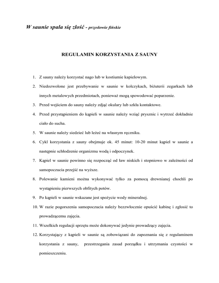 W saunie spala się złość - przysłowie fińskie REGULAMIN KORZYSTANIA Z SAUNY 1. Z sauny należy korzystać nago lub w kostiumie kapielowym. 2. Niedozwolone jest przebywanie w saunie w kolczykach, biżuterii zegarkach lub innych metalowych przedmiotach, ponieważ mogą spowodować poparzenie. 3. Przed wejściem do sauny należy zdjąć okulary lub szkła kontaktowe. 4. Przed przystąpieniem do kąpieli w saunie należy wziąć prysznic i wytrzeć dokładnie ciało do sucha. 5. W saunie należy siedzieć lub leżeć na własnym ręczniku. 6. Cykl korzystania z sauny obejmuje ok. 45 minut: 10-20 minut kąpiel w saunie a następnie schłodzenie organizmu wodą i odpoczynek. 7. Kąpiel w saunie powinno się rozpocząć od ław niskich i stopniowo w zależności od samopoczucia przejść na wyższe. 8. Polewanie kamieni można wykonywać tylko za pomocą drewnianej chochli po wystąpieniu pierwszych obfitych potów. 9. Po kąpieli w saunie wskazane jest spożycie wody mineralnej. 10. W razie pogorszenia samopoczucia należy bezzwłocznie opuścić kabinę i zgłosić to prowadzącemu zajęcia. 11. Wszelkich regulacji sprzętu może dokonywać jedynie prowadzący zajęcia. 12. Korzystający z kąpieli w saunie są zobowiązani do zapoznania się z regulaminem korzystania z sauny, pomieszczeniu. przestrzegania zasad porządku i utrzymania czystości w 13. Wskazania do korzystania z sauny: odnowa biologiczna, hartowanie organizmu, relaks, pielęgnacja skóry, trądzik młodzieńczy, łuszczyca, dna, alergiczne choroby skóry, odprężenie, stany pourazowe, kości, stawów, tkanek miękkich, choroby zwyrodnieniowe stawów i kręgosłupa, zzsk, przewlekłe nieżyty górnych dróg oddechowych, dyskopatie, lumbalgie, nerwice, neurastenie. 14. Przeciwwskazania do korzystania z sauny: gorączka, wszystkie choroby w okresie ostrym i podostrym, infekcje, nadciśnienie tętnicze, niewydolność układu krążeniowooddechowego, choroba nadciśnieniowa, skłonność do krwawień i krwotoków, świeże urazy mięśni i stawów, choroby reumatoidalne i reumatyczne, organiczne choroby nerek, płuc, wątroby, nadczynność tarczycy, choroby zakaźne i nosicielstwo chorób zakaźnych, choroby nowotworowe, czynna gruźlica, manstruacja, ciąża, kamica nerkowa, jaskra, padaczka, stwardnienie rozsiane, schorzenia psychiczne, miejscowe ostre stany zapalne, owrzodzenia, guzy, ogniska zakżenia itp., choroby skóry ze zmianami ropnymi, grzybice skóry, spożycie alkoholu i innych środków odurzających.