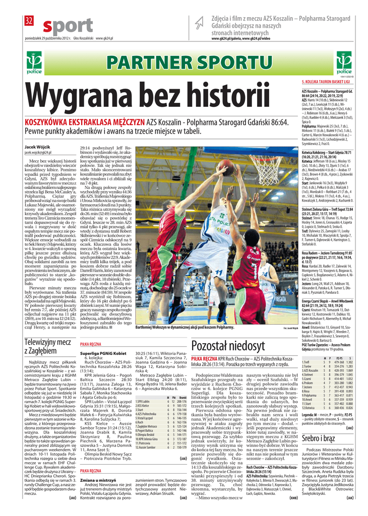 32 Zdjęcia i film z meczu AZS Koszalin – Polpharma Starogard Gdański obejrzysz na naszych stronach internetowych sport poniedziałek 29 października 2012 r. Głos Koszaliński www.gk24.pl www.gk24.pl/galeria, www.gk24.pl/wideo 194112S01B 5. KOLEJKA TAURON BASKET LIGI Wygrana bez historii AZS Koszalin – Polpharma Starogard Gd. 86:64 (24:14, 20:22, 20:19, 22:9) AZS: Harris 14 (10 zb.), Skibniewski 12 (2x3, 7 as.), Leończyk 11 (5 zb.), Wiśniewski 11 (1x3), Wołoszyn 9 (2x3, 4 zb.) – J. Robinson 16 (6 zb., 6 as.), Henry 6 (1x3), Kuebler 4 (4 zb.), Mielczarek 3 (1x3), Śpica 0. Polpharma: Majewski 25 (3x3, 7 zb.), Mirkovic 11 (6 zb.), Białek 9 (1x3, 5 zb.), Carter 6, Marcin Nowakowski 4 (6 as.) – Radwański 5 (1x3), Lichodzijewski 2, Szymkiewicz 2, Fraś 0. KOSZYKÓWKA EKSTRAKLASA MĘŻCZYZN AZS Koszalin - Polpharma Starogard Gdański 86:64. Pewne punkty akademików i awans na trzecie miejsce w tabeli. Jacek Wójcik [email protected] Mecz bez większej historii obejrzeli w niedzielny wieczór koszalińscy kibice. Pomimo wpadki przed tygodniem w Gdyni, AZS był zdecydowanym faworytem w meczu z osłabioną brakiem najlepszego strzelca ligi Bena McCauley’a, Polpharmą. Ciężar gry próbował wziąć na swoje barki Łukasz Majewski, ale osamotniony nie mógł wyrządzić krzywdy akademikom. Zespół trenera Teo Cizmicia momentami dopasowywał się do rywala i rozgrywany w dość ospałym tempie mecz nie potrafił poderwać publiczności. Większe emocje wzbudzili za to Sek Henry i Majewski, którzy w 4. kwarcie walczyli o sporną piłkę jeszcze przez dłuższą chwilę po gwizdku sędziów. Obaj solidarni zarobili za ten moment zapamiętania po przewinieniu technicznym, ale publiczności to starcie „kogutów” wyraźnie się spodobało. Pierwsze minuty meczu były wyrównane. Na trafienia AZS po drugiej stronie boiska odpowiadał na ogół Majewski. W połowie pierwszej kwarty był remis 7:7, ale później AZS odjechał najpierw na 11 pkt (20:9), a w 10. min na 12 (24:12). Drugą kwartę od trójki rozpoczął Henry, a następnie na Telewizyjny mecz z Zagłębiem Najbliższy mecz piłkarek ręcznych AZS Politechniki Koszalińskiej w Koszalinie – z wicemistrzyniami kraju z KGHM Metraco Zagłębie Lubin – będzie transmitowany na żywo przez Polsat Sport. Spotkanie odbędzie się już w niedzielę (4 listopada) o godzinie 19.30 w ramach 7. kolejki PGNiG Superligi Kobiet w hali widowiskowosportowej przy ul. Śniadeckich. Mecz z miedziowymi będzie pierwszym w tym sezonie w Koszalinie, z którego przeprowadzona zostanie transmisja telewizyjna. Dla koszalińskiej drużyny, a także organizatorów będzie to także sprawdzian generalny przed zbliżającym się pucharowym weekendem. W dniach 10-11 listopada Politechnika rozegra u siebie dwa mecze w ramach EHF Challenge Cup. Rywalem akademiczek będzie drużyna z Ukrainy – HC Dnieprianka Cheroń. Spotkania odbędą się w ramach 3. rundy Challenge Cup, a nasz zespół będzie gospodarzem dwumeczu. 29:14 podwyższył Jeff Robinson i wydawało się, że akademicy spróbują rozstrzygnąć losy spotkania już w pierwszej połowie. Tak się jednak nie stało. Mało skoncentrowani koszalinianie pozwalali na zbyt wiele rywalom i ci zbliżali się na 7-8 pkt. Na drugą połowę zespoły wychodziły przy wyniku 44:36 dla AZS. Trafienia Majewskiego i Urosa Mirkovicia sprawiły, że farmaceuci doszli na 3 punkty. Taka różnica utrzymywała się do 26. min (52:49) i można było obawiać się o powtórkę z Gdyni. Jeszcze w 28. min AZS miał tylko 4 pkt przewagi, ale wtedy z dystansu trafił Robert Skibniewski i w końcówce zespół Cizmicia odskoczył na 9 oczek. Kluczowa dla losów meczu była ostatnia kwarta, którą AZS wygrał bez większych problemów 22:9. Akademicy trafili kilka trójek, a pod koszem dobrze radził sobie Darrell Harris, który zanotował pierwsze w sezonie double-double (14 pkt, 10 zbiórek). Przewaga AZS rosła z każdą minutą, dochodząc do 25 oczek w 37. minucie (84:59). W zespole AZS wyróżnił się Robinson, który do 16 pkt dołożył po 6 zbiórek i asyst. W sumie pięciu graczy naszego zespołu mogło pochwalić się dwucyfrową zdobyczą, a BartłomiejowiWołoszynowi zabrakło do tego jednego punktu. d Bartłomiej Wołoszyn w dynamicznej akcji pod koszem Polpharmy. PIŁKA RĘCZNA Superliga PGNiG Kobiet 6. kolejka: Ruch Chorzów – AZS Politechnika Koszalińska 28:26 (13:14); KPR Jelenia Góra – Pogoń Baltica Szczecin 28:30 (13:17), Joanna Załoga 13, Emilia Galińska 6 – Katarzyna Sabała 7, Monika Stachowska i Agata Cebula po 6; SPR Lublin – Vistal Łączpol Gdynia 35:31 (19:15), Małgorzata Majerek 8, Dorota Małek 6 – Patrycja Kulwińska 8, Karolina Sulżycka 7; KSS Kielce – Aussie Sambor Tczew 31:24 (15:12), Joanna Drabik 8, Kamila Skrzyniarz 8, Paulina Piechnik 6, Marzena Paszowska 5 – Justyna Domnik 11, Anna Szot 5; Olimpia Beskid Nowy Sącz – Piotrcovia Piotrków Tryb. 30:25 (16:11), Wiktoria Panasiuk 7, Kamila Szczecina 7, Joanna Gadzina 6 – Joanna Waga 12, Katarzyna Sobińska 4; Metraco Zagłębie Lubin – Start Elbląg 24:20 (8:11), Kinga Byzdra 10, Jelena Bader 6 – Agnieszka Wolska 6. M 1.SPR Lublin 2.KSS Kielce 3.Start 4.AZS Politechnika 5.Vistal Łączpol 6.Ruch 7.Zagłębie Metraco 8.Pogoń Baltica 9.Olimpia Beskid 10.KPR Jelenia Góra 11.Piotrcovia 12.Aussie Sambor Pkt Bramki 6 12 208-176 6 9 185-172 6 8 156-144 6 6 179-158 5 6 146-135 6 6 162-156 5 6 125-124 6 5 142-146 6 5 144-171 6 3 172-187 6 2 151-172 6 2 150-179 (JAK) PIŁKA RĘCZNA Zmiana u mistrzyń Andrzej Niewrzawa nie jest już trenerem drużyny mistrzyń Polski, Vistalu Łączpolu Gdynia. (JAK) Kontrakt rozwiązano za poro- zumieniem stron. Tymczasowo zespół prowadzić będzie dotychczasowy asystent Niewrzawy, Adrian Struzik. (JAK) Kotwica Kołobrzeg – Start Gdynia 78:71 (16:20, 21:21, 21:16, 20:14) Kotwica: Jefferson 18 (6 as.), Mosley 15 (2x3, 10 zb.), Złoty 13, Djuric 5 (1x3, 6 zb.), Niedźwiedz