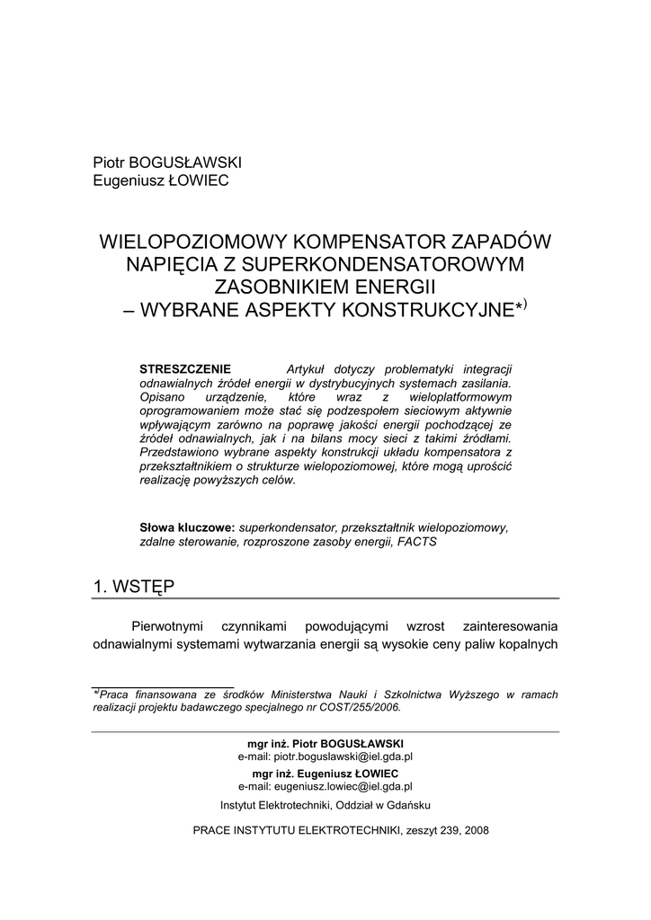 Piotr BOGUSŁAWSKI Eugeniusz ŁOWIEC WIELOPOZIOMOWY KOMPENSATOR ZAPADÓW NAPIĘCIA Z SUPERKONDENSATOROWYM ZASOBNIKIEM ENERGII – WYBRANE ASPEKTY KONSTRUKCYJNE*) STRESZCZENIE Artykuł dotyczy problematyki integracji odnawialnych źródeł energii w dystrybucyjnych systemach zasilania. Opisano urządzenie, które wraz z wieloplatformowym oprogramowaniem moŜe stać się podzespołem sieciowym aktywnie wpływającym zarówno na poprawę jakości energii pochodzącej ze źródeł odnawialnych, jak i na bilans mocy sieci z takimi źródłami. Przedstawiono wybrane aspekty konstrukcji układu kompensatora z przekształtnikiem o strukturze wielopoziomowej, które mogą uprościć realizację powyŜszych celów. Słowa kluczowe: superkondensator, przekształtnik wielopoziomowy, zdalne sterowanie, rozproszone zasoby energii, FACTS 1. WSTĘP Pierwotnymi czynnikami powodującymi wzrost zainteresowania odnawialnymi systemami wytwarzania energii są wysokie ceny paliw kopalnych ) * Praca finansowana ze środków Ministerstwa Nauki i Szkolnictwa WyŜszego w ramach realizacji projektu badawczego specjalnego nr COST/255/2006. mgr inŜ. Piotr BOGUSŁAWSKI e-mail: [email protected] mgr inŜ. Eugeniusz ŁOWIEC e-mail: [email protected] Instytut Elektrotechniki, Oddział w Gdańsku PRACE INSTYTUTU ELEKTROTECHNIKI, zeszyt 239, 2008 118 P. Bogusławski, E. Łowiec i obowiązujące umowy międzynarodowe dotyczące wielkości emisji dwutlenku węgla do atmosfery. Wobec procesów związanych z liberalizacją rynków energii i postępami technologii półprzewodnikowych, następuje wzrost zainteresowania automatycznymi systemami zwiększającymi pewność i jakość dostaw energii elektrycznej. Powstawanie elektronicznych systemów pozwalających na udział energii z rozproszonych źródeł odnawialnych (ang. distributed energy resource - DER) jest dalszym przejawem ewolucji energetycznych systemów dystrybucji. Do znaczących źródeł odnawialnych zaliczyć naleŜy przede wszystkim energię wiatru i słońca oraz zdobywające coraz większą popularność układy kogeneracyjne z turbinami gazowymi (ang. Combined Heat and Power - CHP), a takŜe ogniwa paliwowe [1]. Z punktu widzenia energetyki zawodowej źródła tego typu cechują się jednak niską jakością i mniejszą pewnością dostawy energii, jak i niekorzystną geograficznie lokalizacją generacji. W konsekwencji postęp technologiczny w pozyskiwaniu energii z tych źródeł i ich praktyczne wykorzystanie na duŜą skalę, w niektórych krajach zaczęły niekorzystnie wpływać na systemy dystrybucji energii, dotąd strukturalnie nie przystosowane do obsługi tak znaczących, dwukierunkowych przepływów mocy. Negatywne zjawiska w tych sieciach uwidoczniły się juŜ w krajach rozwiniętych technologicznie, zwłaszcza w Danii za sprawą znacznego udziału energetyki wiatrowej w bilansie energetycznym tego kraju [2]. PowyŜsze czynniki wpływają na rosnące koszty operatorów systemów dystrybucji (DSO), dotąd wykonujących czynności konfiguracyjne głównie ręcznie. Do czynności tych naleŜą: wpływanie na parametry sieciowe (układy połączeń sieci, wartości napięć), pomiary rozpływów mocy i ich ograniczanie, nastawy zabezpieczeń, ustalanie harmonogramów pracy transformatorów oraz współpraca z innymi operatorami. Obserwacje tendencji rozwojowych mogą skłaniać do wniosku, Ŝe w przyszłości DSO muszą oddać sterowanie sieciami pod „dyktat” znacznej liczby niewielkich dostawców w swoich sieciach, podobnie jak obecnie operatorzy krajowych systemów przesyłowych uczynili to wobec licznych spółek dystrybucyjnych. W USA juŜ uwidoczniły się problemy szeroko pojętej integracji technologicznej rozproszonych źródeł energii ze względu na znaczne róŜnice w standardach energetycznych pomiędzy poszczególnymi stanami. Wg danych w [3] i [4] aktywny udział działań legislacyjnych i ustawowe ułatwienia do rynku energii dla niewielkich producentów w stanie Kalifornia (USA) mają zwiększyć udział solarnych źródeł energii do roku 2017 o 3000 MW mocy zainstalowanej. Wolumeny energii, którymi operuje się na rynku bilansującym ulegają ciągłemu zmniejszaniu, a okresy bilansowania są skracane. TakŜe procedury Wielopoziomowy kompensator zapadów napięcia z superkondensatorowym … 119 „dostępu do rynku” stają się coraz prostsze [5]. Wobec większej dostępności, np. technologii fotowoltaicznych, rosnąć będą moce produkcyjne źródeł zainstalowanych w sieciach odbiorczych a drobni producenci będą mieli coraz większe szanse na dołączanie do rynku energii. 2. KOMPENSATOR TYPU OFF-LINE JAKO DER Obecnie w wielu lokalnych systemach energetycznych rozwaŜa się moŜliwość pracy wyspowej. Wynika to z konieczności zabezpieczenia się przed katastrofalnymi skutkami awarii systemowej (tzw. blackout). Energia magazynu opisywanego urządzenia kompensacyjnego uzupełniana jest z zewnętrznej sieci energetycznej lub z lokalnego źródła generacyjnego (odnawialnego). W tym ostatnim przypadku kompensator moŜna traktować jako element typu DER, a ten fragment sieci określić jako „microgrid” - zespół źródeł i odbiorów energii połączonych z większą siecią (macrogrid) lecz mogących pracować niezaleŜnie od niej. Wobec powyŜszego kompensator moŜe stać się dla takiej sieci elementem aktywnie wpływającym na niezawodność [6]. Zarządzanie takim podsystemem i złoŜoność obliczeniowa regulatorów wymaga rozbudowanej nadrzędnej infrastruktury sterowania. Podstawowym zadaniem kompensatora zapadów napięcia typu off-line (lub line-interactive) jest uzupełnianie niedoborów mocy czynnej i biernej w wydzielonym obszarze sieci dystrybucyjnej energią pochodzącą z własnego magazynu (rys.1a). Kompensator zlokalizowany jest w sieci o topologii promieniowej (sieć nn lub SN) i oddzielony od punktu wspólnego przyłączenia systemu energetycznego (ang. Point of Common Coupling - PCC) przez odł