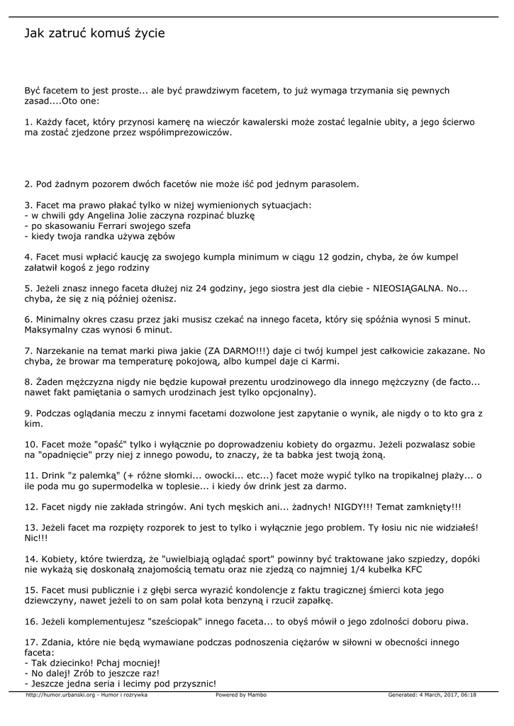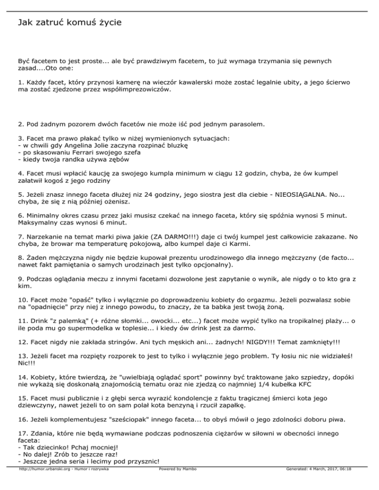 Jak zatruć komuś życie Być facetem to jest proste... ale być prawdziwym facetem, to już wymaga trzymania się pewnych zasad....Oto one: 1. Każdy facet, który przynosi kamerę na wieczór kawalerski może zostać legalnie ubity, a jego ścierwo ma zostać zjedzone przez współimprezowiczów. 2. Pod żadnym pozorem dwóch facetów nie może iść pod jednym parasolem. 3. Facet ma prawo płakać tylko w niżej wymienionych sytuacjach: - w chwili gdy Angelina Jolie zaczyna rozpinać bluzkę - po skasowaniu Ferrari swojego szefa - kiedy twoja randka używa zębów 4. Facet musi wpłacić kaucję za swojego kumpla minimum w ciągu 12 godzin, chyba, że ów kumpel załatwił kogoś z jego rodziny 5. Jeżeli znasz innego faceta dłużej niz 24 godziny, jego siostra jest dla ciebie - NIEOSIĄGALNA. No... chyba, że się z nią później ożenisz. 6. Minimalny okres czasu przez jaki musisz czekać na innego faceta, który się spóźnia wynosi 5 minut. Maksymalny czas wynosi 6 minut. 7. Narzekanie na temat marki piwa jakie (ZA DARMO!!!) daje ci twój kumpel jest całkowicie zakazane. No chyba, że browar ma temperaturę pokojową, albo kumpel daje ci Karmi. 8. Żaden mężczyzna nigdy nie będzie kupował prezentu urodzinowego dla innego mężczyzny (de facto... nawet fakt pamiętania o samych urodzinach jest tylko opcjonalny). 9. Podczas oglądania meczu z innymi facetami dozwolone jest zapytanie o wynik, ale nigdy o to kto gra z kim. 10. Facet może "opaść" tylko i wyłącznie po doprowadzeniu kobiety do orgazmu. Jeżeli pozwalasz sobie na "opadnięcie" przy niej z innego powodu, to znaczy, że ta babka jest twoją żoną. 11. Drink "z palemką" (+ różne słomki... owocki... etc...) facet może wypić tylko na tropikalnej plaży... o ile poda mu go supermodelka w toplesie... i kiedy ów drink jest za darmo. 12. Facet nigdy nie zakłada stringów. Ani tych męskich ani... żadnych! NIGDY!!! Temat zamknięty!!! 13. Jeżeli facet ma rozpięty rozporek to jest to tylko i wyłącznie jego problem. Ty łosiu nic nie widziałeś! Nic!!! 14. Kobiety, które twierdzą, że "uwielbiają oglądać sport" powinny być traktowane jako szpiedzy, dopóki nie wykażą się doskonałą znajomością tematu oraz nie zjedzą co najmniej 1/4 kubełka KFC 15. Facet musi publicznie i z głębi serca wyrazić kondolencje z faktu tragicznej śmierci kota jego dziewczyny, nawet jeżeli to on sam polał kota benzyną i rzucił zapałkę. 16. Jeżeli komplementujesz "sześciopak" innego faceta... to obyś mówił o jego zdolności doboru piwa. 17. Zdania, które nie będą wymawiane podczas podnoszenia ciężarów w siłowni w obecności innego faceta: - Tak dziecinko! Pchaj mocniej! - No dalej! Zrób to jeszcze raz! - Jeszcze jedna seria i lecimy pod przysznic! http://humor.urbanski.org - Humor i rozrywka Powered by Mambo Generated: 4 March, 2017, 06:18 - Niezły tyłek! Jesteś Koziorożcem? http://humor.urbanski.org - Humor i rozrywka Powered by Mambo Generated: 4 March, 2017, 06:18