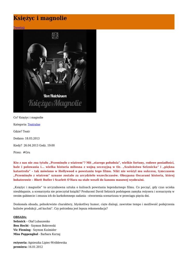 Księżyc i magnolie Tweetnij Co? Księżyc i magnolie Kategoria: Teatralne Gdzie? Teatr Dodano: 18.03.2013 Kiedy? 26.04.2013 Godz. 19:00 Przez: #Gru Kto z nas nie zna tytułu „Przeminęło z wiatrem”? Mit „starego południa”, wielkie fortuny, rodowe posiadłości, bale i polowania i... wielka historia miłosna z wojną secesyjną w tle. „Szaleństwo Selznicka” i „piękna katastrofa” – tak mówiono w Hollywood o powstaniu tego filmu. Nikt nie wróżył mu sukcesu, tymczasem „Przeminęło z wiatrem” uznane zostało za arcydzieło wszechczasów. Obsypana Oscarami historia, której bohaterowie – Rhett Butler i Scarlett O’Hara na stałe weszli do kanonu masowej wyobraźni. „Księżyc i magnolie” to arcyzabawna sztuka o kulisach powstania legendarnego filmu. Co począć, gdy czas ucieka nieubłaganie, a scenarzysta nie przeczytał książki? Producent David Selznick podstępem zamyka reżysera i scenarzystę w swoim gabinecie i zmusza ich do karkołomnego zadania - stworzenia scenariusza w przeciągu pięciu dni. Doskonała obsada, pełnokrwiste charaktery, błyskotliwy humor, cięte dialogi, zawrotne tempo i możliwość podejrzenia kulisów produkcji „od kuchni”. Czy potrzebna jest lepsza rekomendacja? OBSADA: Selznick – Olaf Lubaszenko Ben Hecht - Szymon Bobrowski Vic Fleming - Szymon Kuśmider Miss Poppenghul - Barbara Kurzaj reżyseria: Agnieszka Lipiec-Wróblewska premiera: 16.01.2012 czas trwania: 130 minut (z przerwą) STRONA SPEKTAKLU www.scenastu.com.pl Data 27/03/2013 Oceń brak głosów