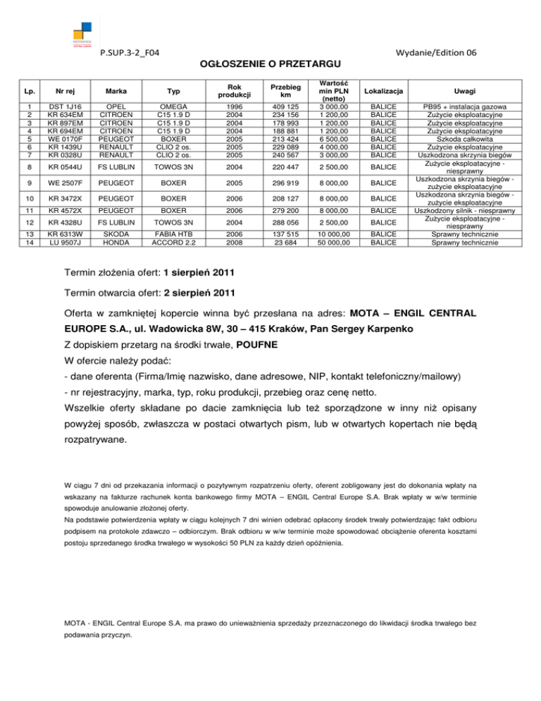 P.SUP.3-2_F04 Wydanie/Edition 06 OGŁOSZENIE O PRZETARGU Lp. Nr rej Marka Typ Rok produkcji Przebieg km 1 2 3 4 5 6 7 DST 1J16 KR 634EM KR 897EM KR 694EM WE 0170F KR 1439U KR 0328U OPEL CITROEN CITROEN CITROEN PEUGEOT RENAULT RENAULT OMEGA C15 1.9 D C15 1.9 D C15 1.9 D BOXER CLIO 2 os. CLIO 2 os. 1996 2004 2004 2004 2005 2005 2005 409 125 234 156 178 993 188 881 213 424 229 089 240 567 Wartość min PLN (netto) 3 000,00 1 200,00 1 200,00 1 200,00 6 500,00 4 000,00 3 000,00 8 KR 0544U FS LUBLIN TOWOS 3N 2004 220 447 2 500,00 BALICE 9 WE 2507F PEUGEOT BOXER 2005 296 919 8 000,00 BALICE 10 KR 3472X PEUGEOT BOXER 2006 208 127 8 000,00 BALICE Lokalizacja Uwagi BALICE BALICE BALICE BALICE BALICE BALICE BALICE PB95 + instalacja gazowa Zużycie eksploatacyjne Zużycie eksploatacyjne Zużycie eksploatacyjne Szkoda całkowita Zużycie eksploatacyjne Uszkodzona skrzynia biegów Zużycie eksploatacyjne niesprawny Uszkodzona skrzynia biegów zużycie eksploatacyjne Uszkodzona skrzynia biegów zużycie eksploatacyjne Uszkodzony silnik - niesprawny Zużycie eksploatacyjne niesprawny Sprawny technicznie Sprawny technicznie 11 KR 4572X PEUGEOT BOXER 2006 279 200 8 000,00 BALICE 12 KR 4328U FS LUBLIN TOWOS 3N 2004 288 056 2 500,00 BALICE 13 14 KR 6313W LU 9507J SKODA HONDA FABIA HTB ACCORD 2.2 2006 2008 137 515 23 684 10 000,00 50 000,00 BALICE BALICE Termin złożenia ofert: 1 sierpień 2011 Termin otwarcia ofert: 2 sierpień 2011 Oferta w zamkniętej kopercie winna być przesłana na adres: MOTA – ENGIL CENTRAL EUROPE S.A., ul. Wadowicka 8W, 30 – 415 Kraków, Pan Sergey Karpenko Z dopiskiem przetarg na środki trwałe, POUFNE W ofercie należy podać: - dane oferenta (Firma/Imię nazwisko, dane adresowe, NIP, kontakt telefoniczny/mailowy) - nr rejestracyjny, marka, typ, roku produkcji, przebieg oraz cenę netto. Wszelkie oferty składane po dacie zamknięcia lub też sporządzone w inny niż opisany powyżej sposób, zwłaszcza w postaci otwartych pism, lub w otwartych kopertach nie będą rozpatrywane. W ciągu 7 dni od przekazania informacji o pozytywnym rozpatrzeniu oferty, oferent zobligowany jest do dokonania wpłaty na wskazany na fakturze rachunek konta bankowego firmy MOTA – ENGIL Central Europe S.A. Brak wpłaty w w/w terminie spowoduje anulowanie złożonej oferty. Na podstawie potwierdzenia wpłaty w ciągu kolejnych 7 dni winien odebrać opłacony środek trwały potwierdzając fakt odbioru podpisem na protokole zdawczo – odbiorczym. Brak odbioru w w/w terminie może spowodować obciążenie oferenta kosztami postoju sprzedanego środka trwałego w wysokości 50 PLN za każdy dzień opóźnienia. MOTA - ENGIL Central Europe S.A. ma prawo do unieważnienia sprzedaży przeznaczonego do likwidacji środka trwałego bez podawania przyczyn. P.SUP.3-2_F04 Wydanie/Edition 06 INVITATION TO TENDER Brand Type 1 2 3 4 5 6 7 Registration no. DST 1J16 KR 634EM KR 897EM KR 694EM WE 0170F KR 1439U KR 0328U OPEL CITROEN CITROEN CITROEN PEUGEOT RENAULT RENAULT OMEGA C15 1.9 D C15 1.9 D C15 1.9 D BOXER CLIO 2 os. CLIO 2 os. Year of production 1996 2004 2004 2004 2005 2005 2005 8 KR 0544U FS LUBLIN TOWOS 3N 9 WE 2507F PEUGEOT 10 KR 3472X 11 KR 4572X 12 13 14 Lp. 409 125 234 156 178 993 188 881 213 424 229 089 240 567 Min Value PLN (net) 3 000,00 1 200,00 1 200,00 1 200,00 6 500,00 4 000,00 3 000,00 2004 220 447 2 500,00 BALICE BOXER 2005 296 919 8 000,00 BALICE PEUGEOT BOXER 2006 208 127 8 000,00 BALICE PEUGEOT BOXER 2006 279 200 8 000,00 BALICE KR 4328U FS LUBLIN TOWOS 3N 2004 288 056 2 500,00 BALICE KR 6313W LU 9507J SKODA HONDA FABIA HTB ACCORD 2.2 2006 2008 137 515 23 684 10 000,00 50 000,00 BALICE BALICE Mileage Localization Remarks BALICE BALICE BALICE BALICE BALICE BALICE BALICE PB95 + gas installation Exploitation usage Exploitation usage Exploitation usage Total damage Exploitation usage Damaged gear box Exploitation usage – out of order Damaged gear box – out of order Damaged gear box – out of order Damaged engine – out of order Exploitation usage – out of order Technically efficient Technically efficient Deadline for tender submission: 1st August 2011 Date of tender opening: 2nd August 2011 Tenders should be sent in a closed envelope to the following address: : MOTA – ENGIL CENTRAL EUROPE S.A., ul. Wadowicka 8W, 30 – 415 Kraków, Mr Sergey Karpenko With a note: fixed asset tender, CONFIDENTIAL The tender should include: - data of the tenderer (Company/name, surname, address, Tax Identification Number /NIP/, e-mail address, phone number) - license number, brand, type, year of manufacture, mileage and net price. Any tenders submitted after the close date or prepared in a manner different than specified above, especially in the form of open letters, or in open envelopes, shall not be considered. Within 7 days following the transfer of information on a favorable consideration of the tender, the tenderer is obliged to make a payment to the bank account of MOTA – ENGIL Central Europe S.A. specified in the invoice. Failure to perform the payment in the aforementioned deadline shall result in abrogation of the tender submitted. On the basis of a confirmation of payment, within the next seven days the tenderer should collect the fixed asset for which he/she has paid and confirm this fact placing his/her signature in the protocol of delivery and acceptance. Failure to collect the fixed asset within the aforementioned deadline can result in charging the tenderer with the costs of parking the fixed asset sold amounting to50 PLN for each day of delay. MOTA - ENGIL Central Europe S.A. has the right to cancel the sales of a fixed asset held for liquidation without specifying reasons thereof.