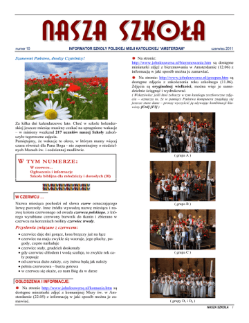 numer 10 INFORMATOR SZKOŁY POLSKIEJ MISJI KATOLICKIEJ *AMSTERDAM* Szanowni Państwo, drodzy Czytelnicy! czerwiec 2011 Na stronie: http://www.johnlouwerse.nl/bierzmowanie.htm są dostępne miniaturki zdjęć z bierzmowania w Amsterdamie (12.06) z informacją w jaki sposób można je zamawiać. Na stronie: http://www.johnlouwerse.nl/groepen.htm są dostępne zdjęcia z zakończenia roku szkolnego (11.06). Zdjęcia są oryginalnej wielkości, można więc je samodzielnie ściągnąć i wydrukować. ( Wskazówka: jeśli ktoś zobaczy w tym katalogu zeszłoroczne zdjęcia – oznacza to, że w pamięci Państwa komputera znajdują się jeszcze stare dane – proszę wyczyścić ją używając kombinacji klawiszy [Ctrl] [F5] ) Za kilka dni kalendarzowe lato. Choć w szkole holenderskiej jeszcze miesiąc musimy czekać na upragnione wakacje – w miniony weekend 217 uczniów naszej Szkoły zakończyło tegoroczne zajęcia. Pamiętajmy, że wakacje to okres, w którym mamy więcej czasu również dla Pana Boga - nie zapominajmy o niedzielnych Mszach św. i codziennej modlitwie. ( grupa A ) W TYM NUMERZE: W czerwcu... Ogłoszenia i informacje Szkoła biblijna dla młodzieży i dorosłych (10) W CZERWCU … Nazwa miesiąca pochodzi od słowa czerw oznaczającego larwę pszczoły. Inne źródła wywodzą nazwę miesiąca i nazwę koloru czerwonego od owada czerwca polskiego, z którego wyrabiano czerwony barwnik do tkanin i zbierano w czerwcu na korzeniach rośliny czerwiec trwały. ( grupa B ) Przysłowia związane z czerwcem: czerwiec daje dni gorące, kosa brzęczy już na łące czerwiec na maju zwykle się wzoruje, jego pluchy, pogody, często naśladuje czerwiec stały, grudzień doskonały gdy czerwiec chłodem i wodą szafuje, to zwykle rok cały popsuje od czerwca dużo zależy, czy żniwa będą jak należy pełnia czerwcowa – burza gotowa w czerwcu się okaże, co nam Bóg da w darze ( grupa C ) OGŁOSZENIA I INFORMACJE: Na stronie http://www.johnlouwerse.nl/komunia.htm są dostępne miniaturki zdjęć z komunijnej Mszy św. w Amsterdamie (22.05) z informacją w jaki sposób można je zamawiać. ( grupy D1 i D2 ) NASZA SZKOŁA 1 Uroczystość Najświętszego Ciała i Krwi Chrystusa (Boże Ciało) w naszej parafii jest przeniesiona na niedzielę 26 czerwca. Tego też dnia zakończymy Biały Miesiąc dzieci komunijnych. ( grupa E ) Boże Ciało: w Amsterdamie po Mszy św. o godz. 12.00 wyruszy Procesja Eucharystyczna dookoła kościoła. Dzieci pierwszokomunijne (i nie tylko) zapraszamy do sypania kwiatów przed Panem Jezusem by w ten sposób oddać Jemu cześć. Prośba do mam – aby na ten dzień przygotować płatki kwiatów, koszyczek na szyję i odświętny strój dla dziecka. Naklejki – pamiątki Mszy św. otrzymamy po raz ostatni w tym roku w niedzielę 19 czerwca. 26 czerwca – rozdanie nagród dzieciom, które dzielnie zbierały te pamiątki Mszach świętych. ( grupa F ) ( grupa G ) WAKACYJNY KONKURS FOTOGRAFICZNY: „Jaki piękny świat stworzył Pan Bóg!” Już niedługo wakacje. Zapewne zwiedzimy wiele ciekawych miejsc, zobaczymy po raz kolejny jak piękny jest świat. Ogłaszamy kolejny konkurs dla dzieci: czekamy na zdjęcia, które pokażą jaka piękna może być natura. Nie chodzi o budowle czy ludzi lecz o przyrodę – np. piękna góra, las, wschód słońca czy strumień lub też nieznany nam dotąd ptak. Proszę wybrać najładniejsze zdjęcie „z przyrodą” tegorocznych wakacji i przesłać je na adres szkoły: [email protected]. Na zdjęcia czekamy do końca wakacji czyli do 5 września. Nowy rok szkolny i katechetyczny 2011 / 2012 Dzieci, które w tym roku chodziły do szkoły nie trzeba ponownie zapisywać, są one już naszymi uczniami. ( grupa H ) Jeśli kolejne dziecko z rodziny dorosło już do "wieku szkolnego" (w roku 2011 kończy co najmniej 5 lat) i po wakacjach dołączy do nas – prosimy poinformować o tym PRZED WAKACJAMI (najlepiej mailem na adres szkoły). Rodziców dzieci, które w 2011 r. kończą 5 lat prosimy ( grupa J ) Dzieci pierwszokomunijne przeżywają swój BIAŁY MIESIĄC: w soboty/niedziele i święta do niedzieli 26 czerwca włącznie przyjeżdżają na Msze św. do Amsterdamu czy innych ośrodków naszej Misji w strojach komunijnych – są przygotowane w kościele specjalne miejsca dla nich. Zapraszamy oczywiście również dzieci, które były u I Komunii św. w Polsce. o zapisanie ich do szkoły w terminie do 25 lipca. Można (a nawet trzeba) zapisać dzieci starsze, które dotychczas nie są uczniami naszej szkoły. Ze względów organizacyjnych (podział na grupy, przygotowanie książek i innych materiałów) bardzo prosimy aby zgłaszać nowe dzieci przed wakacjami letnimi. Zapisy nowych uczniów i informacje: - e-mailem na adres Szkoły: [email protected] - formularze można pobrać u ks. Krzysztofa po Mszach św. we wszystkich ośrodkach Pierwsze zajęcia w nowym roku szkolnym w sobotę 10 września o godz. 1500. W okresie wakacji nie będzie sobotnich Mszy św. w Amsterdamie. Najbliższa Msza św. dla dzieci w sobotę 10 września, pamiętajmy jednak, że wakacje to okres, w którym mamy więcej czasu również dla Pana Boga - nie zapominajmy o niedzielnych Mszach św. i codziennej modlitwie. NASZA SZKOŁA 2 SZKOŁA BIBLIJNA Numer 10 Katechezy biblijne dla młodzieży i dorosłych czerwiec 2011 Człowieka bowiem nie można do końca zrozumieć bez Chrystusa. A raczej: człowiek nie może siebie sam do końca zrozumieć bez Chrystusa. Nie może zrozumieć ani kim jest, ani jaka jest jego właściwa godność, ani jakie jest jego powołanie i ostateczne przeznaczenie. Nie może tego wszystkiego zrozumieć bez Chrystusa. (Jan Paweł II - Warszawa 1979) I bez Chrystusa nie zrozumiemy Ewangelii ... Bez Niego nie zrozumiemy tych Ksiąg - jak nam się wydaje - najbardziej nam znanych, do których przyzwyczailiśmy się, na które niejako już "uodporniliśmy się". Bez połączenia z osobą Chrystusa prawdy wiary zawart