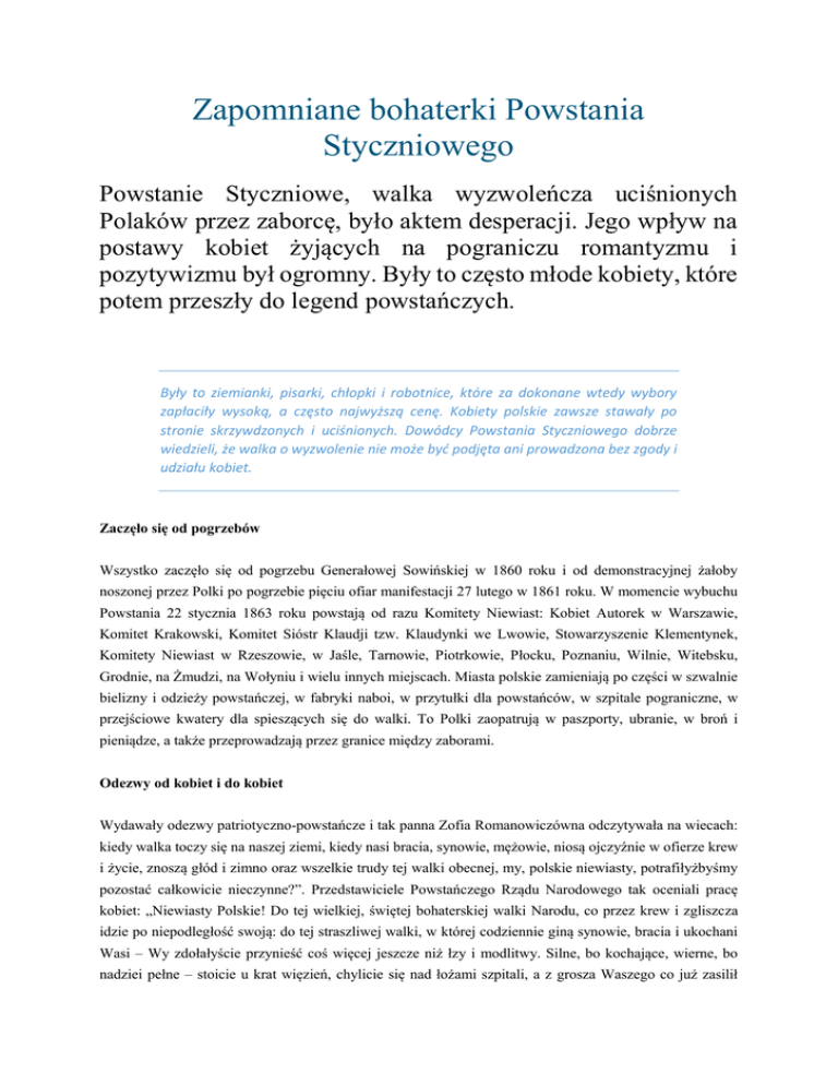Zapomniane bohaterki Powstania Styczniowego Powstanie Styczniowe, walka wyzwoleńcza uciśnionych Polaków przez zaborcę, było aktem desperacji. Jego wpływ na postawy kobiet żyjących na pograniczu romantyzmu i pozytywizmu był ogromny. Były to często młode kobiety, które potem przeszły do legend powstańczych. Były to ziemianki, pisarki, chłopki i robotnice, które za dokonane wtedy wybory zapłaciły wysoką, a często najwyższą cenę. Kobiety polskie zawsze stawały po stronie skrzywdzonych i uciśnionych. Dowódcy Powstania Styczniowego dobrze wiedzieli, że walka o wyzwolenie nie może być podjęta ani prowadzona bez zgody i udziału kobiet. Zaczęło się od pogrzebów Wszystko zaczęło się od pogrzebu Generałowej Sowińskiej w 1860 roku i od demonstracyjnej żałoby noszonej przez Polki po pogrzebie pięciu ofiar manifestacji 27 lutego w 1861 roku. W momencie wybuchu Powstania 22 stycznia 1863 roku powstają od razu Komitety Niewiast: Kobiet Autorek w Warszawie, Komitet Krakowski, Komitet Sióstr Klaudji tzw. Klaudynki we Lwowie, Stowarzyszenie Klementynek, Komitety Niewiast w Rzeszowie, w Jaśle, Tarnowie, Piotrkowie, Płocku, Poznaniu, Wilnie, Witebsku, Grodnie, na Żmudzi, na Wołyniu i wielu innych miejscach. Miasta polskie zamieniają po części w szwalnie bielizny i odzieży powstańczej, w fabryki naboi, w przytułki dla powstańców, w szpitale pograniczne, w przejściowe kwatery dla spieszących się do walki. To Polki zaopatrują w paszporty, ubranie, w broń i pieniądze, a także przeprowadzają przez granice między zaborami. Odezwy od kobiet i do kobiet Wydawały odezwy patriotyczno-powstańcze i tak panna Zofia Romanowiczówna odczytywała na wiecach: kiedy walka toczy się na naszej ziemi, kiedy nasi bracia, synowie, mężowie, niosą ojczyźnie w ofierze krew i życie, znoszą głód i zimno oraz wszelkie trudy tej walki obecnej, my, polskie niewiasty, potrafiłyżbyśmy pozostać całkowicie nieczynne?”. Przedstawiciele Powstańczego Rządu Narodowego tak oceniali pracę kobiet: „Niewiasty Polskie! Do tej wielkiej, świętej bohaterskiej walki Narodu, co przez krew i zgliszcza idzie po niepodległość swoją: do tej straszliwej walki, w której codziennie giną synowie, bracia i ukochani Wasi – Wy zdołałyście przynieść coś więcej jeszcze niż łzy i modlitwy. Silne, bo kochające, wierne, bo nadziei pełne – stoicie u krat więzień, chylicie się nad łożami szpitali, a z grosza Waszego co już zasilił wdowę i sierotę, został jeszcze jeden pieniądz kosztowny, za który kupujecie broń, co ma dać wolność Ojczyźnie naszej. Niewiasty Polskie ! Rząd Narodowy dziękuje Wam za to”. Henryka dzielniejsza niż mężczyźni Na tle kobiecych stowarzyszeń walczą w Powstaniu kobiety-żołnierze na równi z mężczyznami, a często dzielniej niż niejeden mężczyzna. Niezwykle barwną postacią była Henryka Pustowójtówna – córka Polki i carskiego generała, wychowywana przez Babkę Brygidę Kossakowską na tradycjach patriotycznopowstańczych z 1831 roku. Na wieść z odezwy, „że Warszawianie męczeni, więzieni, w końcu rozdarci okropną branką powstali! Rozpacz porwała do boju garstkę przeciwko kolosowi!”. Po tych słowach Henryka zaprawiona już w walce z caratem dąży do oddziału powstańczego w przebraniu męskim jako Michał Smok. Zaopatrzona przez Komitet Niewiast we Lwowie w paszport i dwa pistolety dociera do oddziału Langiewicza. Jest w pierwszym batalionie, w pierwszej kompanii strzelców. Bierze udział czynny w trzech bitwach i wykazuje się wielką odwagą. Nigdy nie skarżyła się na trudne warunki polowe. Wszystkie bitwy przeżyła i z czasem została adiutantem Langiewicza. Co tu ukrywać: Pustowójtówna była pod wielkim urokiem Naczelnika Powstania. Ostatecznie została aresztowana przez Austriaków. Wypuszczona z więzienia chciała wrócić do oddziału, ale odprawiono ją z kwitkiem, mówiąc „wziąć się do igiełki”, bo już swój patriotyzm udowodniła. Do historii przeszła fotografia dziewczyny w konfederatce na głowie, w szamerowanym kożuszku, z szablą przy boku i pistoletem w dłoni. Henryka wyemigrowała do Paryża i tam pracowała na rzecz polskich powstańców-emigrantów. Wzięła czynny udział w Komunie Paryskiej. Obcięła włosy, przywdziała czamarkę Najbardziej tragiczną postacią powstania była Maria Piotrowiczowa z domu Rogolińska. Pochodziła z patriotycznej rodziny ziemiańskiej w okolicach Łodzi. W młodości szkoliła się w sztuce strzelania, jazdy konnej i fechtunku. Przystąpiła do powstania wraz z mężem i częścią służby. Obcięła piękne włosy i przywdziała powstańczą czamarkę. Maria początkowo pełniła służbę pomocniczą, zbierała pieniądze dla oddziału, zajmowała się zakupem broni, żywności i mundurów. Gdy sytuacja militarna się pogorszyła, przeszła do służby liniowej. W czasie bitwy pod Dobrą Maria walczyła do ostatniej chwili, nie ratowała życia, nie szukała ocalenia w ucieczce z pola bitwy. Odrzuciła propozycję rosyjskich oficerów poddania się, uznała bowiem, że taka postawa nie licuje z godnością i honorem Polaka. Wraz z grupą młodzieży broniła mężnie podarowanego przez łódzkie kobiety oddziałowego sztandaru. Okrążona przez kozaków jednego zabiła, drugiego raniła, pod trzecim zabiła konia. Broniła się rewolwerem i kosą. Zginęła porąbana przez kozaków, którzy pastwili się nad jej martwym ciałem bagnetami. Ubranie Marii, całe w strzępach i we krwi, rodzina przechowywała jako cenną relikwię. Maria była w ciąży, później okazało się, że miała urodzić bliźniaczki. Po bitwie Rosjanie zażądali okupu za wydanie ciała Marii i pozwolenie przewiezienia go do dworu. Razem z Marią zginęły trzy walczące u jej boku kobiety: Weronika Wojciechowska (lat 19) – służąca z Byszew, Antonina Wilczyńska (lat 20) – robotnica z Łodzi oraz Katarzyna o nieznanym nazwis