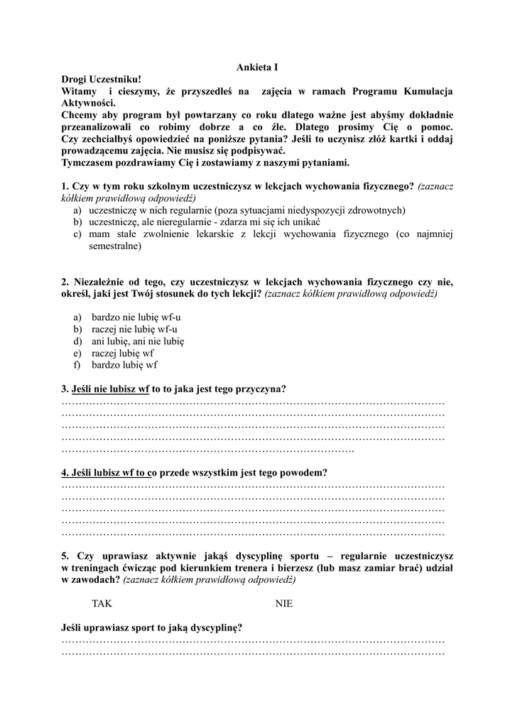 Ankieta I Drogi Uczestniku! Witamy i cieszymy, że przyszedłeś na zajęcia w ramach Programu Kumulacja Aktywności. Chcemy aby program był powtarzany co roku dlatego ważne jest abyśmy dokładnie przeanalizowali co robimy dobrze a co źle. Dlatego prosimy Cię o pomoc. Czy zechciałbyś opowiedzieć na poniższe pytania? Jeśli to uczynisz złóż kartki i oddaj prowadzącemu zajęcia. Nie musisz się podpisywać. Tymczasem pozdrawiamy Cię i zostawiamy z naszymi pytaniami. 1. Czy w tym roku szkolnym uczestniczysz w lekcjach wychowania fizycznego? (zaznacz kółkiem prawidłową odpowiedź) a) uczestniczę w nich regularnie (poza sytuacjami niedyspozycji zdrowotnych) b) uczestniczę, ale nieregularnie - zdarza mi się ich unikać c) mam stałe zwolnienie lekarskie z lekcji wychowania fizycznego (co najmniej semestralne) 2. Niezależnie od tego, czy uczestniczysz w lekcjach wychowania fizycznego czy nie, określ, jaki jest Twój stosunek do tych lekcji? (zaznacz kółkiem prawidłową odpowiedź) a) b) d) e) f) bardzo nie lubię wf-u raczej nie lubię wf-u ani lubię, ani nie lubię raczej lubię wf bardzo lubię wf 3. Jeśli nie lubisz wf to to jaka jest tego przyczyna? ………………………………………………………………………………………………… ………………………………………………………………………………………………… ………………………………………………………………………………………………… ………………………………………………………………………………………………… …………………………………………………………………………. 4. Jeśli lubisz wf to co przede wszystkim jest tego powodem? ………………………………………………………………………………………………… ………………………………………………………………………………………………… ………………………………………………………………………………………………… ………………………………………………………………………………………………… ………………………………………………………………………………………………… 5. Czy uprawiasz aktywnie jakąś dyscyplinę sportu – regularnie uczestniczysz w treningach ćwicząc pod kierunkiem trenera i bierzesz (lub masz zamiar brać) udział w zawodach? (zaznacz kółkiem prawidłową odpowiedź) TAK NIE Jeśli uprawiasz sport to jaką dyscyplinę? ………………………………………………………………………………………………… ………………………………………………………………………………………………… 6. Czy uczestniczysz w jakichś innych (poza tym programem) zorganizowanych, odbywających się pod kierunkiem instruktora, pozalekcyjnych zajęciach o charakterze sportowym lub rekreacyjnym? (np. siłownia, taniec, aerobic, joga itp.)? (zaznacz kółkiem prawidłową odpowiedź) TAK NIE 7. Jeśli uczestniczysz to w jakiego rodzaju zajęciach? ………………………………………………………………………………………………… ………………………………………………………………………………………………… 8. Czy po szkole lub w weekendy spędzasz aktywnie czas we własnym zakresie (jazda na rowerze, jogging, pływanie, narty itp.)? (zaznacz kółkiem prawidłową odpowiedź) TAK NIE 9. Jaki rodzaj aktywności uprawiasz? ………………………………………………………………………………………………… ………………………………………………………………………………………………… 10. Jeśli podejmujesz jakąś aktywność fizyczną to jak często to robisz? (napisz ile razy w tygodniu lub miesiącu) …………………………………………………………………………………………………. …………………………………………………………………………………………………. 11. Dlaczego nie podejmujesz w czasie wolnym żadnej aktywności sportowej? Wymień najważniejsze przyczyny: ………………………………………………………………………………………………… ………………………………………………………………………………………………… ………………………………………………………………………………………………… ………………………………………………………………………………………………… …………………………………………………….. 12. Czy: twoja mama lub ojciec (lub oboje) uprawiali wyczynowo sport? (zaznacz kółkiem prawidłową odpowiedź) TAK NIE 13. Czy twoja mama lub ojciec (lub oboje) biorą obecnie udział w zajęciach sportowych bądź rekreacyjnych pod kierunkiem instruktora? (zaznacz kółkiem prawidłową odpowiedź) TAK NIE 14. Czy twoja mama lub ojciec (lub oboje) spędzają aktywnie czas we własnym zakresie (jazda na rowerze, jogging, pływanie, narty itp.)? (zaznacz kółkiem prawidłową odpowiedź) TAK NIE 15. Przypomnij sobie czas , kiedy miałe(a)ś około 5 – 8 lat. Czy zdarzało się wówczas, że rodzice (oboje lub jedno z nich) towarzyszyli Ci podczas jakiejś aktywności sportowej, np. gra w piłkę, jazda na rowerze, bieganie, jazda na łyżwach itp., robiąc to razem z Tobą, albo ucząc Cię tego? Jak często robili? (zaznacz kółkiem prawidłową odpowiedź) a) b) c) d) e) f) g) h) bardzo często dość często od czasu do czasu dość rzadko sporadycznie nigdy trudno powiedzieć, nie pamiętam nie dotyczy 16. A czy zdarza ci się obecnie podejmować jakąś aktywność sportową np. gra w piłkę, jeździć na rowerze, biega, jeździć na 
