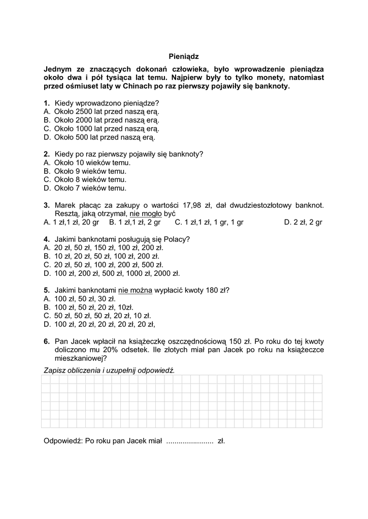 Pieniądz Jednym ze znaczących dokonań człowieka, było wprowadzenie pieniądza około dwa i pół tysiąca lat temu. Najpierw były to tylko monety, natomiast przed ośmiuset laty w Chinach po raz pierwszy pojawiły się banknoty. 1. A. B. C. D. Kiedy wprowadzono pieniądze? Około 2500 lat przed naszą erą. Około 2000 lat przed naszą erą. Około 1000 lat przed naszą erą. Około 500 lat przed naszą erą. 2. A. B. C. D. Kiedy po raz pierwszy pojawiły się banknoty? Około 10 wieków temu. Około 9 wieków temu. Około 8 wieków temu. Około 7 wieków temu. 3. Marek płacąc za zakupy o wartości 17,98 zł, dał dwudziestozłotowy banknot. Resztą, jaką otrzymał, nie mogło być A. 1 zł,1 zł, 20 gr B. 1 zł,1 zł, 2 gr C. 1 zł,1 zł, 1 gr, 1 gr D. 2 zł, 2 gr 4. A. B. C. D. Jakimi banknotami posługują się Polacy? 20 zł, 50 zł, 150 zł, 100 zł, 200 zł. 10 zł, 20 zł, 50 zł, 100 zł, 200 zł. 20 zł, 50 zł, 100 zł, 200 zł, 500 zł. 100 zł, 200 zł, 500 zł, 1000 zł, 2000 zł. 5. A. B. C. D. Jakimi banknotami nie można wypłacić kwoty 180 zł? 100 zł, 50 zł, 30 zł. 100 zł, 50 zł, 20 zł, 10zł. 50 zł, 50 zł, 50 zł, 20 zł, 10 zł. 100 zł, 20 zł, 20 zł, 20 zł, 20 zł, 6. Pan Jacek wpłacił na książeczkę oszczędnościową 150 zł. Po roku do tej kwoty doliczono mu 20% odsetek. Ile złotych miał pan Jacek po roku na książeczce mieszkaniowej? Zapisz obliczenia i uzupełnij odpowiedź. Odpowiedź: Po roku pan Jacek miał ....................... zł. JAK CZĘSTO KORZYSTAMY Z BANKOMATU W SKLEPIE MARS W KOKOTOWIE? 30 25 B Ó20 S O15 A B Z 10 C I L 5 0 8.00-10.00 10.00-12.00 12.00-14.00 14.00-16.00 16.00-18.00 18.00-20.00 20.00-22.00 PRZEDZIAŁY CZASOWE 22.00-8.00 7. W jakich godzinach ludzie najczęściej korzystają z bankomatu w sklepie Mars? A. 10.00 -12.00 B. 16.00 -18.00 C. 18.00 -20.00 D. 22.00 - 4.00 8. Ile osób w godzinach 12.00 – 20.00 korzystało z bankomatu w sklepie Mars? A. 70 osób. B. 77 osób. C. 85 osób. D. 92 osoby. 9. Co ile minut średnio w godzinach od 8.00 do 16.00 pojawia się klient bankomatu w sklepie Mars? A. Średnio co 11 minut. B. Średnio co 12 minut. C. Średnio co 13 minut. D. Średnio co 14 minut. 10. Jaki procent wszystkich klientów bankomatu w sklepie Mars stanowią osoby korzystające z niego w godzinach od 16.00 do 18.00? Zapisz obliczenia i uzupełnij odpowiedź. Odpowiedź: Osoby korzystające z bankomatu w godzinach od 16.00 do 18.00 stanowią ........... % wszystkich klientów tego bankomatu.