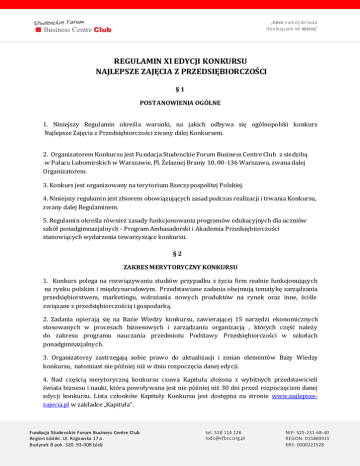 „Jutro należy do ludzi dzia łających od dzisiaj" REGULAMIN XI EDYCJI KONKURSU NAJLEPSZE ZAJĘCIA Z PRZEDSIĘBIORCZOŚCI §1 POSTANOWIENIA OGÓLNE 1. Niniejszy Regulamin określa warunki, na jakich odbywa się ogólnopolski konkurs Najlepsze Zajęcia z Przedsiębiorczości zwany dalej Konkursem. 2. Organizatorem Konkursu jest Fundacja Studenckie Forum Business Centre Club z siedzibą w Pałacu Lubomirskich w Warszawie, Pl. Żelaznej Bramy 10, 00-136 Warszawa, zwana dalej Organizatorem. 3. Konkurs jest organizowany na terytorium Rzeczypospolitej Polskiej. 4. Niniejszy regulamin jest zbiorem obowiązujących zasad podczas realizacji i trwania Konkursu, zwany dalej Regulaminem. 5. Regulamin określa również zasady funkcjonowania programów edukacyjnych dla uczniów szkół ponadgimnazjalnych - Program Ambasadorski i Akademia Przedsiębiorczości stanowiących wydarzenia towarzyszące konkursu. §2 ZAKRES MERYTORYCZNY KONKURSU 1. Konkurs polega na rozwiązywaniu studiów przypadku z życia firm realnie funkcjonujących na rynku polskim i międzynarodowym. Przedstawiane zadania obejmują tematykę zarządzania przedsiębiorstwem, marketingu, wdrażania nowych produktów na rynek oraz inne, ściśle związane z przedsiębiorczością i gospodarką. 2. Zadania opierają się na Bazie Wiedzy konkursu, zawierającej 15 narzędzi ekonomicznych stosowanych w procesach biznesowych i zarządzaniu organizacją , których część należy do zakresu programu nauczania przedmiotu Podstawy Przedsiębiorczości w szkołach ponadgimnazjalnych. 3. Organizatorzy zastrzegają sobie prawo do aktualizacji i zmian elementów Bazy Wiedzy konkursu, natomiast nie później niż w dniu rozpoczęcia danej edycji. 4. Nad częścią merytoryczną konkursu czuwa Kapituła złożona z wybitnych przedstawicieli świata biznesu i nauki, która powoływana jest nie później niż 30 dni przed rozpoczęciem danej edycji konkursu. Lista członków Kapituły Konkursu jest dostępna na stronie www.najlepszezajecia.pl w zakładce „Kapituła”. Fundacja Studenckie Forum Business Centre Club Region Łódzki . Ul . Rzgowska 17 a . Budynek B pok. 320. 93-008 Łódź tel . 518 114 126 [email protected] NIP: 525-231-68-40 REGON: 015869315 KRS: 0000221528 „Jutro należy do ludzi dzia łających od dzisiaj" §3 UCZESTNICTWO W KONKURSIE 1. W Konkursie mogą wziąć udział uczniowie publicznych i niepublicznych szkół ponadgimnazjalnych (z wyłączeniem szkół dla dorosłych) z ważną legitymacją uczniowską. 2. Do Konkursu mogą zgłaszać się zespoły liczące dokładnie 3 osoby. Każdy zespół musi mieć opiekuna wyznaczonego przez dyrektora szkoły. Ilość możliwych zespołów zgłoszonych z jednej szkoły jest nieograniczona. 3. Udział w konkursie jest bezpłatny. 4. Niedozwolone jest uczestnictwo osób spokrewnionych lub spowinowaconych z osobami zajmującymi się bezpośrednio organizacją Konkursu. W przypadku wykrycia takich powiązań cały zespół zostaje zdyskwalifikowany. 5. Rejestracja uczestników do konkursu odbywa się poprzez formularz zgłoszeniowy publikowany na stronie www.najlepsze-zajecia,pl przed jego rozpoczęciem. §4 PRZEBIEG ORGANIZACJI I POSZCZEGÓLNE ETAPY 1. Konkurs podzielony jest na 3 etapy, będące nierozerwalnymi elementami jego przebiegu: a) Etap I - Rejestracja elektroniczna zespołów. Uczestnicy zebrani w trzyosobowych zespołach wraz z nauczycielem opiekunem pobierają case study na I etap ze strony www.najlepsze-zajecia.pl następne wypełniają formularz zgłoszeniowy dodając jako załącznik rozwiązanie zadanie. Kapituła konkursu po wnikliwej ocenie rozwiązań wybiera dla każdego z miast w którym odbywa się konkurs 10 zespołów, które awansują do II Etapu. b) Etap II – Finały Wojewódzkie. 10 zespołów które najlepiej rozwiązało case study na I etap spotyka się w z organizatorami konkursu podczas Finału Wojewódzkiego. Uczniowie podczas Finału poznają nowe case study które rozwiązują. Po dokonaniu rozwiązaniu zadania uczestnicy prezentują swoje pomysły przed Kapitułą Konkursu. Kapituła na podstawie oceny przedstawionych prac i prezentacji zespołów podejmuje decyzje o wyłonieniu zespołów które zajmują III, II i I miejsce w Finale. c) Etap III – Finał Ogólnopolski. Laureaci Finałów Wojewódzkich każdego z miast w którym odbywa się konkurs przyjeżdżają na Finał Ogólnopolski który odbywa się na terenie miasta Łodzi. d) Organizator nie pokrywa kosztów przyjazdu ani noclegu uczestników i opiekunów zespołów na II i III etap Konkursu oraz kosztów powrotu. Fundacja Studenckie Forum Business Centre Club Region Łódzki . Ul . Rzgowska 17 a . Budynek B pok. 320. 93-008 Łódź tel . 518 114 126 [email protected] NIP: 525-231-68-40 REGON: 015869315 KRS: 0000221528 „Jutro należy do ludzi dzia łających od dzisiaj" 2. Wytyczne dotyczące przebiegu Finałów Konkursu – II i III Etap. A. Procedura rozwiązywania finałowego case study a) Na rozwiązywanie case study uczestnicy mają 90 minut. b) Podczas rozwiązywania case study uczestnicy nie mogą korzystać z żadnych pomocy naukowych, w tym Bazy Wiedzy lub innych materiałów. c) Uczestników konkursu obowiązuje zakaz używania telefonów komórkowych podczas Finału. Należy je wyłączyć. d) W otrzymanej kopercie z numerem zespołu uczestnicy otrzymują następujące materiały: a. Case Study b. Kartki do rozwiązania c. Kartki do brudnopisu (nie podlegające ocenie) d. Długopisy e. Kartki do flipchartu f. Flamastry e) Na 15 min przed zakończeniem czasu uczestnicy nanoszą swoje rozwiązania na kartki flipchart. f) Wszystkie materiały znajdujące się w kopercie mają zostać oddane przez uczestników organizatorom po rozwiązaniu case study. B. Procedura prezentacji rozwiązań zespołów a) Na każdą prezentacja każdy zespół ma 5 min. Czas będzie odliczany za pomocą zegara który będzie wyświetlany na ekranach. b) Po prezentacji każdego zespołu odbywa 