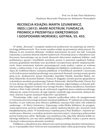 Prof. zw. dr hab. Piotr Mickiewicz Akademia Marynarki Wojennej im. Bohaterów Westerplatte RECENZJA KSIĄŻKI: MARTA SZUNIEWICZ, (RED.).(2015). MARE NOSTRUM, FUNDACJA PROMOCJI PRZEMYSŁU OKRĘTOWEGO I GOSPODARKI MORSKIEJ, GDYNIA, SS. 455. W dziale „Recenzje” czasopism naukowych praktycznie nie pojawiają się omówienia ksiąg jubileuszowych. Tym razem zasadna wydaje się prezentacja takiej pozycji. Publikacja ta jest swoistym ukłonem i hołdem kierowanym do prof. dra hab. Leonarda Łukaszuka, a zarazem zbiorem tekstów naukowych. Prezentuje prace o charakterze analitycznym, koncentrujące się na trzech obszarach aktywności naukowej Jubilata, czyli problematyce sporów i konfliktów morskich, prawie (i prawnych aspektach funkcjonowania gospodarki morskiej) oraz sposobach rozwiązywania sporów międzynarodowych. Samo zestawienie Autorów, prezentujących swoje analizy i opinie na wybrane tematy, a jednocześnie w ten sposób składających Jubilatowi urodzinowe życzenia, zachęca do wnikliwej lektury niniejszej publikacji. O konfliktach morskich i stosowaniu w ich trakcie prawa międzynarodowego oraz prawnych formach rozwiązywania sporów piszą m.in.: profesorowie: Janusz Simonides, Stanisław Pawlak, Stanisław Bieleń, Andrzej Makowski, Krzysztof Kubiak i Dariusz R. Bugajski, kwestie prawno-gospodarcze w kontekście morskim przedstawiają Tadeusz Palmowski, Michał Pluciński, Dorota Pyć (w tym okresie nie tylko profesor UG, ale także minister odpowiadający za kwestie polityki morskiej), Zbigniew Godecki oraz George Penchev. Tadeusz Jasudowicz, Kazimierz Lankosz i Piotr Łaski odnieśli się do wybranych zagadnień prawa międzynarodowego, odnoszą się, często krytycznie, do jego zapisów i praktyki jego stosowania. Jednym słowem, Autorzy to grono uznanych ekspertów i specjalistów. Wymieniając tylko część z grona Autorów podkreślam także ich zaangażowanie w tworzeniu merytorycznego poziomu niniejszej publikacji. W nadaniu jej ostatecznego kształtu, co jest widoczne przy lekturze publikacji, znacząca była także rola redaktora naukowego – dr Marty Szuniewicz. Zapraszając osoby bliskie Jubilatowi do przygotowania opracowań, zarówno zadbała ona o jakość naukową tekstów, jak i stworzył z nich komplementarną całość. W konsekwencji wspólnej pracy Pani Redaktor i Autorów powstała praca zbiorowa o wysokim poziomie merytorycznym i stanowiącą jednocześnie pewną tematyczną całość. Spełniając swą zasadniczą rolę, jaką było złożenia hołdu naukowego Jubilatowi, jest ona także publikacją będącą źródłem wiedzy o prawie morza i formach wykorzystania akwenów morskich. Publikacje o charakterze prac zbiorowych często przyjmują charakter intertematyczny, co w przypadku Mare Nostrum jest uzasadnione także celem jej powstania. Rozwią- 268 Rocznik Bezpieczeństwa Międzynarodowego 2016, vol. 10, nr 1 zanie to zawsze stwarza recenzentowi trudność, gdyż wymaga specyficznego podejścia, uwzględniającego zarówno treść publikacji, jak i jej zbieżność z tytułem oraz zakresem tematyki poruszanym przez wszystkich Autorów. W swojej prezentacji dokonam oceny niniejszej publikacji, dzieląc poszczególne opracowania pod kątem ich tematyki oraz sposobu prezentacji treści, odrywając się od struktury niniejszej publikacji. Na całość Mare Nostum składa się 19 opracowań obejmujących tematycznie problematykę międzynarodowego prawa morza, międzynarodowego prawa humanitarnego, pokojowego rozstrzygania sporów, bezpieczeństwa morskiego w różnych jego obszarach oraz poszczególnych zagadnień szeroko rozumianej gospodarki morskiej. W publikacji wyróżnić można opracowania o walorach aplikacyjnych, które są krytyczną analizą danego zjawiska (J. Simonides, T. Janusewicz, S. Pawlak, P. Łaski, M. Łaski) oraz opracowania o charakterze poznawczym, równie ciekawe i w sposób dogłębny prezentujące wybrane problemy. W pierwszej części publikacji jubileuszowej niezaprzeczalny walor aplikacyjny ma opracowanie profesora Janusza Simonidesa, który wskazuje na proces gwałtownej rozbudowy potencjału sił morskich Chin i Rosji. Zgadzam się z generalną tezą Autora, iż jest to przejaw rywalizacji z USA, a jedną z jej form jest dążenie do uzyskania możliwości kontroli głównych szlaków globalnej wymiany towarowej. Kontrola tych szlaków jest obecnie jednym z czynników określających międzynarodowy status państwa. Zgadzam się również z oceną J. Symonidesa, że rywalizacja ta zakończyła się (w przypadku ChRL) i zakończy się (w odniesieniu do Rosji) porażką. W tym miejscu chciałbym wskazać – inny niż przytaczane przez Autora – argument. Zasadniczym powodem tej porażki są nie tyle różnice w potencjale i możliwościach finansowych, ile brak baz morskich pozwalających na swobodę działań na wybranych akwenach. Chińska koncepcja budowy systemu kontroli szlaków na Pacyfiku rozbiła się nie o możliwości budowy określonych typów okrętów, ale o brak akceptacji państw leżących w pobliżu Cieśniny Malakka i wysp Spratly stałej obecność chińskiej marynarki wojennej (oczywiście powodem była rywalizacja regionalna, jaką toczą państwa regionu). Niemożność ulokowania w tym regionie baz morskich, nawet wobec potencjalnej szansy na ich budowę w państwach północno-wschodniej Afryki i Iranie, spowodowała fiasko polityki poszerzenia strefy kontroli akwenów morskich wokół południowej części Azji kontynentalnej. W odniesieniu do Rosji podkreślić natomiast należy, że państwo to dysponuje potencjałem pozwalającym na kontrolę akwenów arktycznych i Północnego Szlaku Żeglugowego. Natomiast słabością jest brak kontroli „pasa południowego”, czyli Morza Śródziemnego i środkowej części Atlantyku oraz południowej części Pacyfiku. W odróżnieniu od Chin Rosja jednak podjęła trud budowy systemu bazowania, wykorzystując możliwości polityczne. Zapowiedzia