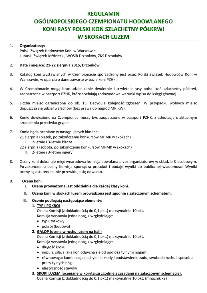 REGULAMIN OGÓLNOPOLSKIEGO CZEMPIONATU HODOWLANEGO KONI RASY POLSKI KOŃ SZLACHETNY PÓŁKRWI W SKOKACH LUZEM 1. Organizatorzy: Polski Związek Hodowców Koni w Warszawie Lubuski Związek Jeździecki, WOSiR Drzonków, ZKS Drzonków 2. Data i miejsce: 21-22 sierpnia 2015, Drzonków. 3. Katalog koni wystawianych w Czempionacie sporządzony jest przez Polski Związek Hodowców Koni w Warszawie, w oparciu o dane zawarte w bazie koni PZHK. 4. W Czempionacie mogą brać udział konie dwuletnie i trzyletnie rasy polski koń szlachetny półkrwi, zaopatrzone w paszport PZHK, które spełniają rodowodowe warunki wpisu do księgi głównej. 5. Liczba miejsc ograniczona do ok. 15. Decyduje kolejność zgłoszeń. W przypadku wolnych miejsc dopuszcza się udział wałachów (bez prawa do nagród MRiRW). 6. Konie dowiezione na Czempionat muszą być zaopatrzone w paszport PZHK, z adnotacją o aktualnym szczepieniu przeciwko grypie. 7. Konie będą oceniane w następujących klasach: 21 sierpnia (piątek, po zakończeniu konkursów MPMK w skokach) I. 2-letnie i 3-letnie klacze 22 sierpnia (sobota, po zakończeniu konkursów MPMK w skokach) II. 2-letnie i 3-letnie ogiery 8. Oceny koni dokonuje międzynarodowa komisja powołana przez organizatorów w składzie 3-osobowym. Po zakończeniu oceny Komisja sporządza protokół i podaje wyniki do publicznej wiadomości. Wyniki oceny są ostateczne, nie przewiduje się odwołań. 9. Ocena koni. I. Ocena prowadzona jest oddzielnie dla każdej klasy koni. II. Ocena koni w skokach luzem prowadzona jest zgodnie z załączonym schematem. III. Ocenie podlegają następujące elementy: 1. TYP I POKRÓJ Ocena Komisji (z dokładnością do 0,1 pkt.) maksymalnie 10 pkt. Komisja wystawia jedna notę, uwzględniając: typ użytkowy pokrój (budowa) 2. GALOP (ocena w ruchu luzem na hali) Ocena Komisji (z dokładnością do 0,1 pkt.) maksymalnie 10 pkt. Komisja wystawia jedną notę, uwzględniając: długość kroku impuls: siła, z jaką koń odpycha się od podłoża tylnymi nogami. równowaga: kombinacja nachylenia kłody i podstawienie zadu, swoboda ruchu i sposobu pracy tylnych nóg. elastyczność stawów 3. SKOKI LUZEM (oceniane w korytarzu zgodnie z zasadami na załączonym schemacie). Ocena Komisji (z dokładnością do 0,1 pkt.) maksymalnie 10 pkt. (mnożnik x2) Komisja wystawia jedną notę uwzględniając: odbicie: kierunek: umiejętność pchnięcia kłębu w górę. szybkość: czas upływający podczas ostatniego foule przed skokiem - czas od dotknięcia wszystkich nóg do podłoża do chwili oderwania się konia od podłoża. technika: przednie nogi: miara ustawienia łopatki w kombinacji z barkiem, przedramieniem, i nadpęciem. grzbiet: stopień w jakim szyja i grzbiet podążają w skoku po łuku, tzw. baskil. zad: stopień w jakim zad otwiera się podczas drugiej fazy skoku. możliwości: umiejętność pchnięcia skoku w górę przy jednoczesnym osiągnięciu kierunku naprzód. elastyczność: miara przebiegu całego skoku (łącznie z lądowaniem), koń powinien być elastyczny w kłodzie. ostrożność: naturalna umiejętność konia do niepopełniania błędów w skoku, koń nie chce zrzucić drąga. IV. Wybór Ogólnopolskich Czempionów koni rasy polski koń szlachetny półkrwi Tytuły przyznawane są oddzielnie dla klaczy oraz ogierów, pod warunkiem, że w klasie zostanie ocenionych co najmniej 6 koni. Tytuł czempiona, a następnie wiceczempiona oraz trzecią i czwartą lokatę otrzymują klacze oraz ogiery, które zdobyły największą liczbę punktów przyznanych za ocenę elementów 1-3 tj. typ użytkowy i pokrój, galop, skoki luzem (mnożnik x 2). W przypadku równej liczby punktów o wyższym miejscu decydują w kolejności: ocena za skoki luzem, ocena za galop, wskazanie komisji. Dla czterech najlepszych ogierów oraz czterech najlepszych klaczy Ministerstwo Rolnictwa i Rozwoju Wsi oraz Polski Związek Hodowców Koni przyznają nagrody pieniężne, odpowiednio w wysokości: 1000 zł za zdobycie tytułu czempiona, 900 zł za zdobycie tytułu wiceczempiona, 800 zł za zdobycie trzeciej lokaty, 700 zł za zdobycie czwartej lokaty, do podziału po 50 % pomiędzy hodowcę i właściciela konia. 10. Organizatorzy Czempionatu nie zwracają kosztów dojazdu, ubezpieczenia koni oraz nie odpowiadają za skradzione mienie oraz ewentualne wypadki i szkody materialne powstałe w czasie transportu koni i w czasie trwania Czempionatu. 11. Zgłoszenia koni przyjmuje Polski Związek Hodowców Koni w Warszawie w nieprzekraczalnym terminie do 6 sierpnia 2015 r. Zgłoszenia prosimy kierować do Pani Alicji Kuśmierczak drogą mailową na adres: [email protected], nr tel. 503 123 654. 12. Potwierdzeniem uczestnictwa w Czempionacie jest wniesienie opłaty za boks w wysokości 300 zł (bez względu na czas pobytu: czwartek – niedziela). Wpłaty należy dokonać w terminie do 14 sierpnia 2015 r. na konto współorganizatora: Polski Związek Hodowców Koni ul. Koszykowa 60/62 m. 16, 00-673 Warszawa Nr 68 1240 6175 1111 0000 4571 0410. Brak wpłaty powoduje nieprzyjęcie konia do udziału w Czempionacie. SCHEMAT PRZEPROWADZANIA PRÓBY SKOKÓW LUZEM 6,0 m KOLEJNOŚĆ PRZBIEGÓW wskazówka 2,8–3,0 m koperta stacjonata max 1,4 m 2.WSKAZÓWKA + KOPERTA + STACJONATA (40–70 cm) + STACJONATA (70–90 cm) – max 2 przebiegi 3.WSKAZÓWKA + KOPERTA + STACJONATA (40–70 cm) + STACJONATA / OKSER / DOUBLEBARRE (max. 140 cm wysokości i 140 cm szerokości) – max 5 przebiegów 6,5–7,2 m 6,8–7,5 m 1. WSKAZÓWKA + KOPERTA + EWENTUALNIE DRĄGI (DESKI) W MIEJSCACH STACJONATY I OKSERA – max. 2 przebiegi Komisja Oceny uwzględniając warunki panujące w miejscu przeprowadzania próby oraz dyspozycję konia w trakcie próby decyduje o: • ilości przebiegów w ramach określonych w punktach 1–3 • ewentualnym dodaniu drągów (desek) w dystansie • gabarytach przeszkód w zakresie określonym w punktach 2–3 • odległościach między przeszkodami w zakresie o