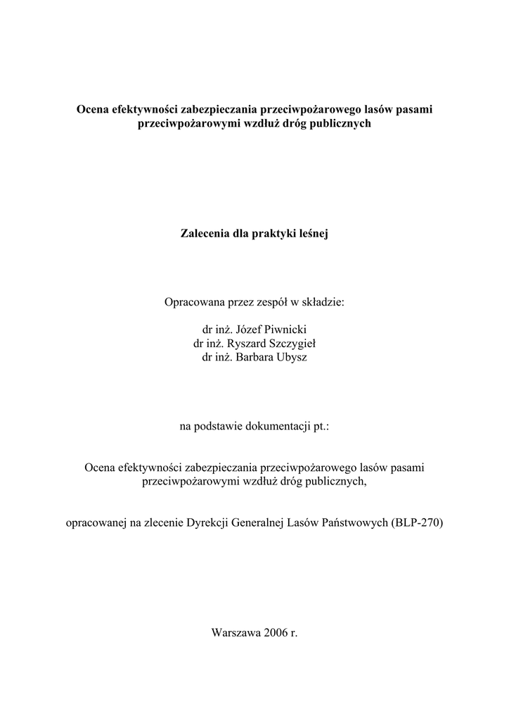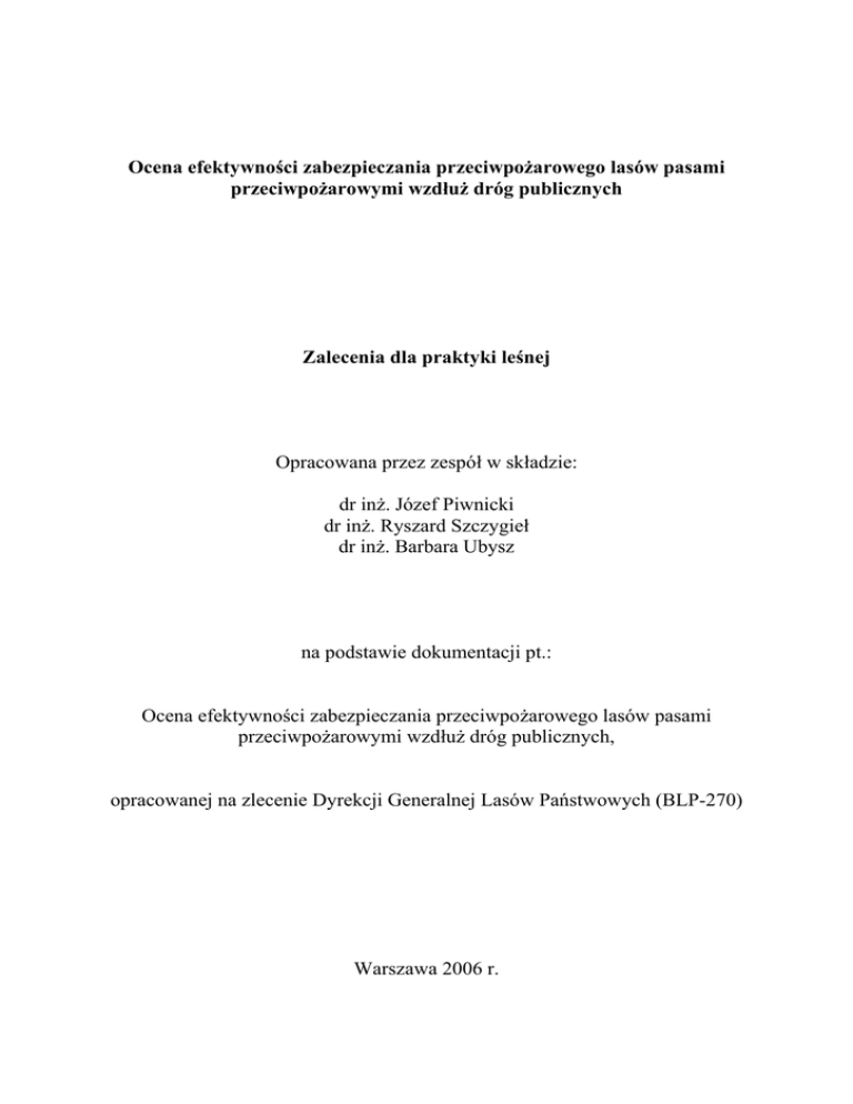 Ocena efektywności zabezpieczania przeciwpożarowego lasów pasami przeciwpożarowymi wzdłuż dróg publicznych Zalecenia dla praktyki leśnej Opracowana przez zespół w składzie: dr inż. Józef Piwnicki dr inż. Ryszard Szczygieł dr inż. Barbara Ubysz na podstawie dokumentacji pt.: Ocena efektywności zabezpieczania przeciwpożarowego lasów pasami przeciwpożarowymi wzdłuż dróg publicznych, opracowanej na zlecenie Dyrekcji Generalnej Lasów Państwowych (BLP-270) Warszawa 2006 r. I. SYNTEZA WSTĘP Wykonywanie pasów przeciwpożarowych ma wieloletnią historię w ochronie przeciwpożarowej lasu, notowaną od początków XX wieku. Zadaniem różnych typów stosowanych pasów przeciwpożarowych, które podlegały modyfikacjom w sposobie ich wykonywania, było i jest przede wszystkim ograniczenie rozprzestrzeniania się ognia w lesie. Pasy tworzy się głównie wzdłuż miejsc, które stwarzają zagrożenie pożarowe dla obszarów leśnych (np. szlaki komunikacyjne kolejowe i drogowe, obiekty zlokalizowane w lesie bądź w ich bezpośrednim sąsiedztwie), zapobiegając w ten sposób przedostaniu się ognia do lasu lub w celu podziału dużych, szczególnie zagrożonych pożarami kompleksów leśnych na mniejsze, ograniczając dzięki temu wielkość spalonej powierzchni i potencjalne straty wskutek pożaru. Ponadto pasy przeciwpożarowe z punktu widzenia taktyki prowadzenia działań gaśniczych stanowią miejsca do tworzenia linii obrony dla jednostek straży pożarnych, a także mogą w niektórych sytuacjach umożliwiać dojazd interweniującym ratownikom. W związku z tym, że wykonywanie i utrzymanie pasów jest kosztowne oraz z powodu zmieniających się uwarunkowań społecznych, dotyczących powstawania pożarów lasu, konieczna jest krytyczna ocena zasadności zakładania pasów przeciwpożarowych. Szczególnie dotyczy to pasów wykonywanych przy drogach publicznych, gdyż według danych statystycznych w zakresie występowania pożarów lasu w latach 1990 – 2004 zaledwie 0,45% wszystkich odnotowanych pożarów w Lasach Państwowych (68 785) powstało wzdłuż nich, obejmując 0,16% łącznej powierzchni spalonej (67 940 ha) w ich wyniku. Dla porównania przy liniach kolejowych powstało 1,8% wszystkich pożarów, a spalona powierzchnia stanowiła aż 23,22% ogólnej powierzchni (pożary na terenie Nadleśnictw Kuźnia Raciborska i Potrzebowice). Średnie roczne straty wskutek pożarów powstałych przy drogach publicznych wyniosły około 50 tysięcy złotych, podczas gdy roczny koszt zakładania nowych i utrzymania wcześniej wykonanych pasów wynosił kilka milionów złotych. Na tak niski poziom strat (w porównaniu z latami sześćdziesiątymi – osiemdziesiątymi) wpływa zdecydowanie: − wyższy stan zaawansowania technologicznego w obecnie konstruowanych pojazdach (mniejsze zagrożenie pożarowe), − duże natężenie ruchu (umożliwiające i ułatwiające szybsze wykrycie pożaru), − dostępność środków łączności, zwłaszcza telefonii komórkowej (sprawniejsze alarmowanie), − większa gęstość sieci drogowej (szybszy dojazd jednostek gaśniczych), 2 − rozbudowanie infrastruktury przeciwpożarowej lasu w Lasach Państwowych, − nowocześniejsze wyposażenie w sprzęt straży pożarnych (większa efektywność prowadzenia akcji ratowniczej). CEL I ZAKRES PRACY Celem pracy było zbadanie zasadności zakładania i skuteczności stosowania pasów przeciwpożarowych przy drogach publicznych oraz zweryfikowanie aktualnych zasad ich wykonywania i utrzymywania. Szczegółowej analizie poddano dane dotyczące tego typu pasów nowo zakładanych i istniejących w Lasach Państwowych w latach 2003 i 2004. W okresie objętym badaniami obowiązujące wówczas przepisy stanowiły, że przy drogach publicznych wykonuje się pas w formie uporządkowanego drzewostanu o szerokości 50 metrów, licząc od skraju lasu, pozbawionego martwych drzew, gałęzi, chrustu nieokrzesanych ściętych drzew oraz pozostałości po wycince drzew, z bruzdą izolacyjną o szerokości 2 metrów, oczyszczoną do warstwy mineralnej, założoną w odległości 2 do 5 metrów od granicy lasu (Rozporządzenie Ministra Ochrony Środowiska, Zasobów Naturalnych i Leśnictwa z dnia 16 sierpnia 1999 r. Dz. U. Nr. 73, poz. 824). Znowelizowane w dniu 16 czerwca 2003 roku Rozporządzenie Ministra Spraw Wewnętrznych i Administracji w sprawie ochrony przeciwpożarowej budynków, innych obiektów budowlanych i terenów ograniczyło wymóg porządkowania drzewostanu do pasa o szerokości 30 metrów. Obowiązek urządzania i utrzymania tych pasów przeciwpożarowych ciążył na właścicielach lub zarządcach lasów położonych przy drogach publicznych. Zwolnieni byli oni z tego obowiązku w wypadku, gdy las zaliczony został do III kategorii zagrożenia pożarowego, a także wówczas, gdy drzewostan był starszy niż 30-letni lub jego szerokość wynosiła mniej niż 200 metrów. Aktualnie obowiązują następujące przepisy regulujące wykonywanie pasów przeciwpożarowych przy drogach publicznych: − Rozporządzenie Ministra Spraw Wewnętrznych i Administracji z dnia 21 kwietnia 2006 r. w sprawie ochrony przeciwpożarowej budynków, innych obiektów budowlanych i terenów (Dz. U. Nr 80, poz. 563), − Rozporządzenie Ministra Środowiska z dnia 22 marca 2006 r. w sprawie szczegółowych zasad zabezpieczenia przeciwpożarowego lasu (Dz. U. Nr 58, poz. 405). W ostatnim z wymienionych rozporządzeń wyróżniono cztery podstawowe rodzaje pasów przeciwpożarowych. Są to: − Pas przeciwpożarowy typu A – oddzielający las od dróg publicznych, dróg dojazdowych niebędących drogami publicznymi, prowadzącymi do zakładu przemysłowego lub magazynowego, obiektów magazynowych i użyteczności publicznej pas gruntu o szerokości 30 m, przyległy do granicy pasa 3 drogowego albo obiektu, pozbawiony martwych drzew, leżących gałęzi i nieokrzesanych ściętych lub powalonych drzew; − Pas 