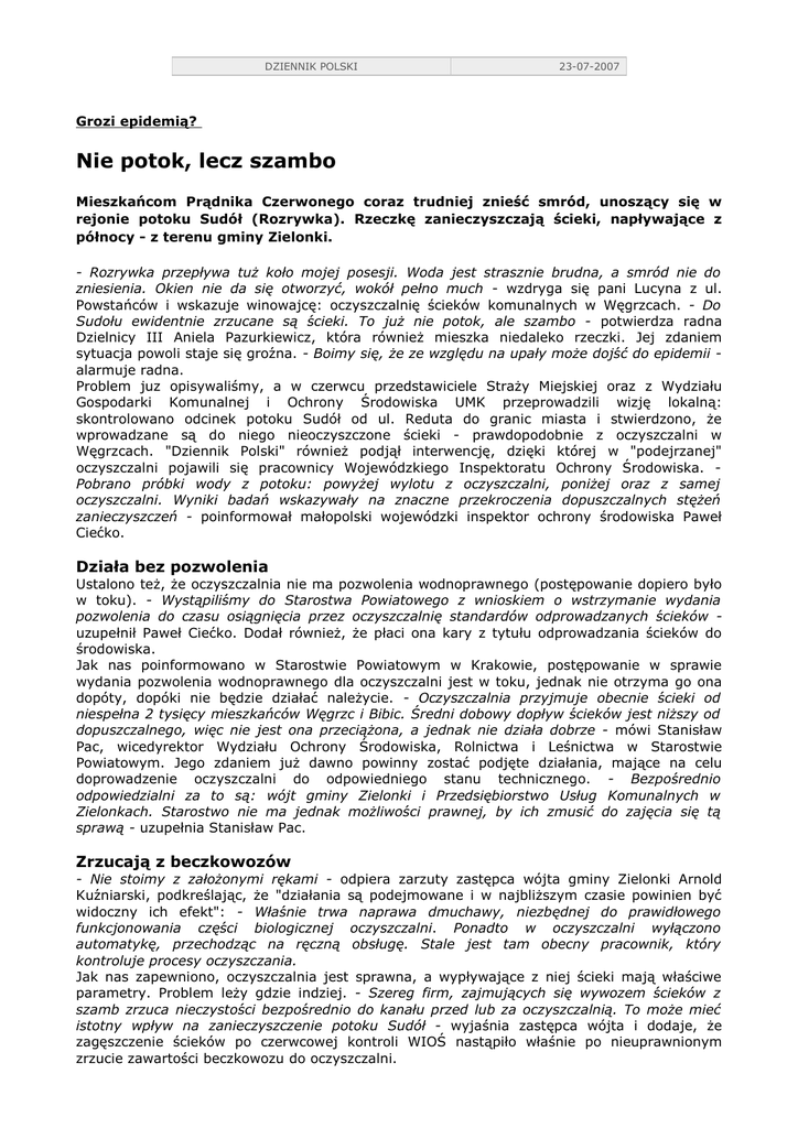 DZIENNIK POLSKI 23-07-2007 Grozi epidemią? Nie potok, lecz szambo Mieszkańcom Prądnika Czerwonego coraz trudniej znieść smród, unoszący się w rejonie potoku Sudół (Rozrywka). Rzeczkę zanieczyszczają ścieki, napływające z północy - z terenu gminy Zielonki. - Rozrywka przepływa tuŜ koło mojej posesji. Woda jest strasznie brudna, a smród nie do zniesienia. Okien nie da się otworzyć, wokół pełno much - wzdryga się pani Lucyna z ul. Powstańców i wskazuje winowajcę: oczyszczalnię ścieków komunalnych w Węgrzcach. - Do Sudołu ewidentnie zrzucane są ścieki. To juŜ nie potok, ale szambo - potwierdza radna Dzielnicy III Aniela Pazurkiewicz, która równieŜ mieszka niedaleko rzeczki. Jej zdaniem sytuacja powoli staje się groźna. - Boimy się, Ŝe ze względu na upały moŜe dojść do epidemii alarmuje radna. Problem juz opisywaliśmy, a w czerwcu przedstawiciele StraŜy Miejskiej oraz z Wydziału Gospodarki Komunalnej i Ochrony Środowiska UMK przeprowadzili wizję lokalną: skontrolowano odcinek potoku Sudół od ul. Reduta do granic miasta i stwierdzono, Ŝe wprowadzane są do niego nieoczyszczone ścieki - prawdopodobnie z oczyszczalni w Węgrzcach. "Dziennik Polski" równieŜ podjął interwencję, dzięki której w "podejrzanej" oczyszczalni pojawili się pracownicy Wojewódzkiego Inspektoratu Ochrony Środowiska. Pobrano próbki wody z potoku: powyŜej wylotu z oczyszczalni, poniŜej oraz z samej oczyszczalni. Wyniki badań wskazywały na znaczne przekroczenia dopuszczalnych stęŜeń zanieczyszczeń - poinformował małopolski wojewódzki inspektor ochrony środowiska Paweł Ciećko. Działa bez pozwolenia Ustalono teŜ, Ŝe oczyszczalnia nie ma pozwolenia wodnoprawnego (postępowanie dopiero było w toku). - Wystąpiliśmy do Starostwa Powiatowego z wnioskiem o wstrzymanie wydania pozwolenia do czasu osiągnięcia przez oczyszczalnię standardów odprowadzanych ścieków uzupełnił Paweł Ciećko. Dodał równieŜ, Ŝe płaci ona kary z tytułu odprowadzania ścieków do środowiska. Jak nas poinformowano w Starostwie Powiatowym w Krakowie, postępowanie w sprawie wydania pozwolenia wodnoprawnego dla oczyszczalni jest w toku, jednak nie otrzyma go ona dopóty, dopóki nie będzie działać naleŜycie. - Oczyszczalnia przyjmuje obecnie ścieki od niespełna 2 tysięcy mieszkańców Węgrzc i Bibic. Średni dobowy dopływ ścieków jest niŜszy od dopuszczalnego, więc nie jest ona przeciąŜona, a jednak nie działa dobrze - mówi Stanisław Pac, wicedyrektor Wydziału Ochrony Środowiska, Rolnictwa i Leśnictwa w Starostwie Powiatowym. Jego zdaniem juŜ dawno powinny zostać podjęte działania, mające na celu doprowadzenie oczyszczalni do odpowiedniego stanu technicznego. - Bezpośrednio odpowiedzialni za to są: wójt gminy Zielonki i Przedsiębiorstwo Usług Komunalnych w Zielonkach. Starostwo nie ma jednak moŜliwości prawnej, by ich zmusić do zajęcia się tą sprawą - uzupełnia Stanisław Pac. Zrzucają z beczkowozów - Nie stoimy z załoŜonymi rękami - odpiera zarzuty zastępca wójta gminy Zielonki Arnold Kuźniarski, podkreślając, Ŝe "działania są podejmowane i w najbliŜszym czasie powinien być widoczny ich efekt": - Właśnie trwa naprawa dmuchawy, niezbędnej do prawidłowego funkcjonowania części biologicznej oczyszczalni. Ponadto w oczyszczalni wyłączono automatykę, przechodząc na ręczną obsługę. Stale jest tam obecny pracownik, który kontroluje procesy oczyszczania. Jak nas zapewniono, oczyszczalnia jest sprawna, a wypływające z niej ścieki mają właściwe parametry. Problem leŜy gdzie indziej. - Szereg firm, zajmujących się wywozem ścieków z szamb zrzuca nieczystości bezpośrednio do kanału przed lub za oczyszczalnią. To moŜe mieć istotny wpływ na zanieczyszczenie potoku Sudół - wyjaśnia zastępca wójta i dodaje, Ŝe zagęszczenie ścieków po czerwcowej kontroli WIOŚ nastąpiło właśnie po nieuprawnionym zrzucie zawartości beczkowozu do oczyszczalni. Kolejny problem, to fakt, Ŝe wody w potoku jest znacznie mniej niŜ przewidują normy, więc trafiające do niego ścieki nie są odpowiednio rozrzedzone. - Z oczyszczalni wychodzą ścieki o właściwych parametrach, ale potem - z powodu zbyt małej ilości wody w potoku - zagęszczają się (następuje wtórna fermentacja) - tłumaczy Arnold Kuźniarski. - Jedyną radą na to są większe opady deszczu. (PSZ)