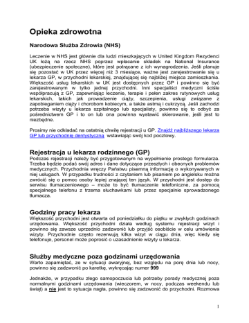Opieka zdrowotna Narodowa Służba Zdrowia (NHS) Leczenie w NHS jest głównie dla ludzi mieszkających w United Kingdom Rezydenci UK łożą na rzecz NHS poprzez wpłacanie składek na National Insurance (ubezpieczenie społeczne), które jest potrącane z ich wynagrodzenia. Jeśli planuje się pozostać w UK przez więcej niż 3 miesiące, ważne jest zarejestrowanie się u lekarza GP, w przychodni lekarskiej, znajdującej się najbliżej miejsca zamieszkania. Większość usług lekarskich w UK jest dostępnych przez GP i powinno się być zarejestrowanym w tylko jednej przychodni. Inni specjaliści medyczni ściśle współpracują z GP, zapewniając leczenie, terapie i pełen zakres rutynowych usług lekarskich, takich jak prowadzenie ciąży, szczepienia, usługi związane z zapobieganiem ciąży i chorobom kobiecym, a także astmą i cukrzycą. Jeśli zachodzi potrzeba wizyty u lekarza szpitalnego lub specjalisty, powinno się to odbyć za pośrednictwem GP i to on lub ona powinna wystawić skierowanie, jeśli jest to niezbędne. Prosimy nie odkładać na ostatnią chwilę rejestracji u GP. Znajdź najbliższego lekarza GP lub przychodnię dentystyczną wstawiając swój kod pocztowy. Rejestracja u lekarza rodzinnego (GP) Podczas rejestracji należy być przygotowanym na wypełnienie prostego formularza. Trzeba będzie podać swój adres i dane dotyczące przeszłych i obecnych problemów medycznych. Przychodnia wręczy Państwu pisemną informację o wykonywanych w niej usługach. W przypadku trudności z czytaniem lub pisaniem po angielsku można zwrócić się o pomoc osoby lepiej znającej ten język. W przychodni jest dostęp do serwisu tłumaczeniowego – może to być tłumaczenie telefoniczne, za pomocą specjalnego telefonu z trzema słuchawkami lub przez specjalnie sprowadzonego tłumacza. Godziny pracy lekarza Większość przychodni jest otwarta od poniedziałku do piątku w zwykłych godzinach urzędowania. Większość przychodni działa według systemu rejestracji wizyt i powinno się zawsze uprzednio zadzwonić lub przyjść osobiście w celu umówienia wizyty. Przychodnie często rezerwują kilka wizyt w ciągu dnia, więc kiedy się telefonuje, personel może poprosić o uzasadnienie wizyty u lekarza. Służby medyczne poza godzinami urzędowania Warto zapamiętać, ze w sytuacji awaryjnej, bez względu na porę dnia lub nocy, powinno się zadzwonić po karetkę, wykręcając numer 999 Jednakże, w przypadku złego samopoczucia lub potrzeby porady medycznej poza normalnymi godzinami urzędowania (wieczorem, w nocy, podczas weekendu lub świąt) a nie jest to sytuacja nagła, powinno się zadzwonić do przychodni. Rozmowa 1 zostanie automatycznie przełączona do serwisu telefonicznego znanego pod nazwą NHS 24. Możemy tam uzyskać szereg rzeczy. Miedzy innymi można telefonicznie otrzymać informacje lub porady od specjalnie przeszkolonej pielęgniarki. W uzasadnionych przypadkach dostanie się skierowanie do lekarza. W przypadku zdolności do poruszania się można zostać poproszonym o udanie się do centrum medycznego, działającego poza godzinami urzędowania. Do szpitala można się udać bez skierowania od swojego GP lub NHS 24 jedynie w wypadkach nagłych. Do NHS 24 można zadzwonić nawet, jeśli nie jesteśmy zarejestrowani w przychodni GP. Wystarczy wykręcić numer dowolnej przychodni. Z serwisem NHS 24 można też połączyć się bezpośrednio dzwoniąc na numer 08454 242424. Dostępna jest tu również usługa telefonicznego tłumaczenia. Prosimy pamiętać: • Jedynie w wypadkach nagłych można się udać do szpitala bez skierowania od swojego GP lub NHS 24. • W przypadku poważnej sytuacji nagłej, wymagającej natychmiastowej reakcji, należy zadzwonić pod 999 i poprosić o ambulans. Apteki i recepty Jeśli potrzebujemy lekarstw GP wypisze nam receptę, którą można zrealizować w miejscowej aptece lub drogerii. Opłata za receptę wynosi £6.65, ale w pewnych okolicznościach możemy być z niej zwolnieni. Pewne lekarstwa można kupić bez recepty po zniżonej cenie i aptekarz powinien nam w tym doradzić. Jest on również przygotowany do udzielenia nam informacji i rad na tematy związane ze zdrowiem. Usługi dentystyczne Dostęp do usług dentystycznych NHS jest w regionie Highland bardzo ograniczony. Adresy dentystów prowadzących praktyki prywatne można znaleźć w książce telefonicznej. Jeśli chcemy umówić się na wizytę do dentysty NHS powinniśmy zadzwonić do Highland Dental Help-line na numer 0845 6442271 w celu zasięgnięcia informacji o dostępności usługi. Dzieci poniżej 16 roku życia uprawnione są do bezpłatnego leczenia i opieki dentystycznej w ramach NHS. Usługi dla rodzin z dziećmi W przypadku posiadania dzieci w wieku poniżej 5 roku życia informacja o tym jest w posiadaniu Pielęgniarki Środowiskowej (Health Visitor) i to ona lub on umawia się na wizyty domowe. Pięlegniarki Środowiskowe są specjalnie przeszkolone do pracy z rodzinami i pomagają im we wszystkich aspektach rozwoju i zdrowia dziecka i całej rodziny. Pielęgniarka Środowiskowa może udzielać informacji dotyczących lokalnych usług zdrowotnych i edukacyjnych. W przypadku dzieci starszych sprawy zdrowotne mogą być omówione z Pielęgniarką Środowiskową lub Pielęgniarkę Szkolną. Ta 2 ostatnia przeprowadza z dzieckiem wywiad, dotyczący zdrowia, zaraz po jego pojawieniu się w szkole po raz pierwszy. Sprawdza również jego kartę szczepień. Jeśli wstępna seria szczepień została ukończona dziecko będzie mogło otrzymać szczepionkę utrwalającą pomiędzy 13 a 18 rokiem życia. Szczepionka BCG jest obecnie podawana dzieciom mieszkającym na terenach o wysokim zagrożeniu gruźlicą oraz tym, których rodzice lub dziadkowie urodzili się w kraju z wysoką liczbą zachorowań. Rodzice zawsze są informowani przez szkołę o wszelkich działaniach dotyczących ich dzieci i muszą oni wyrazić na nie swoja zgodę. Usł